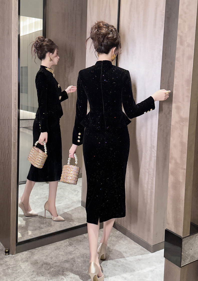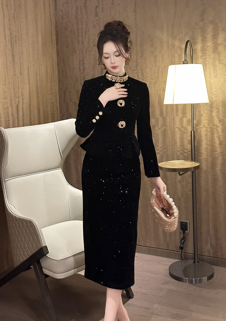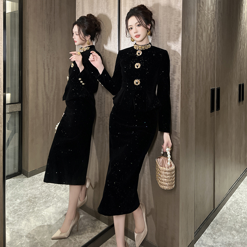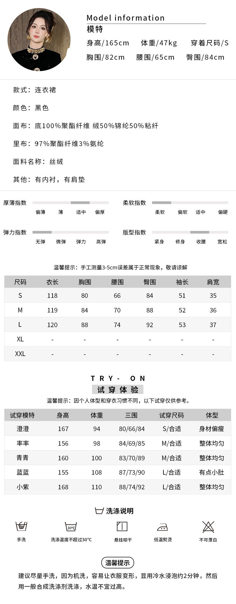 우아한 명사 스타일의 부잣집 딸을 위한 2025 가을 신상 여성용 다이아몬드 장식 라운드넥 슬림핏 원피스 21633스토어 가기