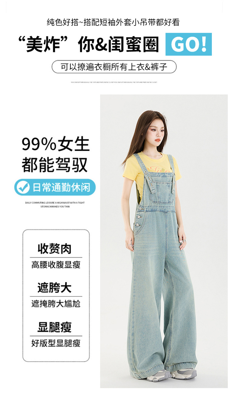 여성용 데님 멜빵바지 여름 2025 신상 루즈핏 레트로 하이웨이스트 스트레이트핏 소녀용 와이드 팬츠 레트로 스타일스토어 가기