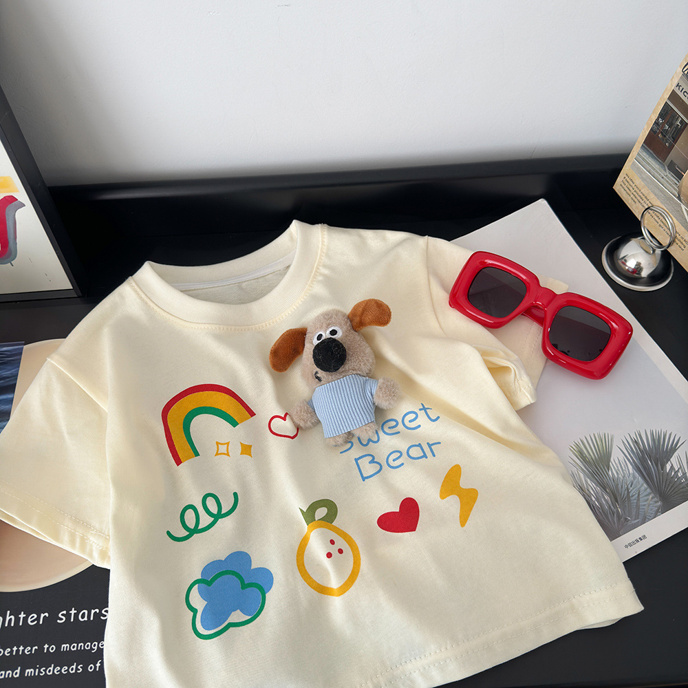 어린이 반팔 티셔츠 소년 소녀 여름 2025 새로운 느슨한 한국식 만화 인형 탑 스타일라인 베이스 셔츠스토어 가기