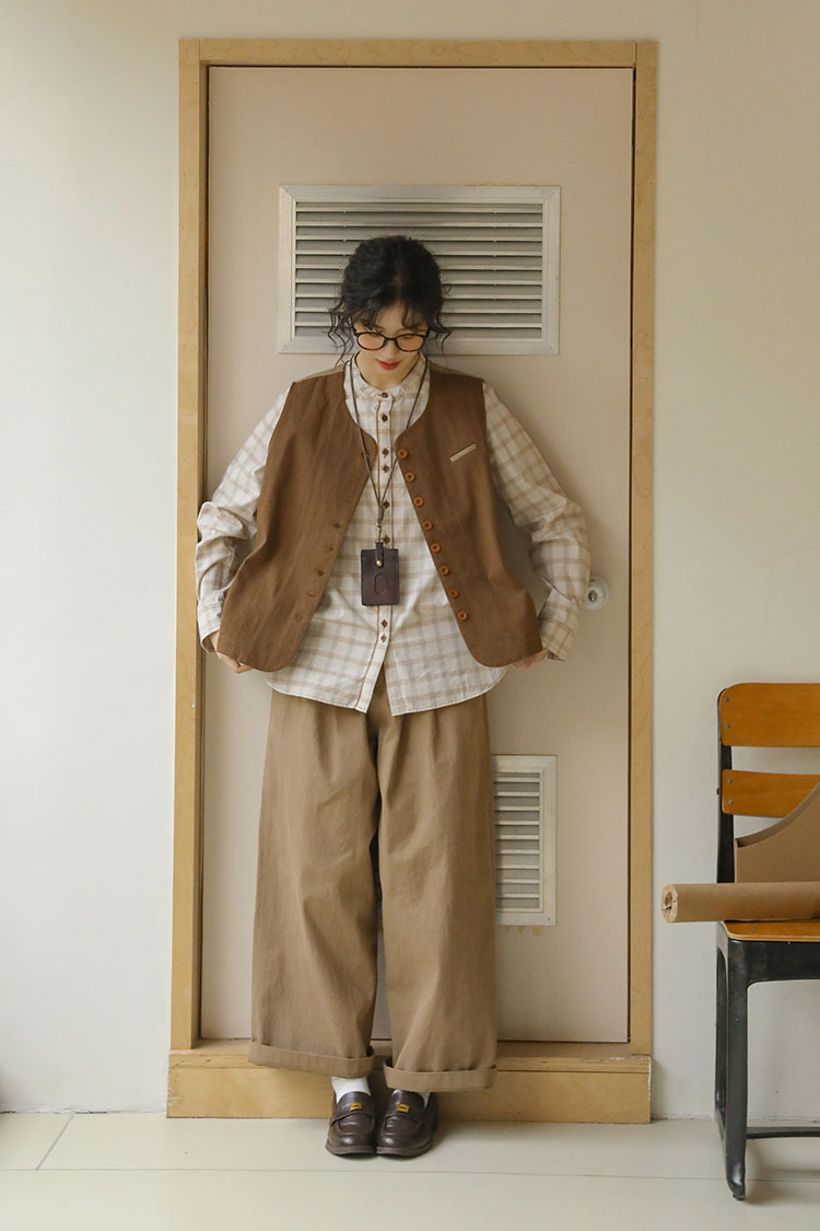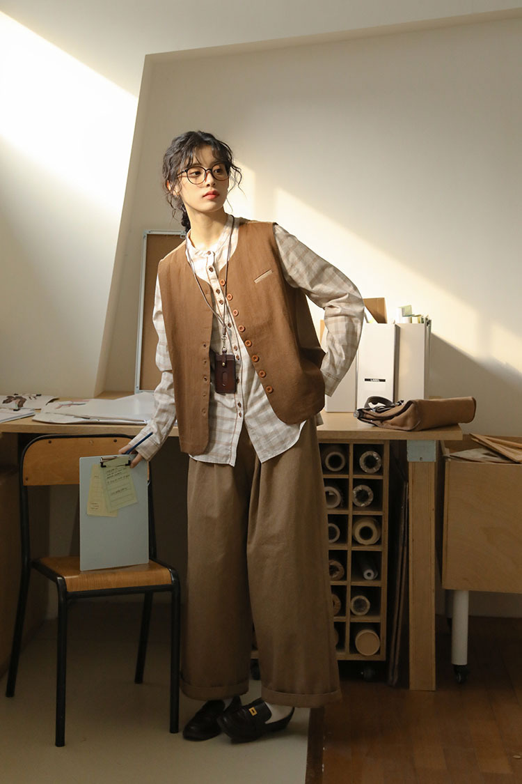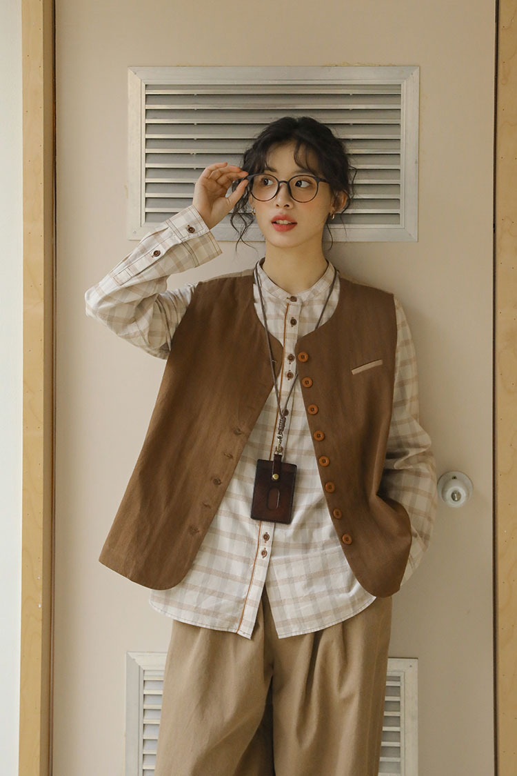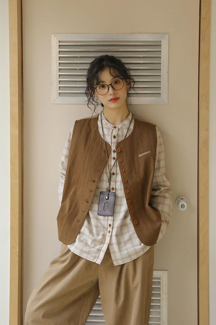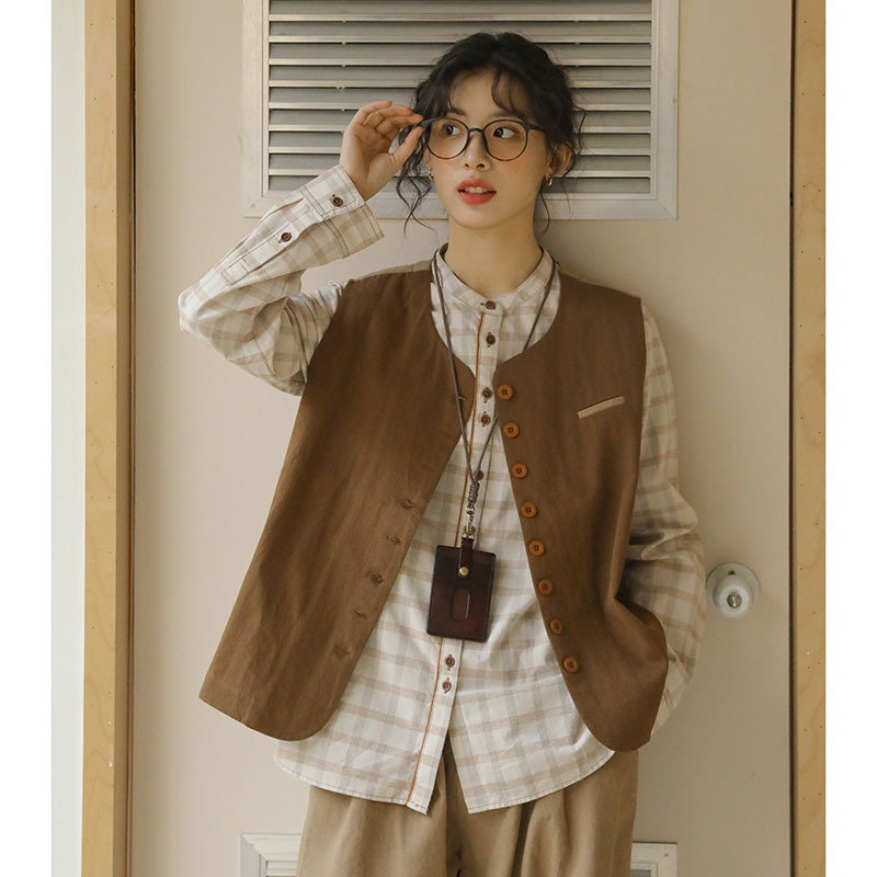 봄과 여름 2025 새로운 일본식 분위기 단일 브레스트 디자인 크루 넥 세트 조끼 웨어 재킷 여성용 자켓스토어 가기