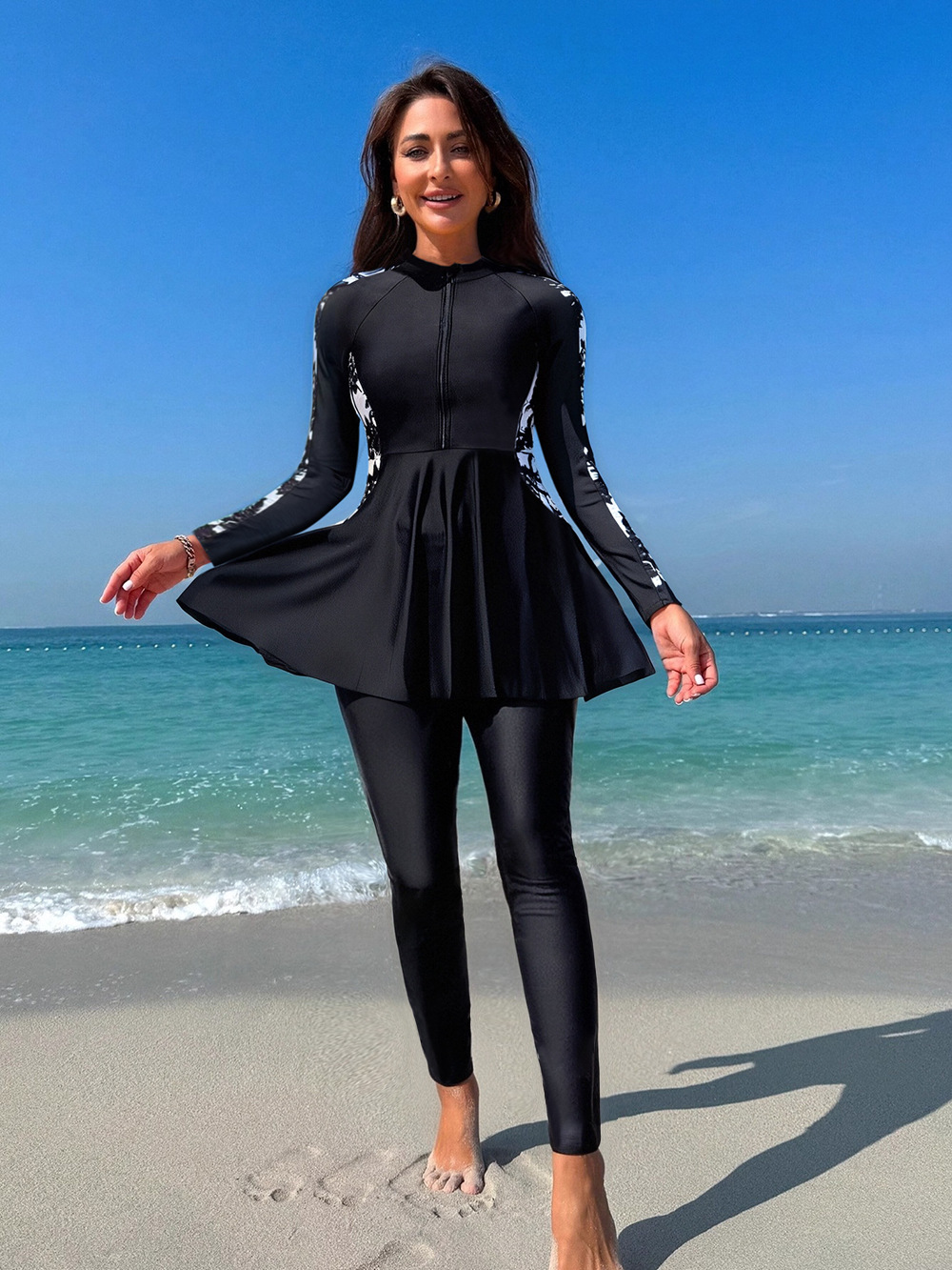 원피스 스포츠 수영복 여성 국경 유럽 및 미국 인쇄 긴 소매 타이트핏 보수적 수영복 선스크린 해변 서핑 수트