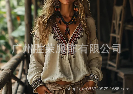 국경 2025 여성의 새로운 보헤미안 V-넥 민족 자수 술 장식 긴 소매 탑 아마존