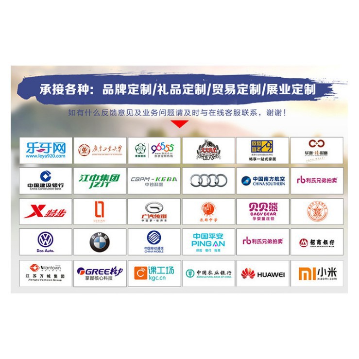 3. 起订量和工期:定制LOGO一般50-200个起,工期3天起,具体视产品数量和款式难易程度来定。可随时咨询客服。