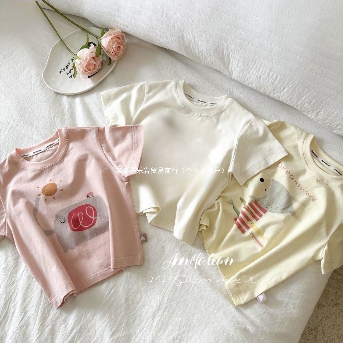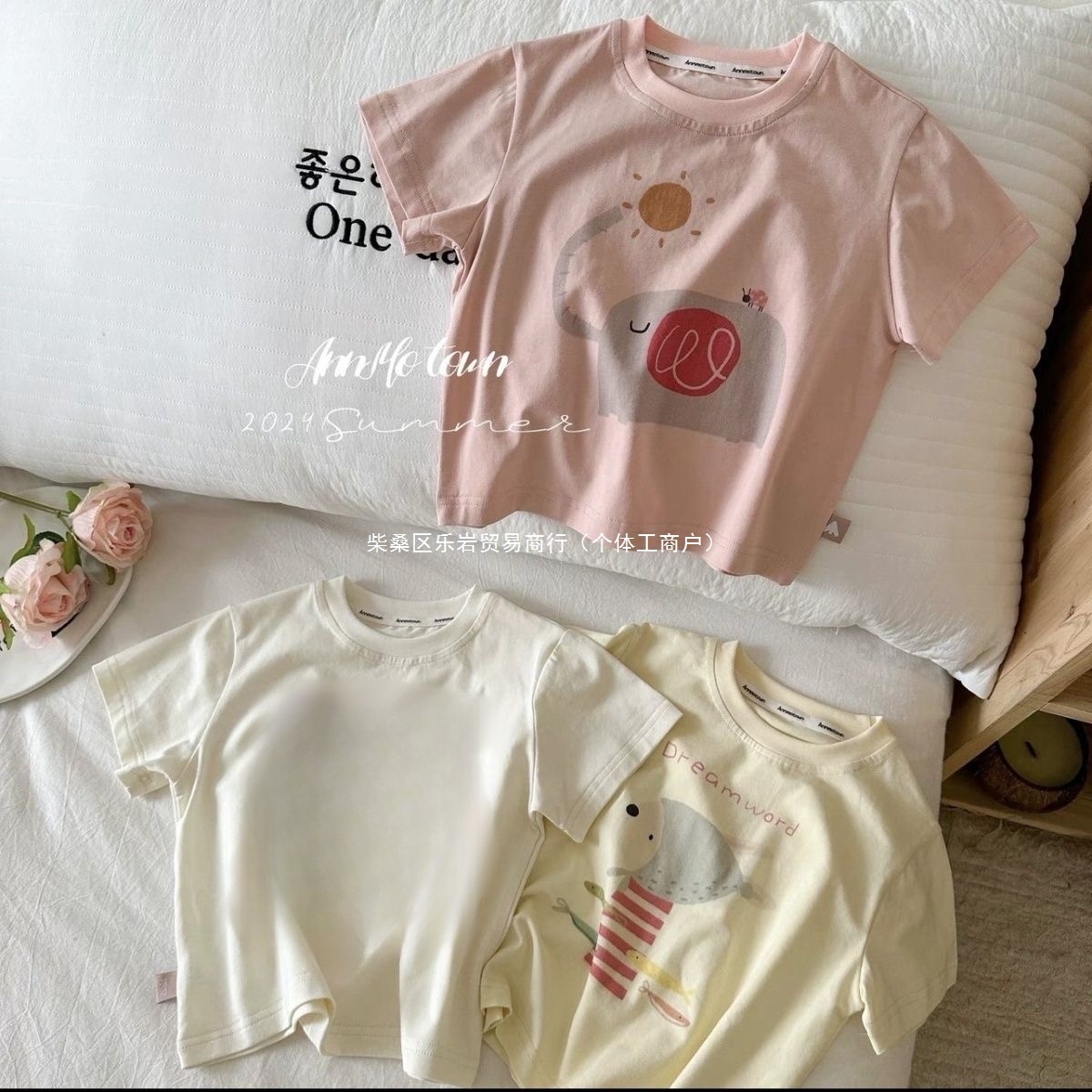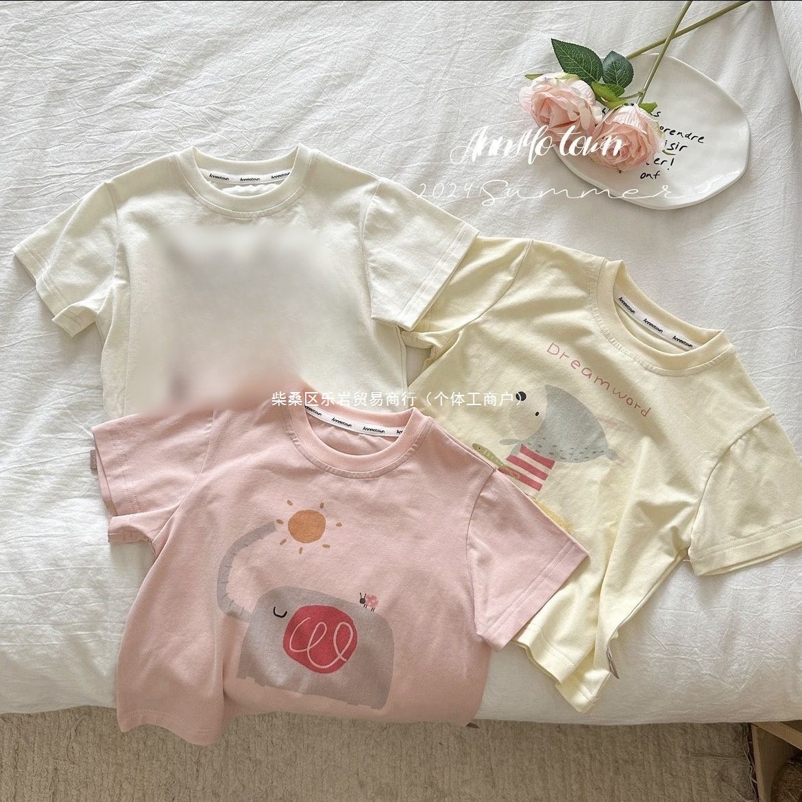 소녀 면화 탑 2025 여름 새로운 어린이 둥근 목 만화 서양식 귀여운 핑크 아동복 반팔 도매스토어 가기