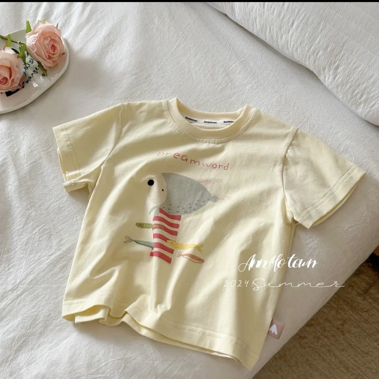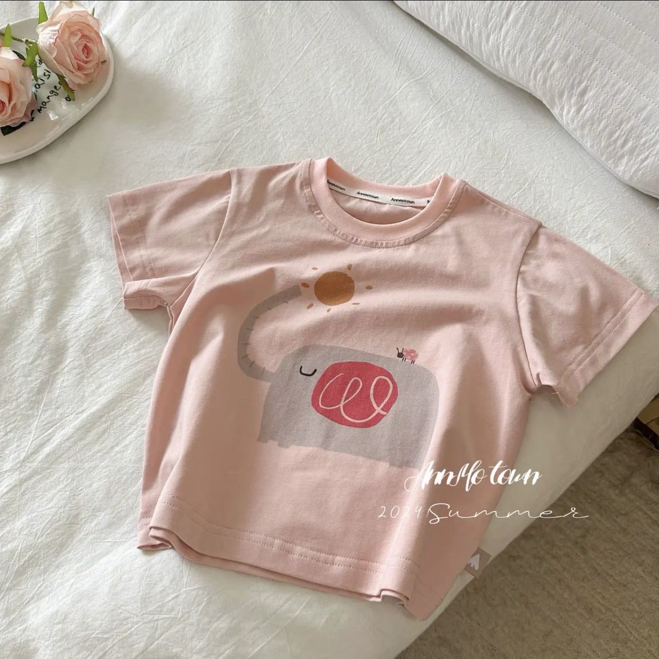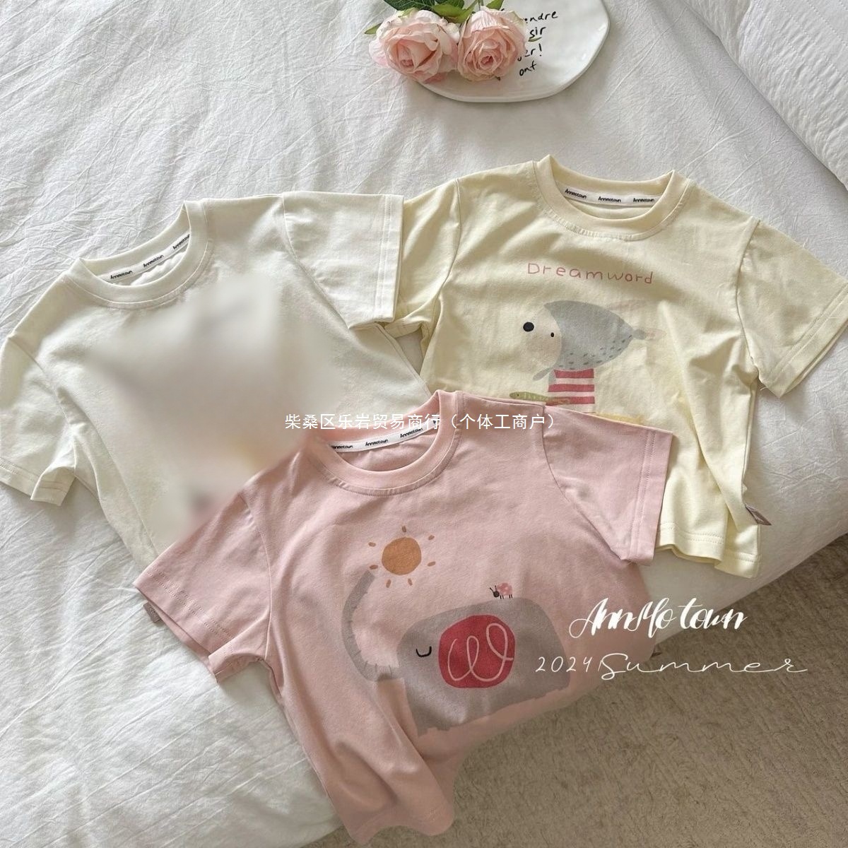 소녀 면화 탑 2025 여름 새로운 어린이 둥근 목 만화 서양식 귀여운 핑크 아동복 반팔 도매스토어 가기