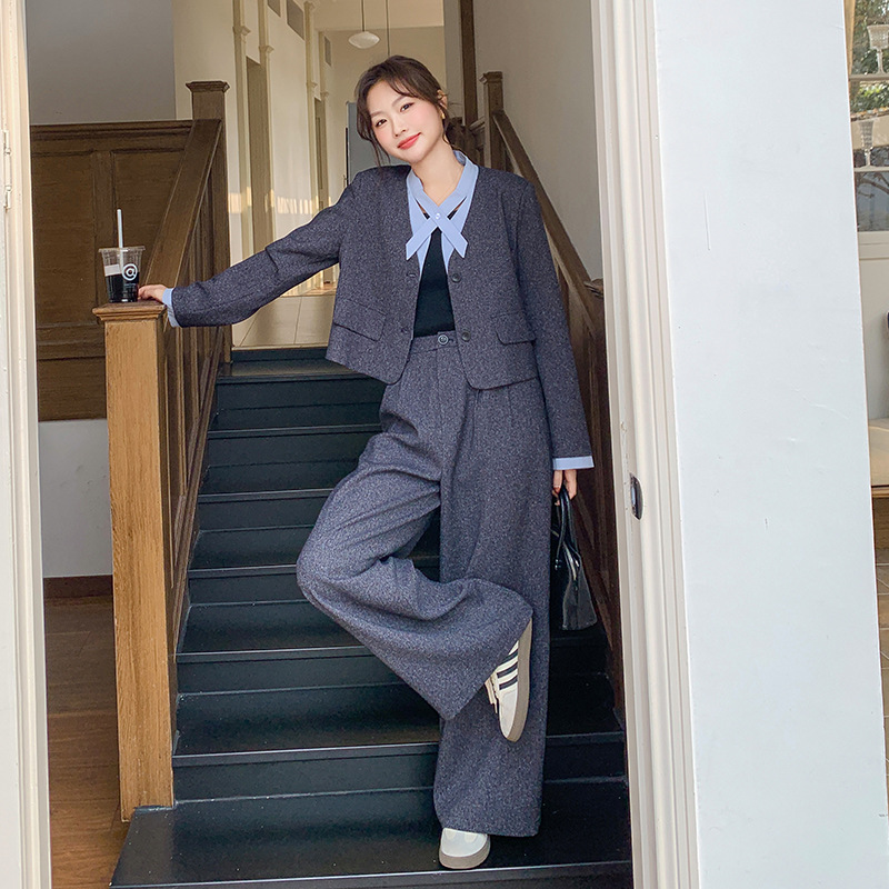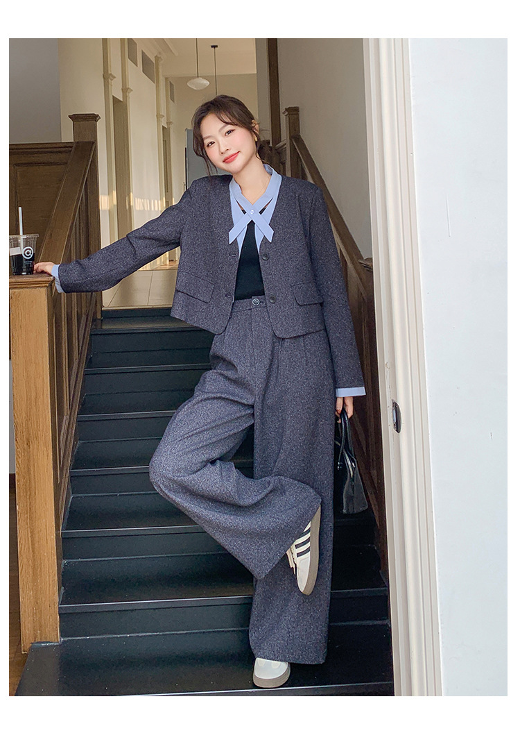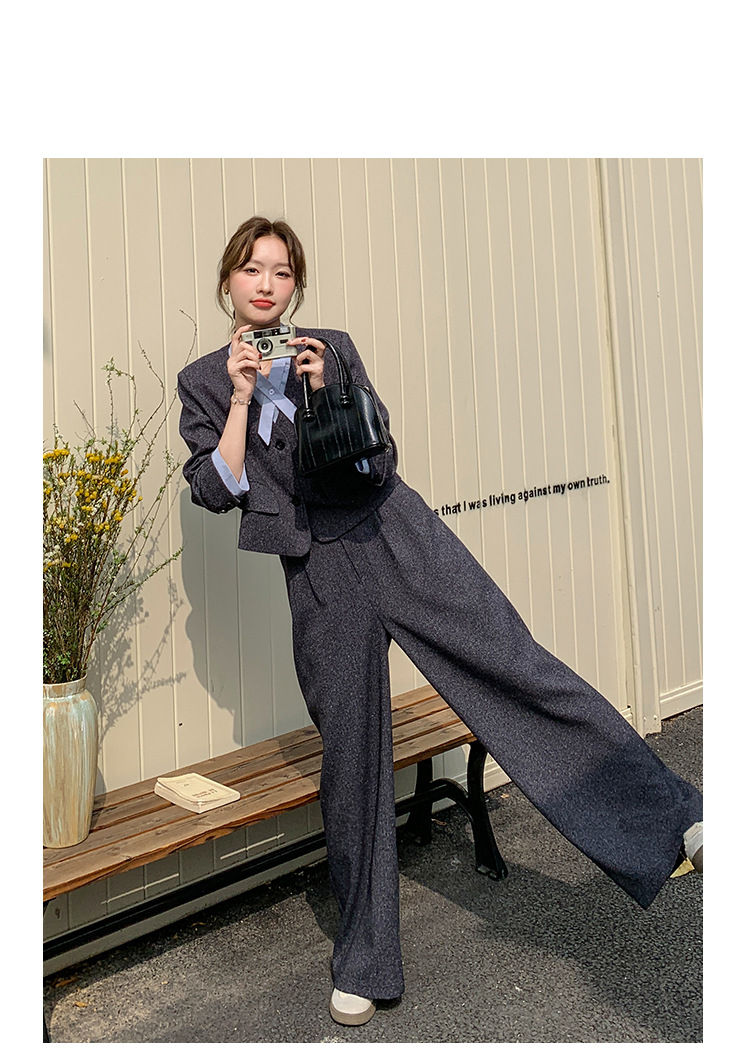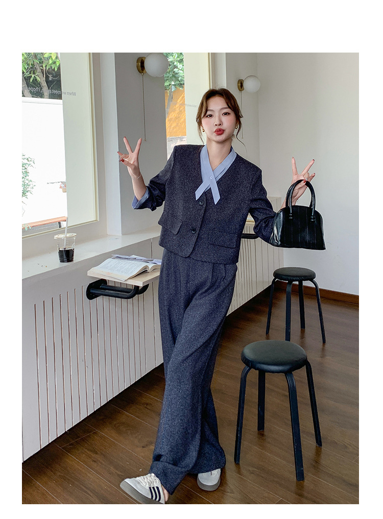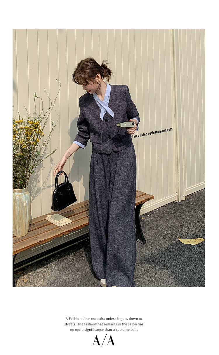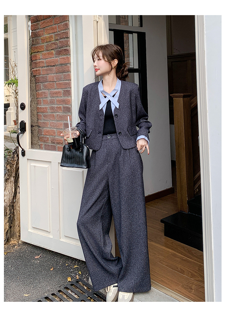 [Mengmei] 25 봄 Meek 하이 엔드 패션 콘트라스트 컬러 작은 세트 높은 허리 넓은 다리 바지 세트 여성 프로페셔스스토어 가기