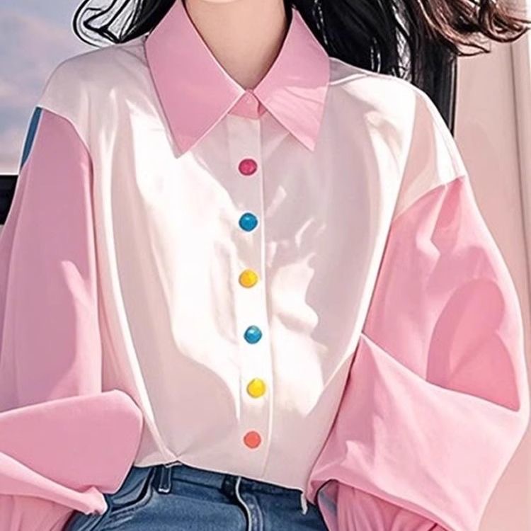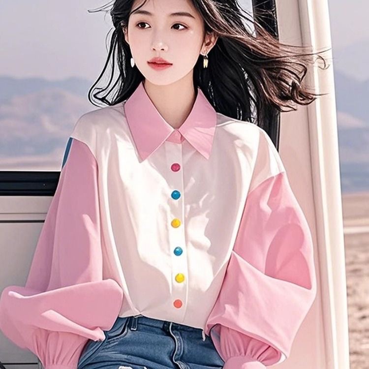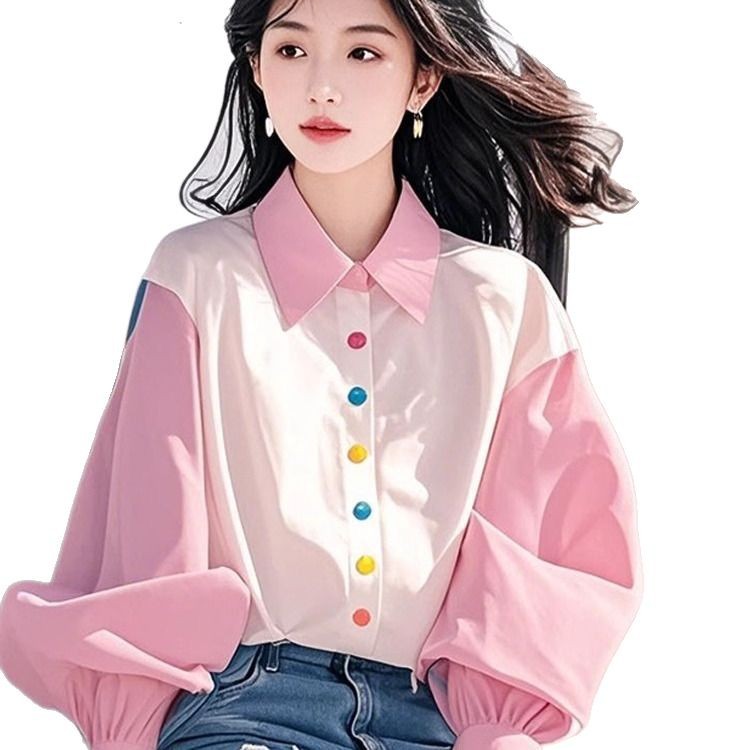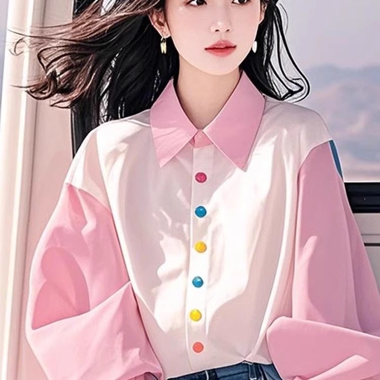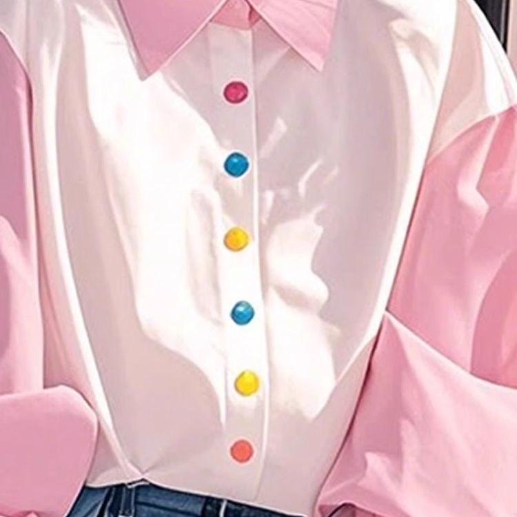도파민 핑크 화이트 콘트라스트 컬러 셔츠 여성의 봄 2025 새로운 스타일 작은 여성의 나이를 줄이는 서양식 POLO 칼라 스위트 탑스토어 가기