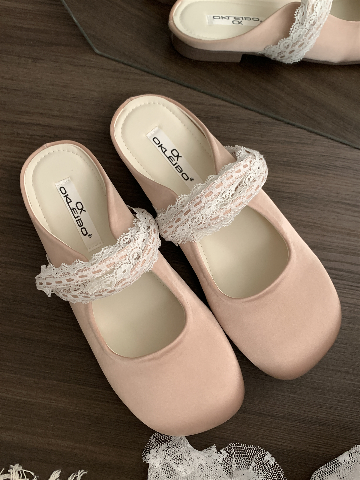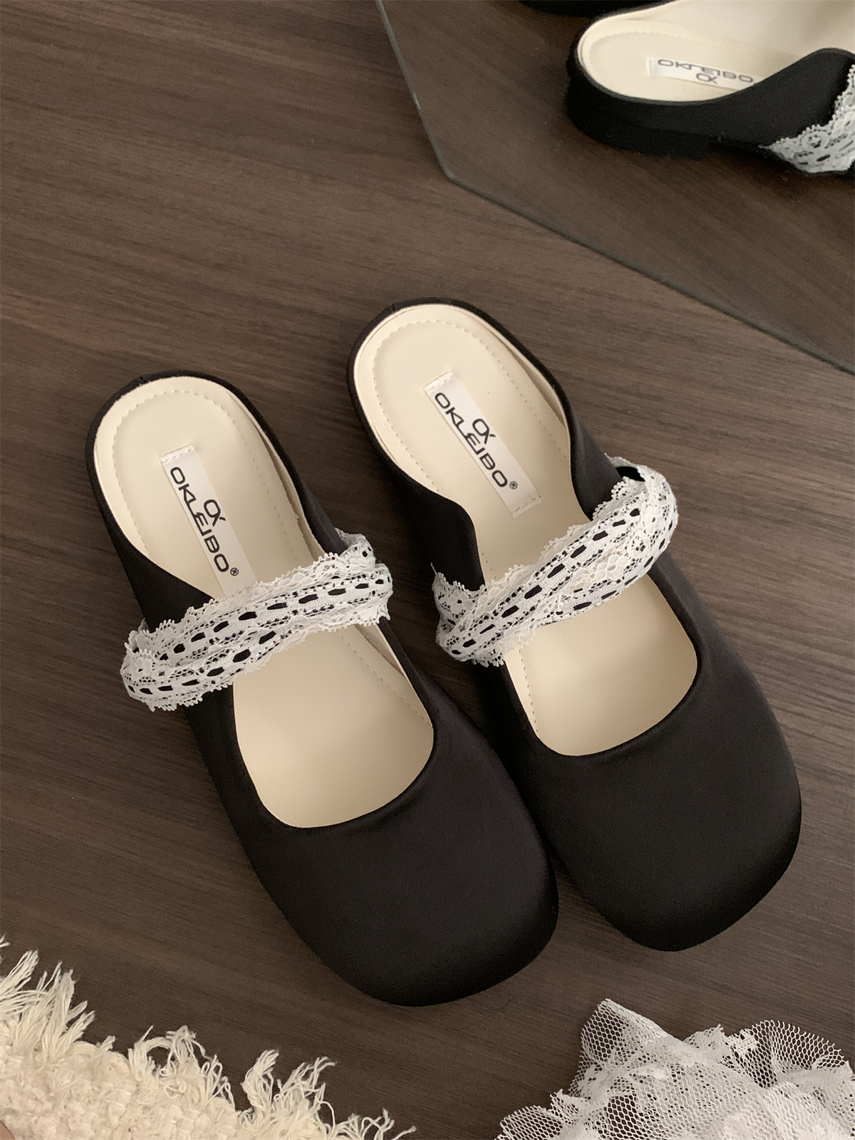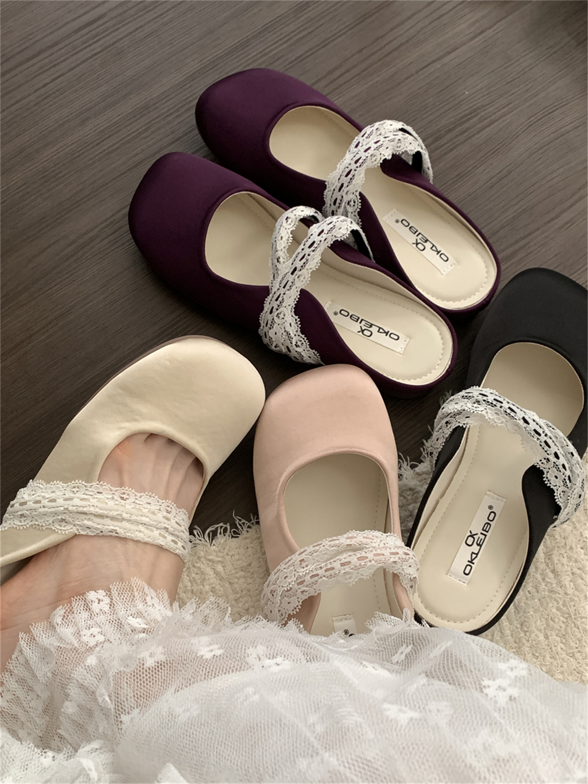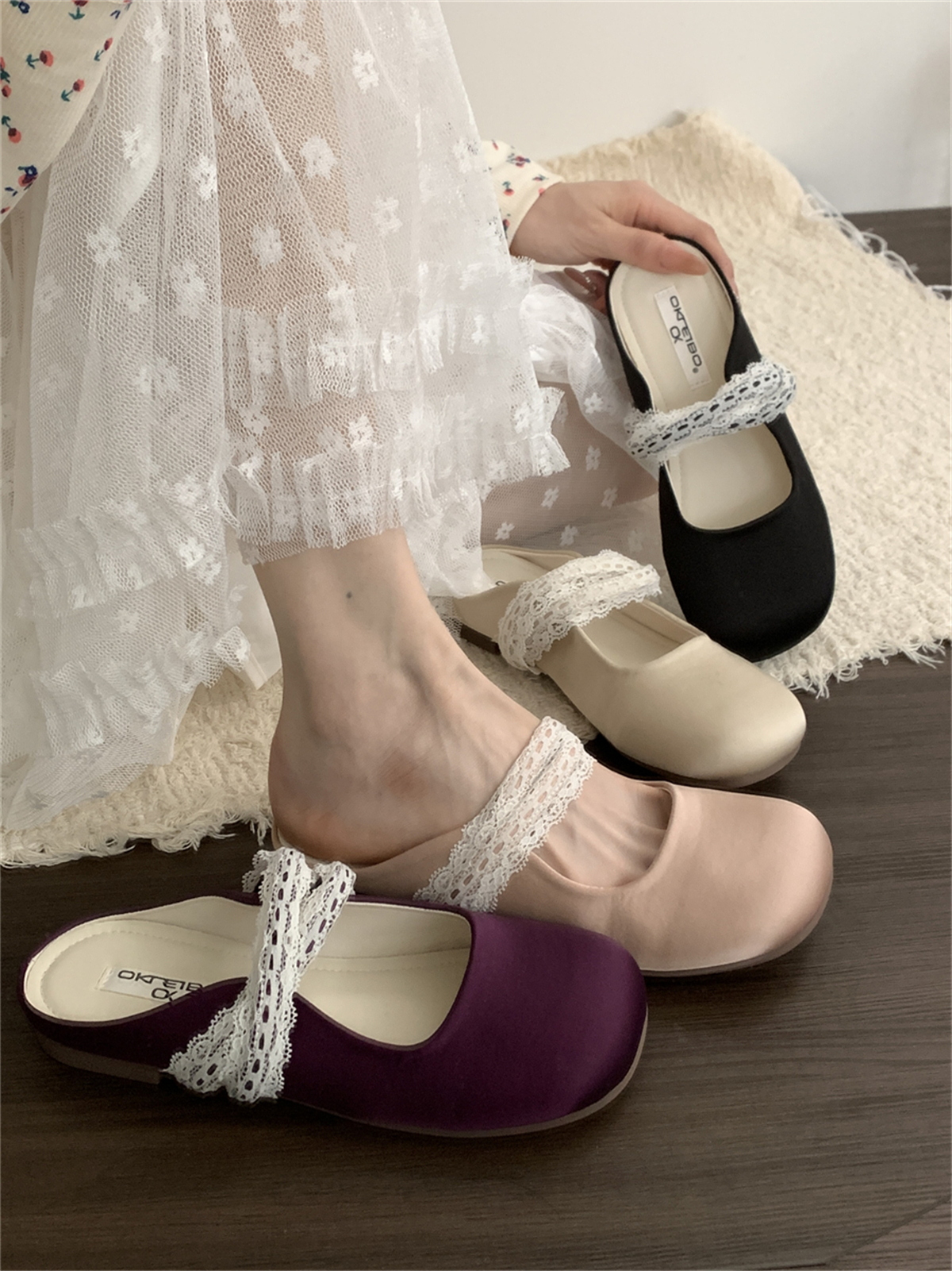 2025 봄 여름 신상 레이스 원라인 리본 새틴 토 플랫 하프 슬리퍼 여성용스토어 가기