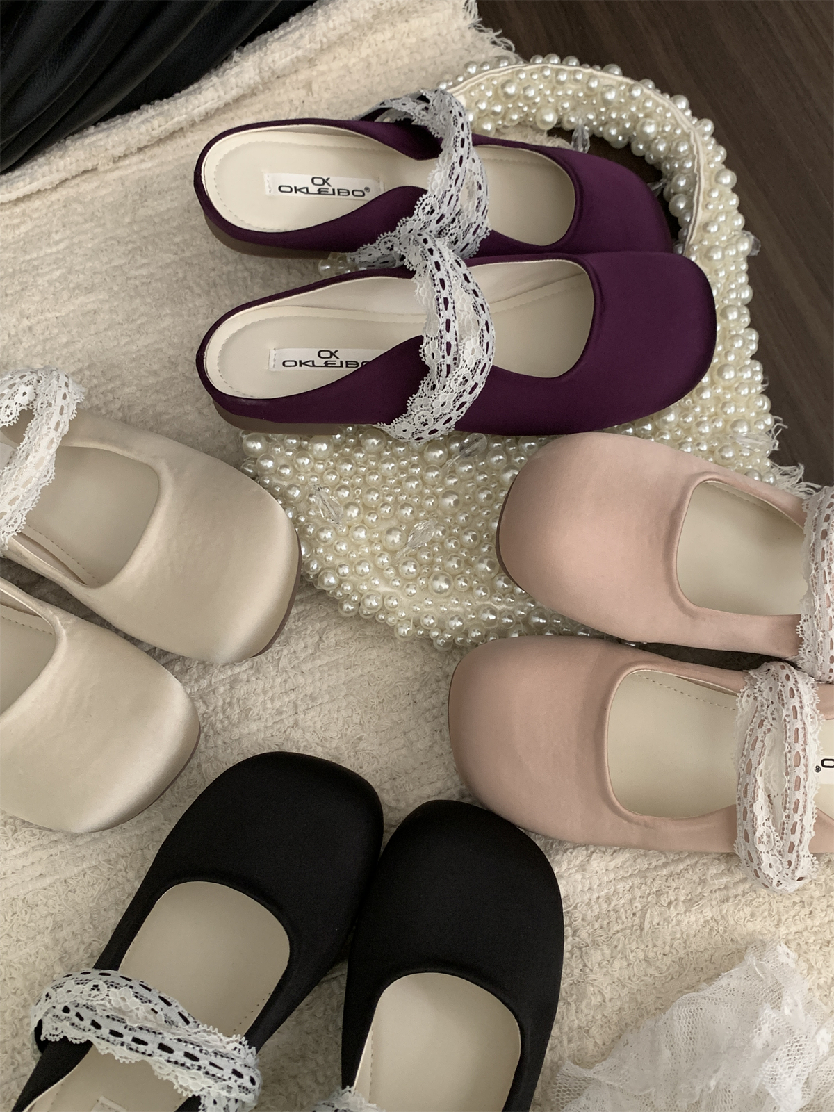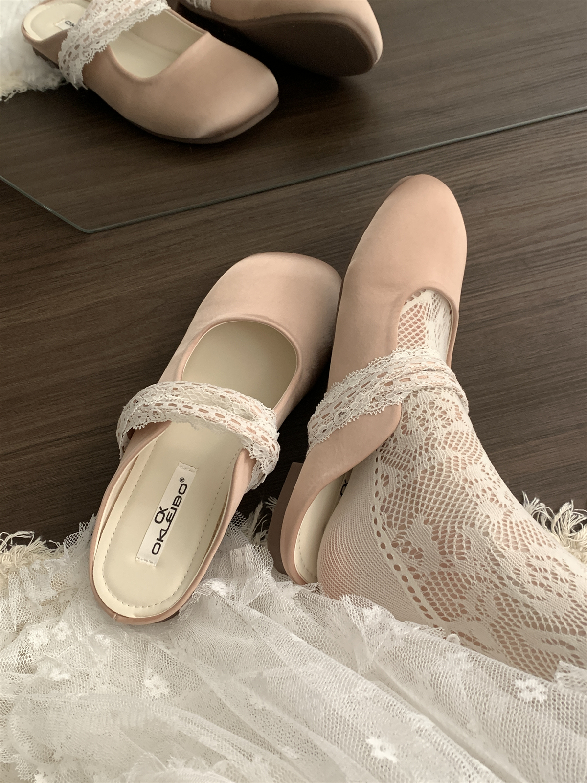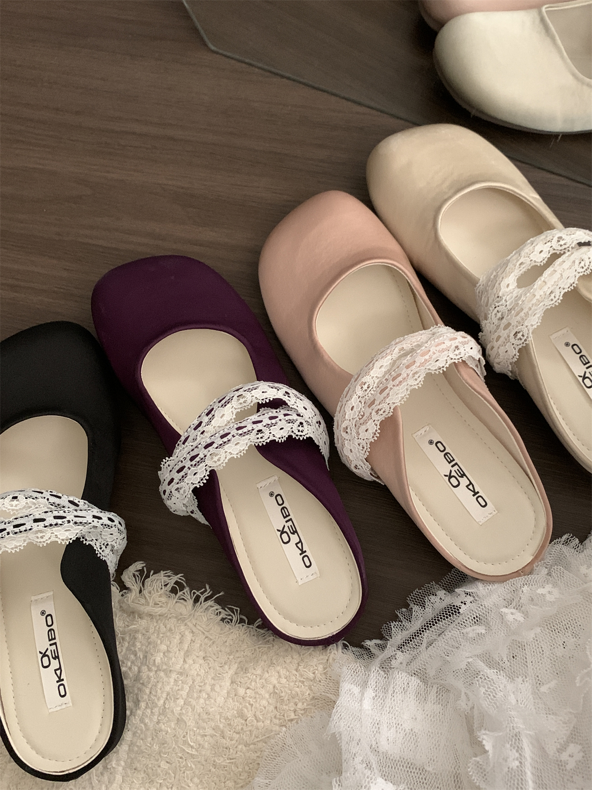 2025 봄 여름 신상 레이스 원라인 리본 새틴 토 플랫 하프 슬리퍼 여성용스토어 가기