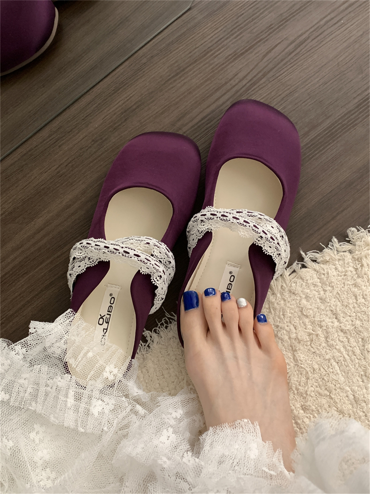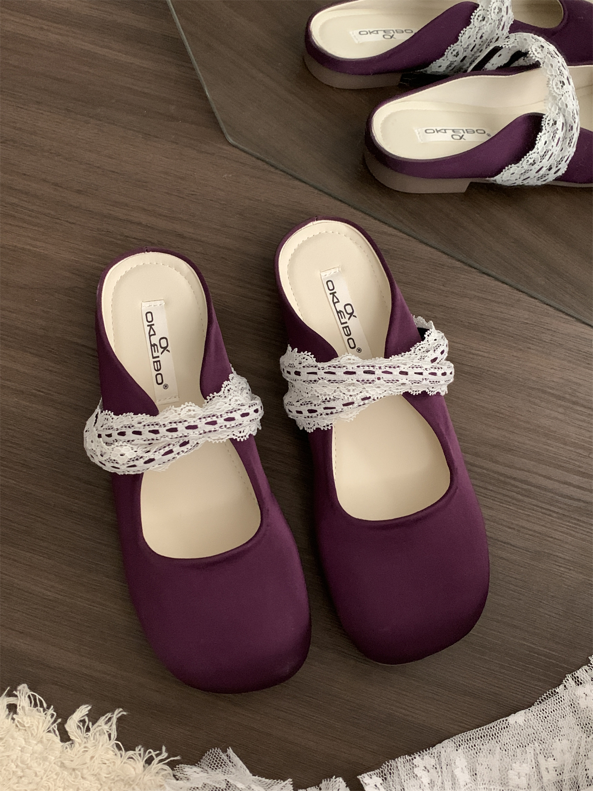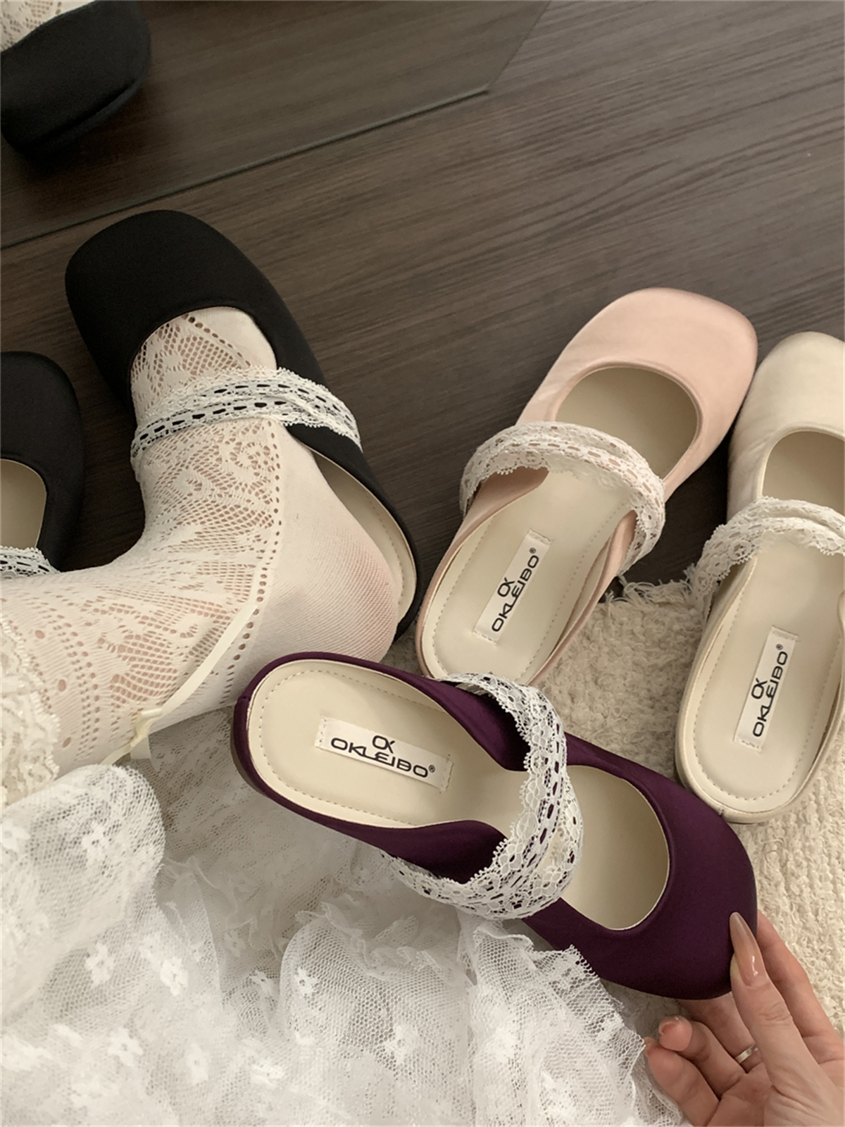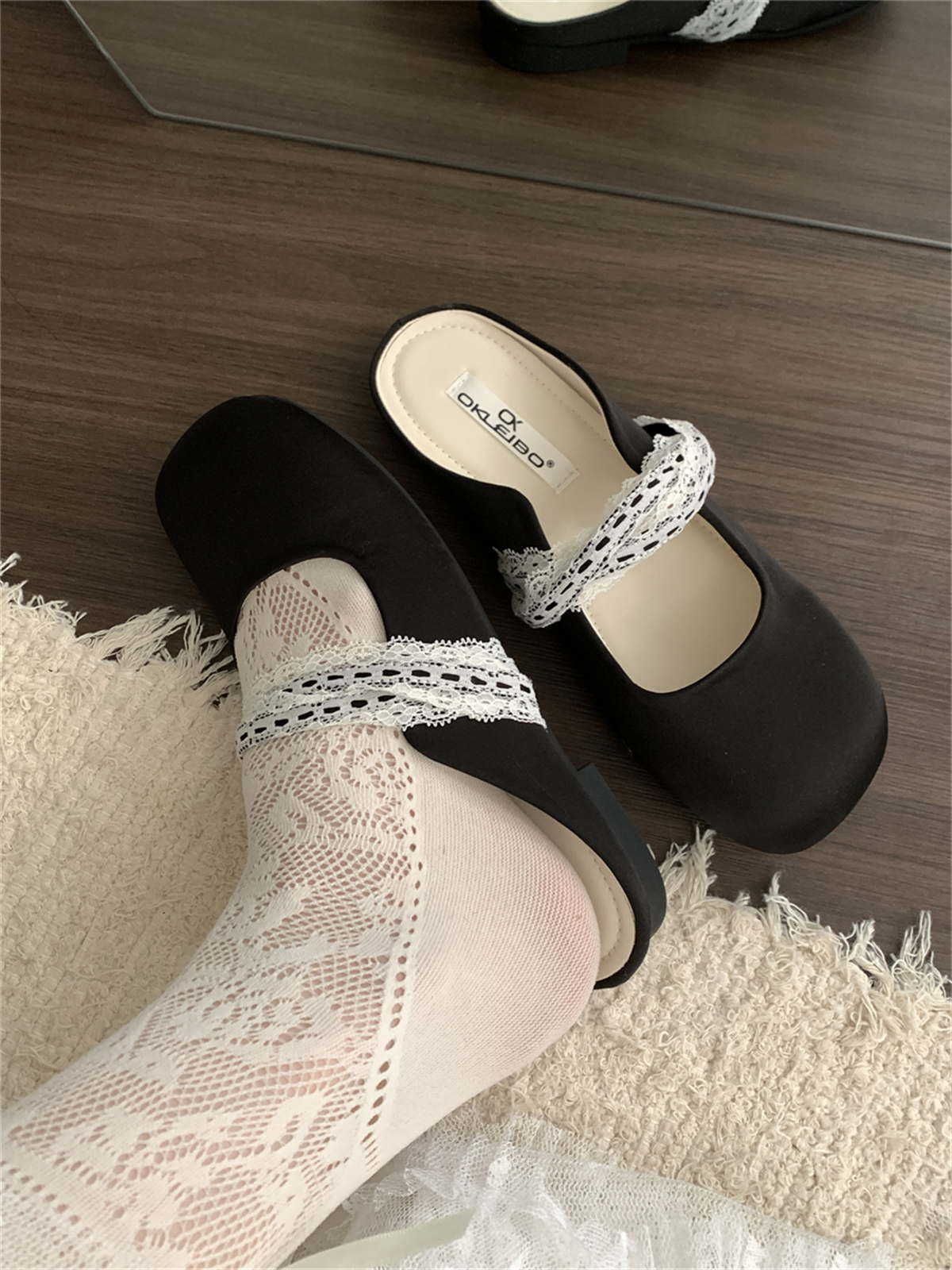 2025 봄 여름 신상 레이스 원라인 리본 새틴 토 플랫 하프 슬리퍼 여성용스토어 가기