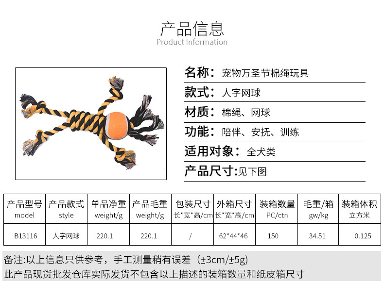 아마존 신제품 애완견 면 로프 장난감 치아 청소 할로윈 개 물기 로프 테니스 공 제조업체 재고 있음스토어 가기