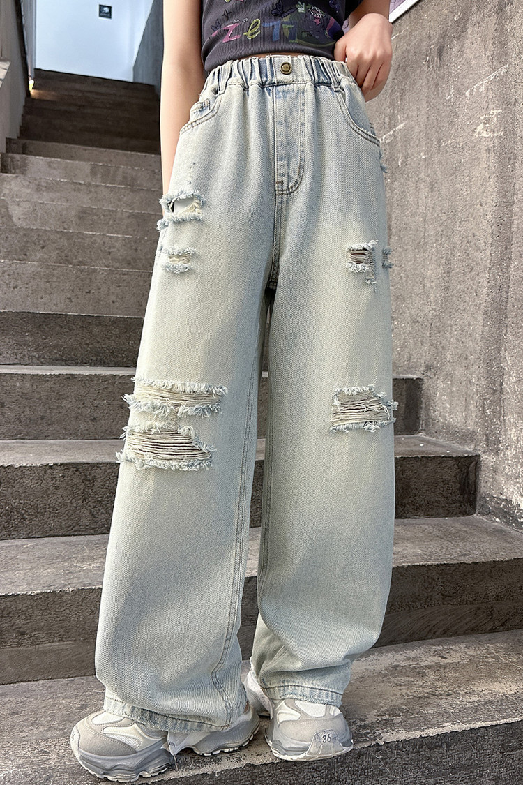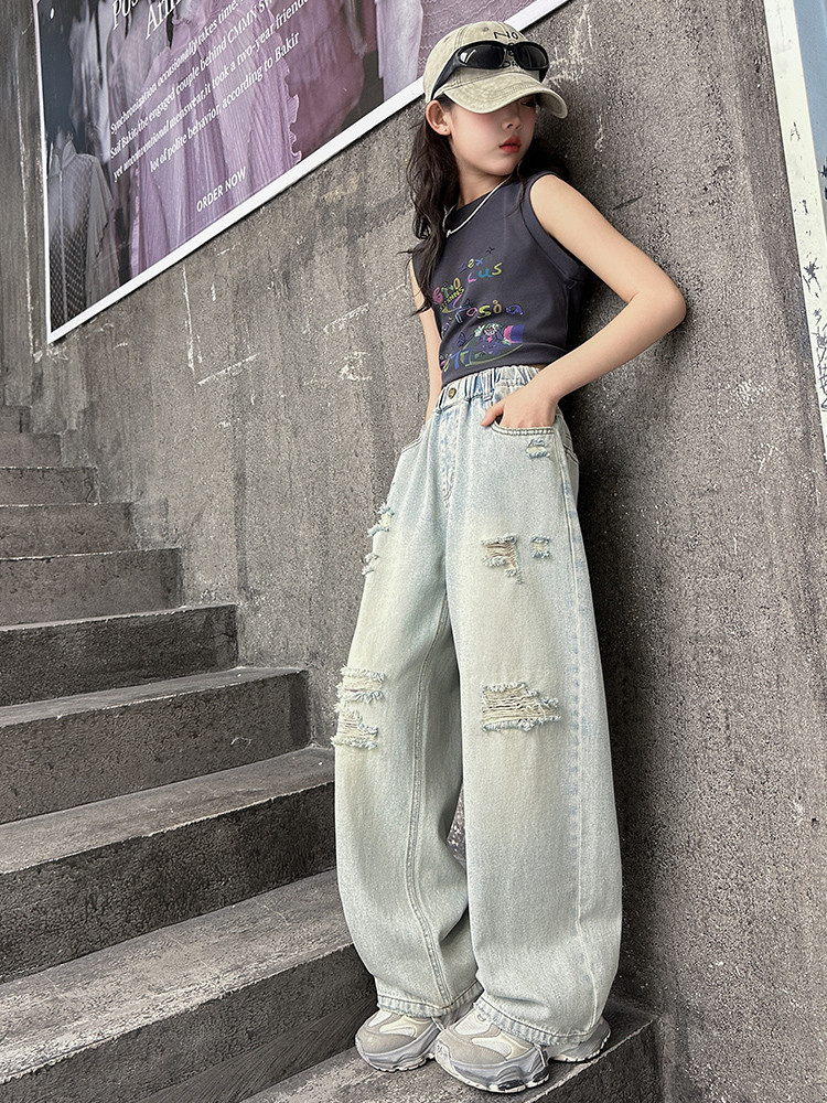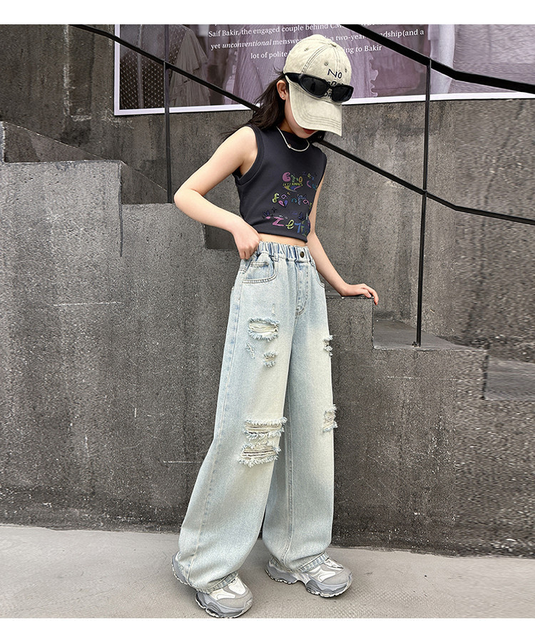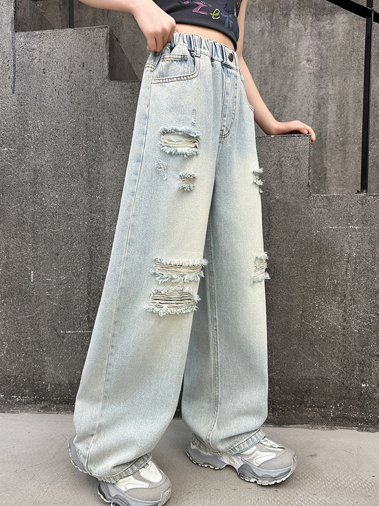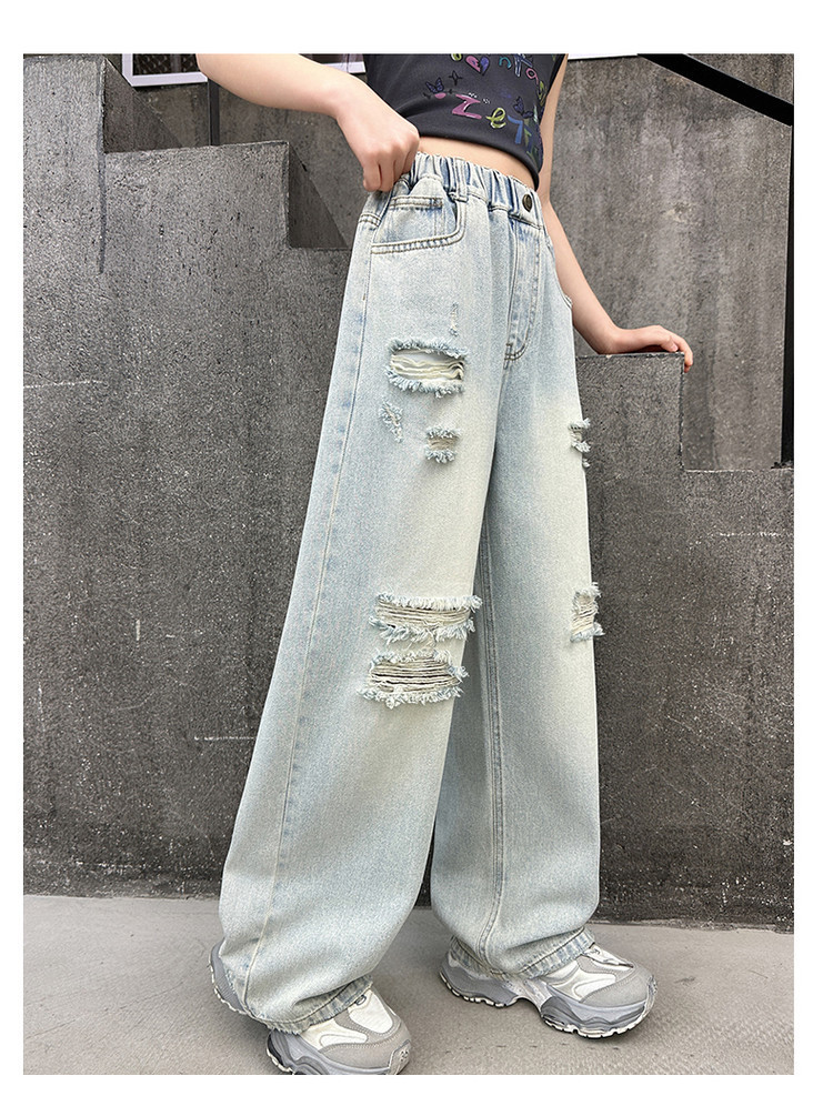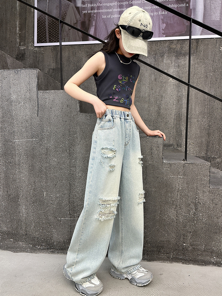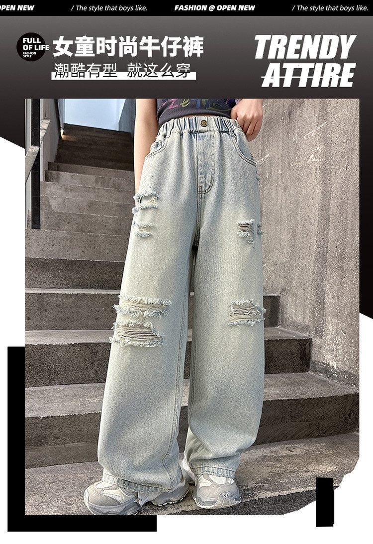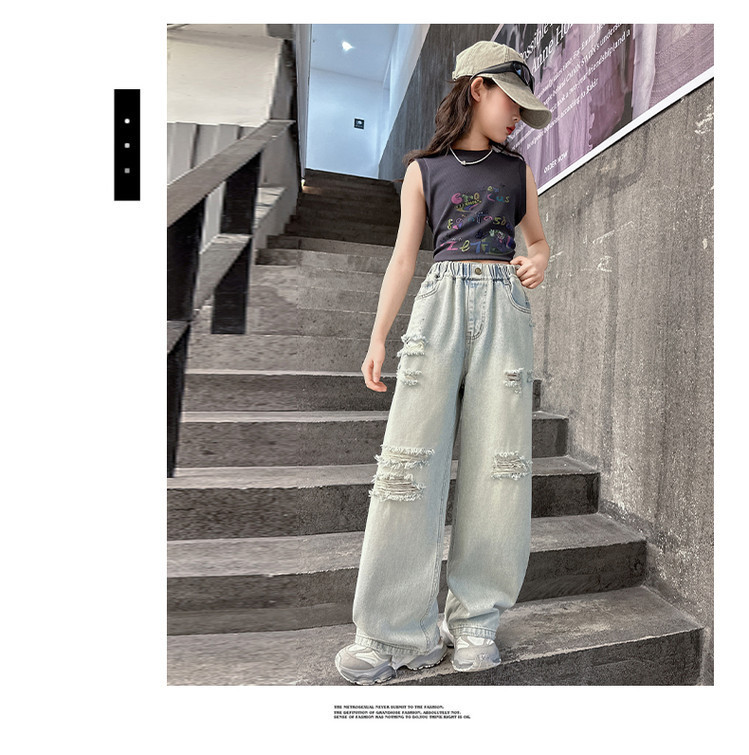 아마존 어린이 바지 걸스 패셔너블 리핑 청바지 여름 얇은 트렌디 스트레이트 바지 올매치 바지