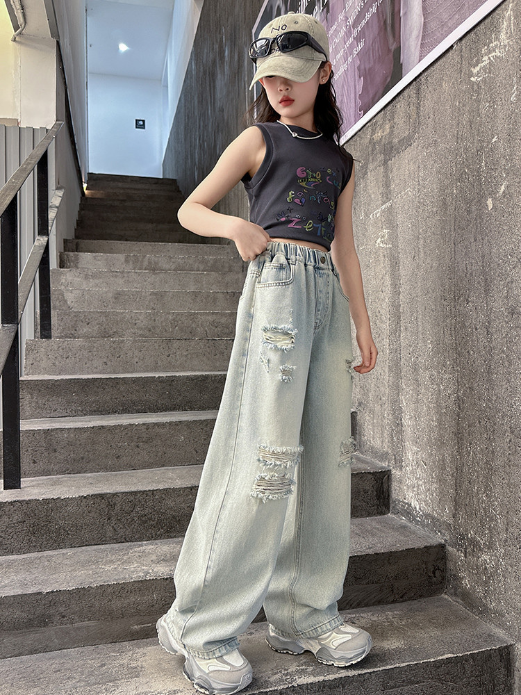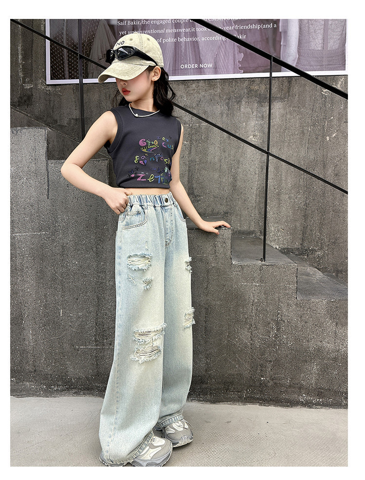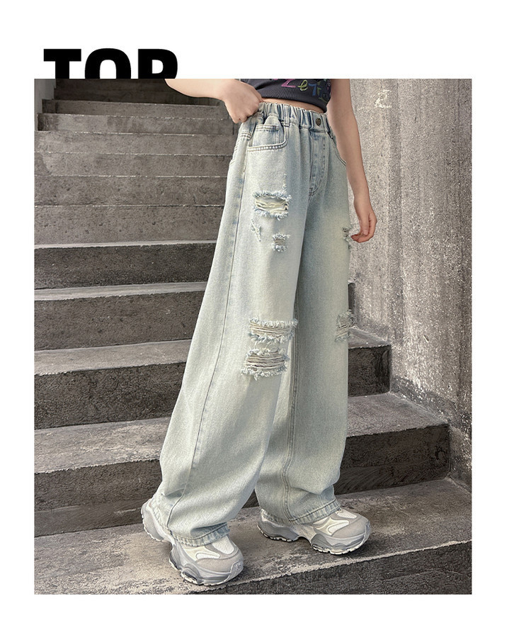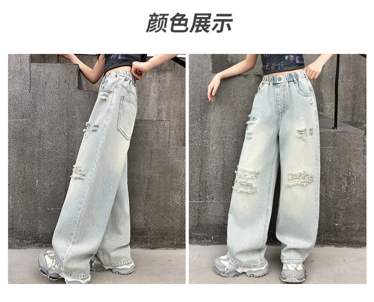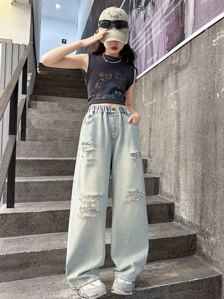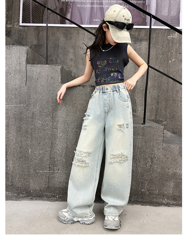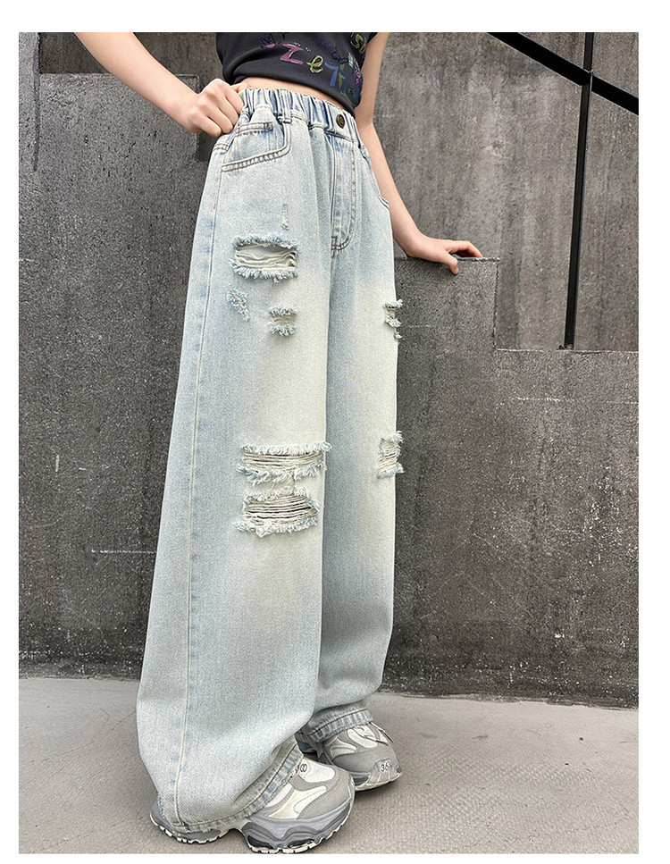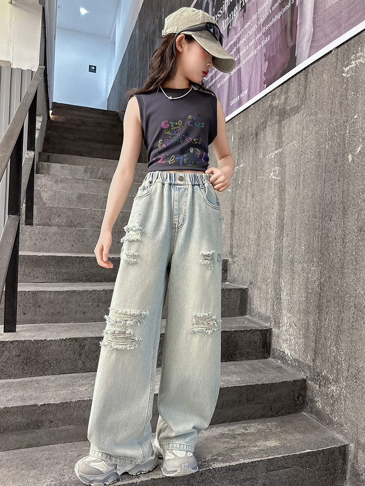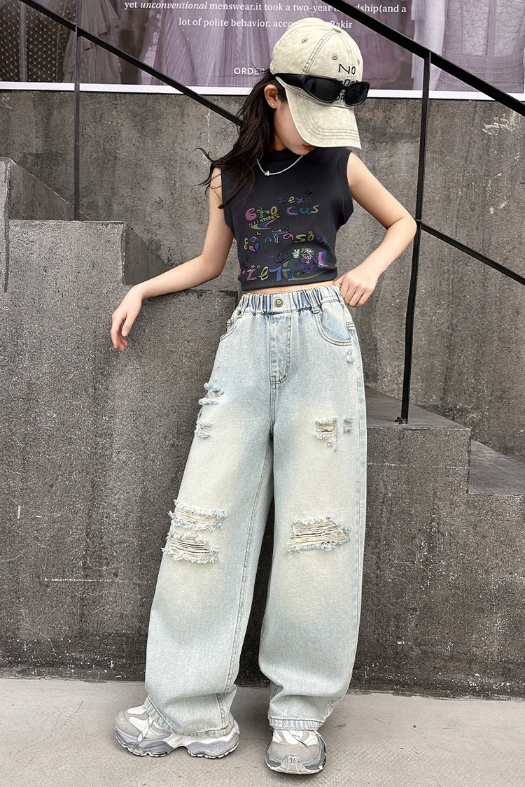 아마존 어린이 바지 걸스 패셔너블 리핑 청바지 여름 얇은 트렌디 스트레이트 바지 올매치 바지