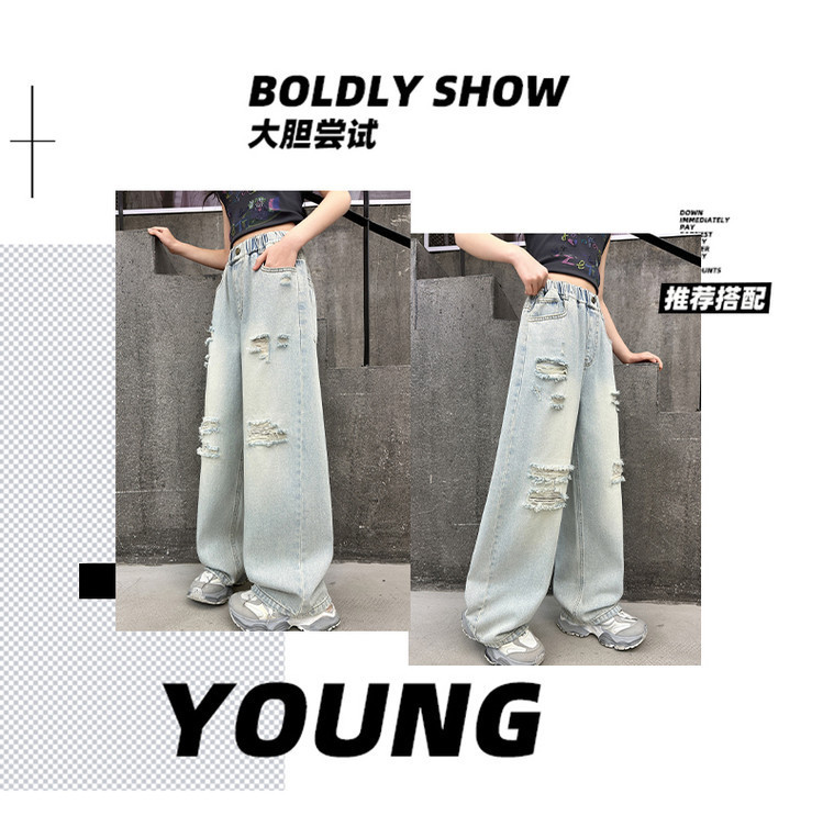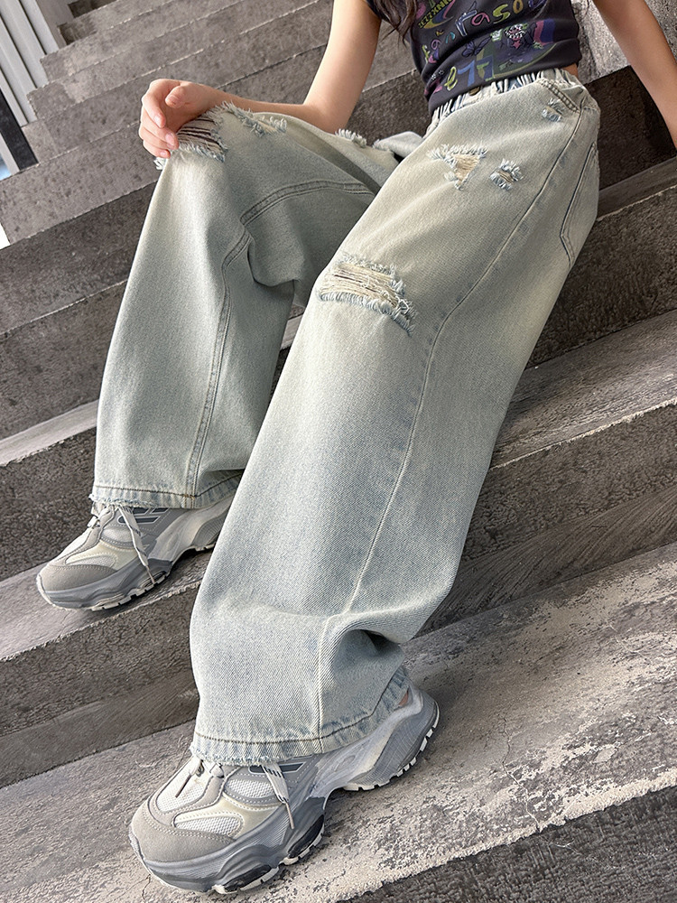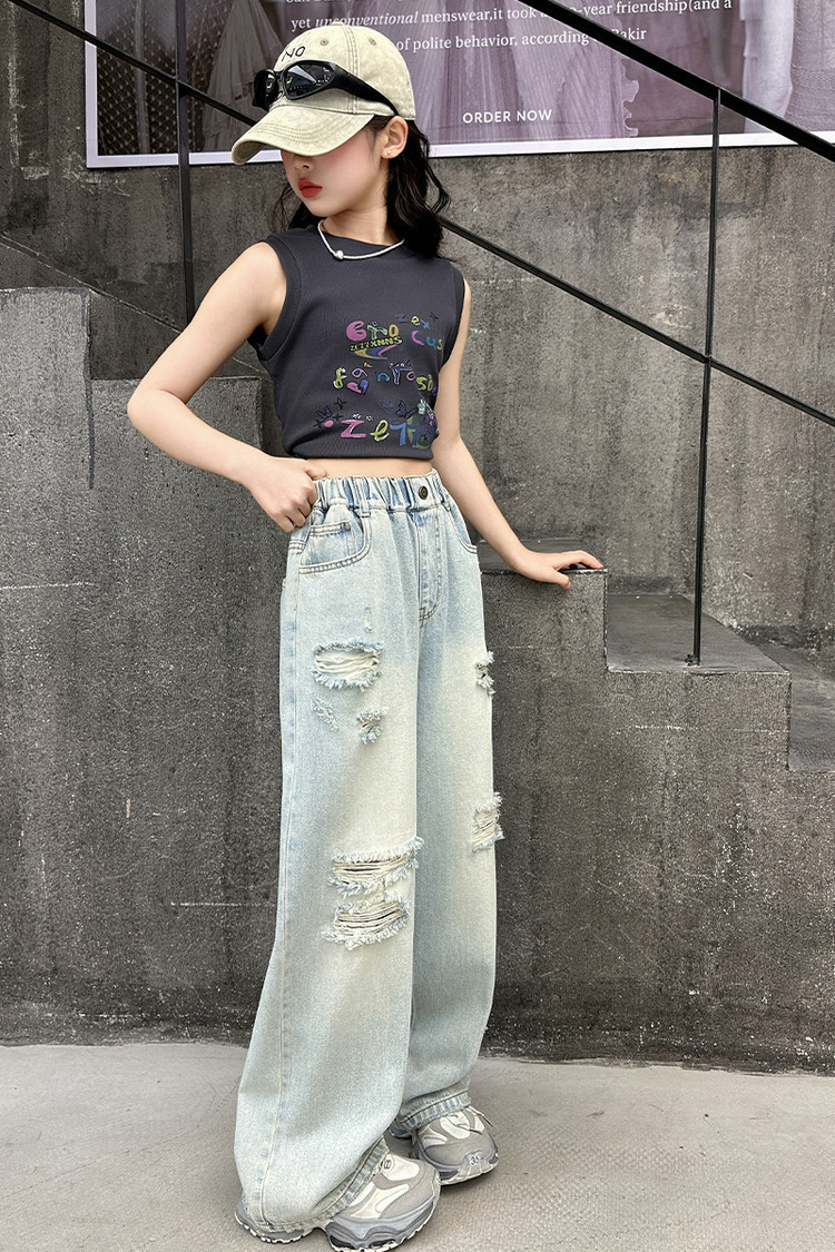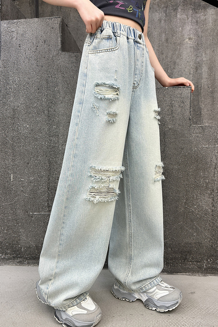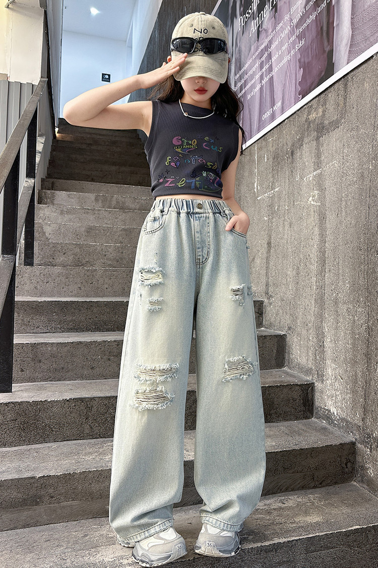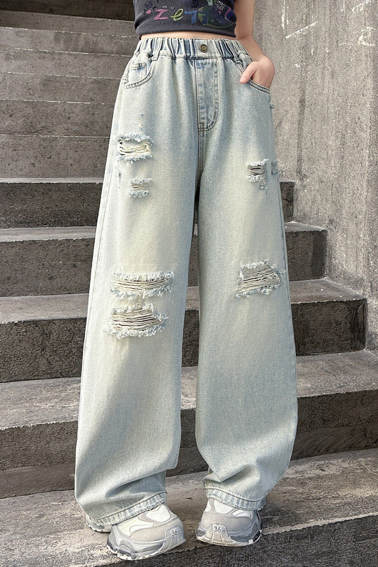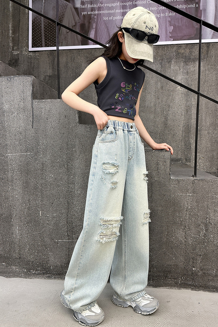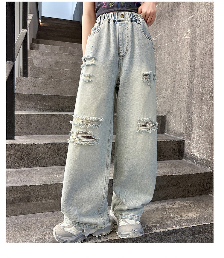 아마존 어린이 바지 걸스 패셔너블 리핑 청바지 여름 얇은 트렌디 스트레이트 바지 올매치 바지