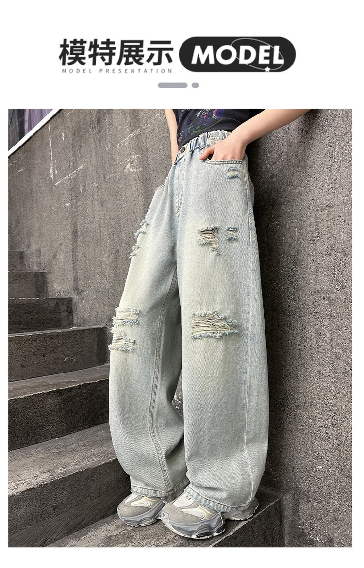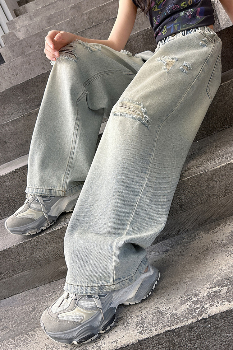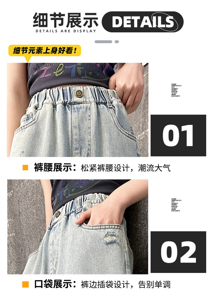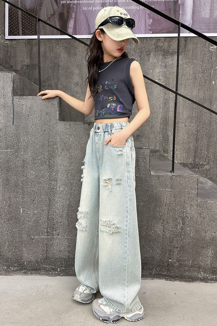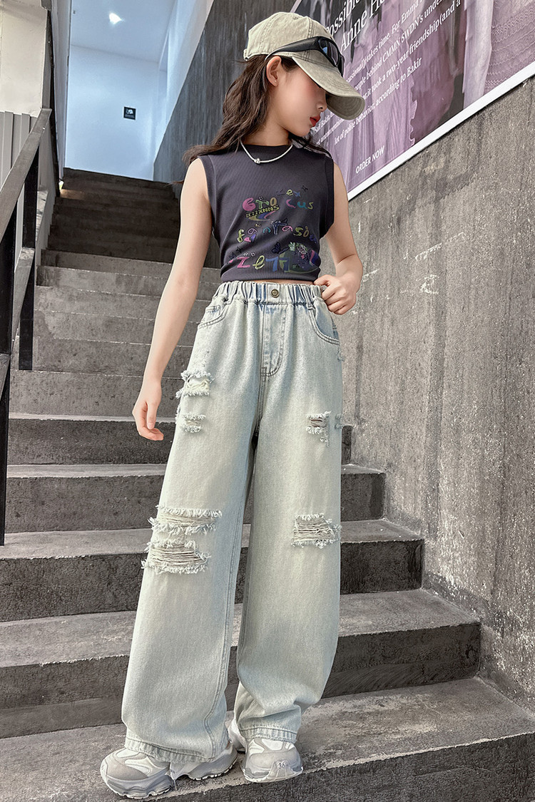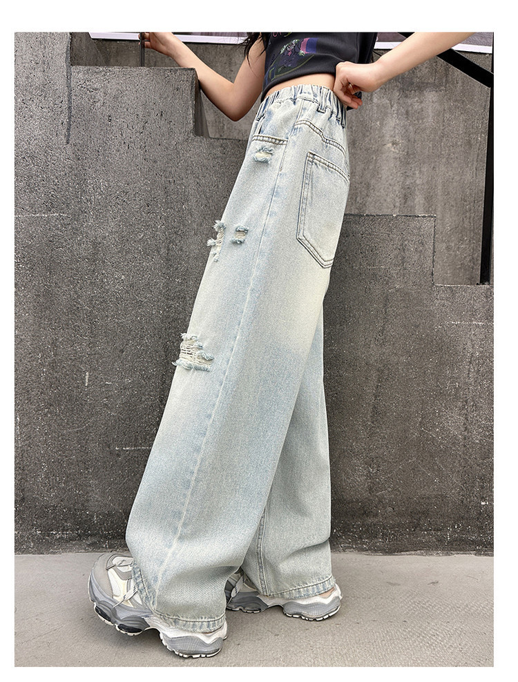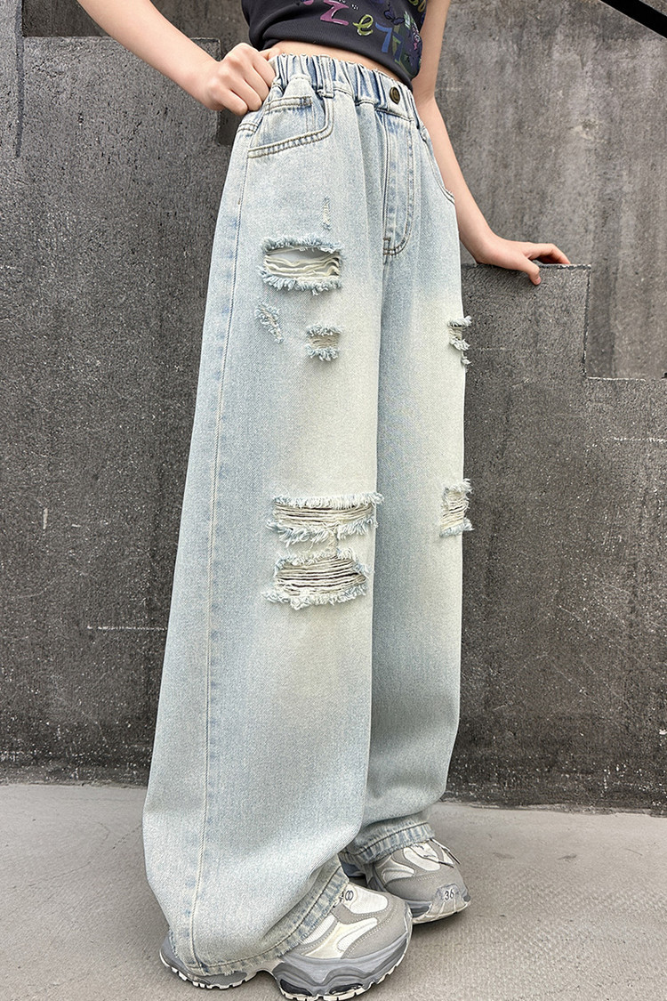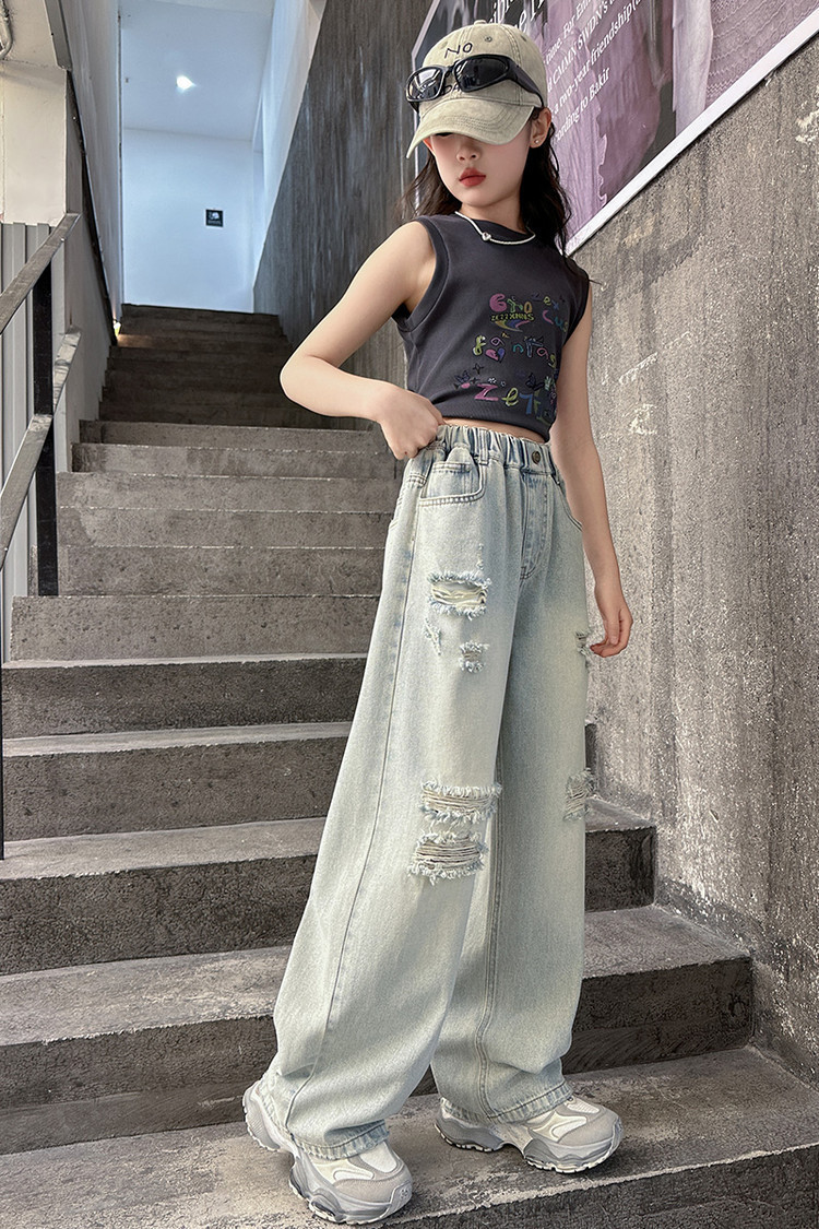 아마존 어린이 바지 걸스 패셔너블 리핑 청바지 여름 얇은 트렌디 스트레이트 바지 올매치 바지
