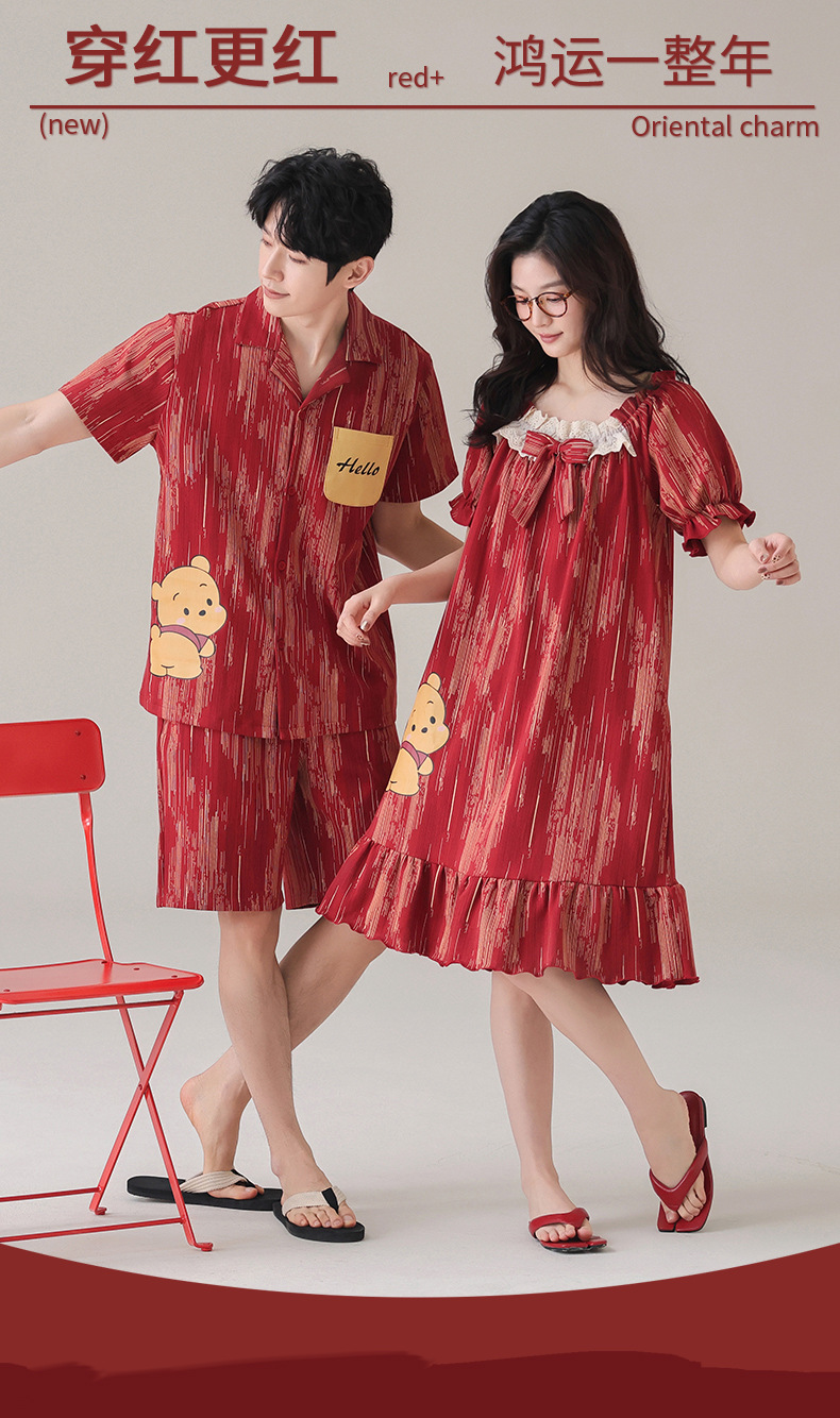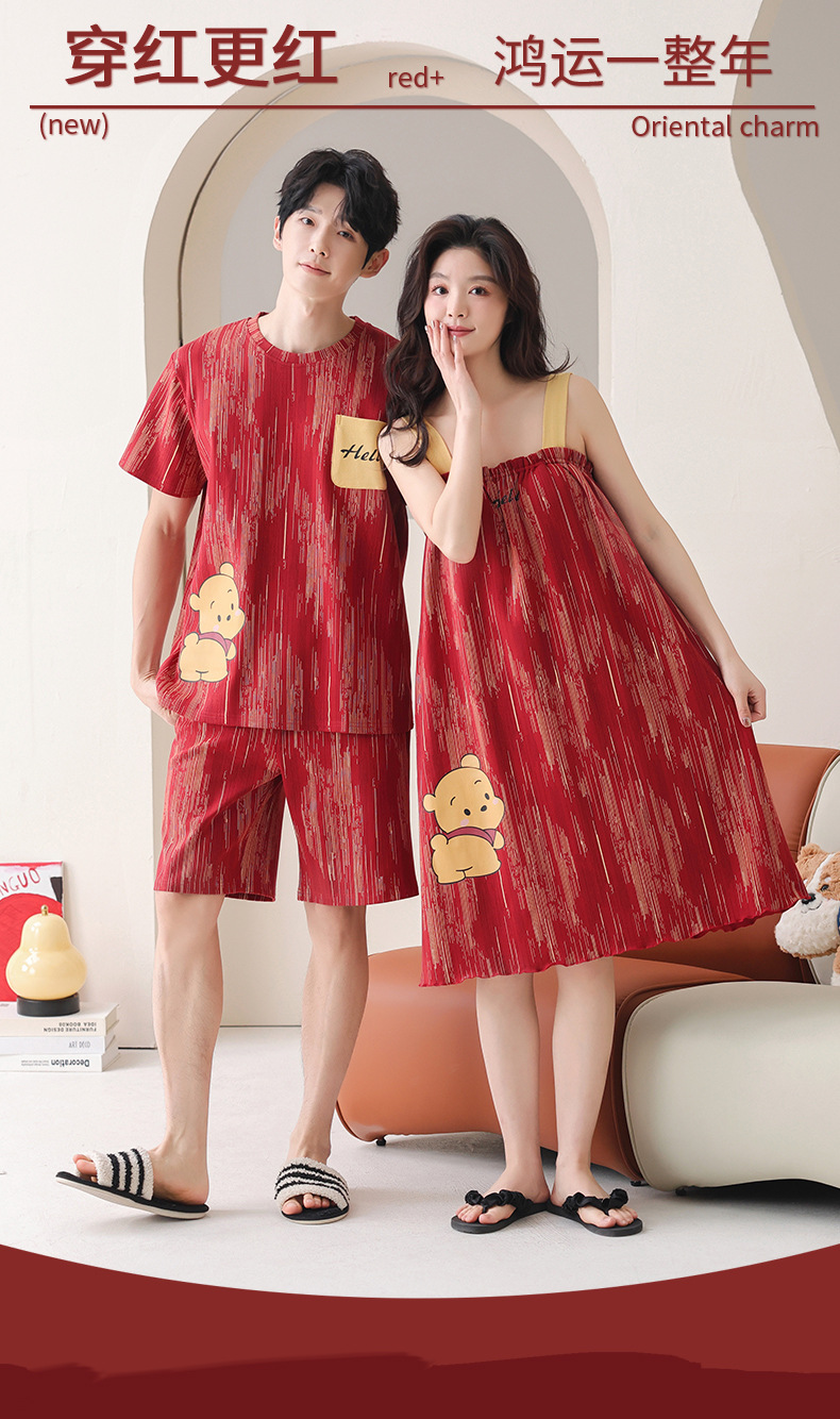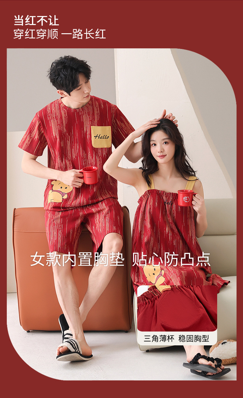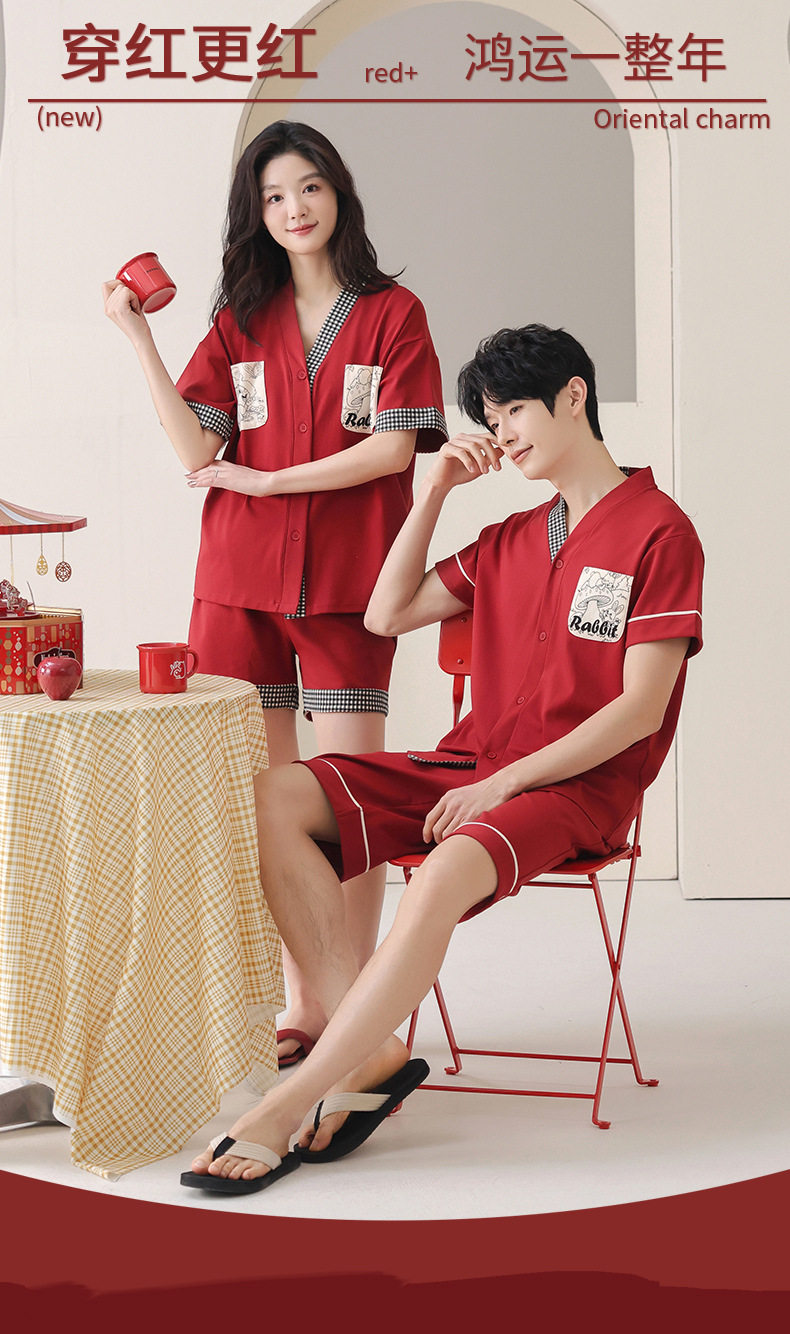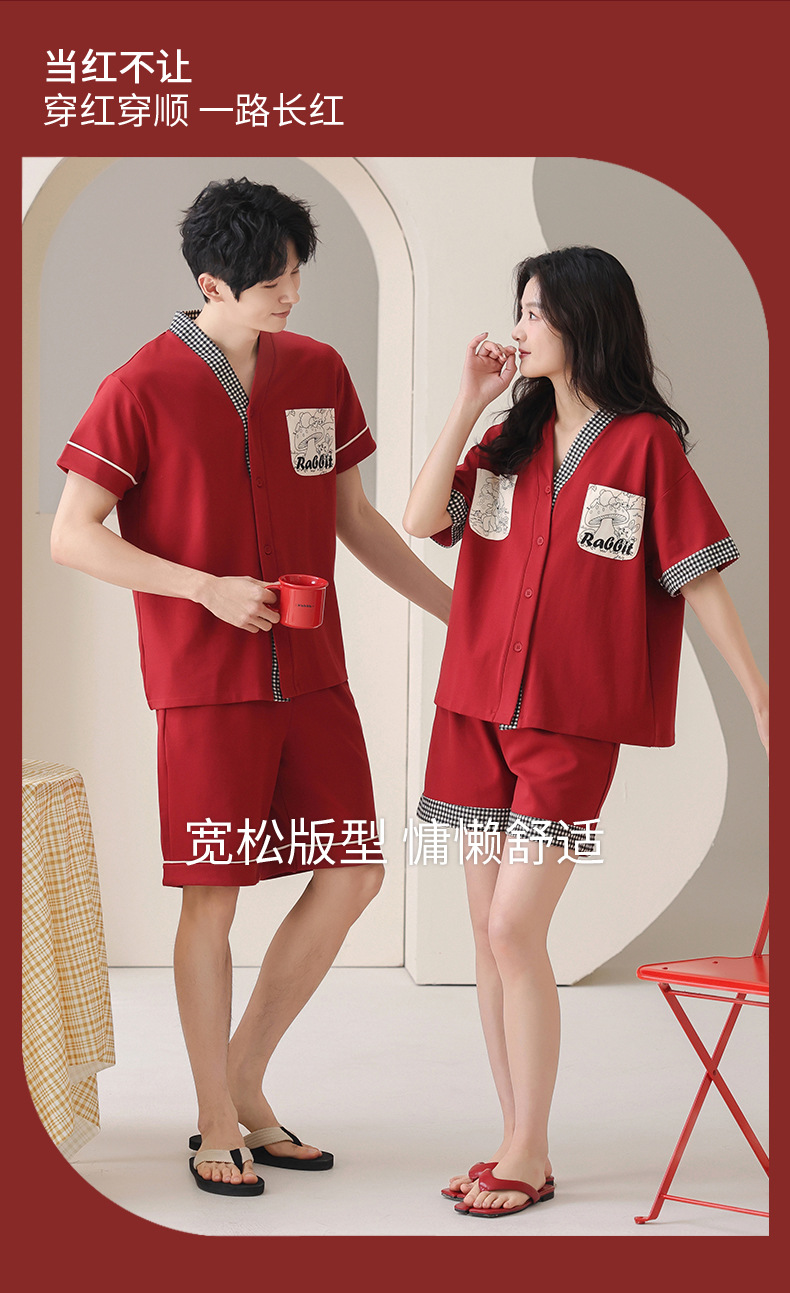 커플 잠옷 여름 코튼 반팔 웨딩 축제 년 레드 얇은 코튼 홈 의류 세트스토어 가기