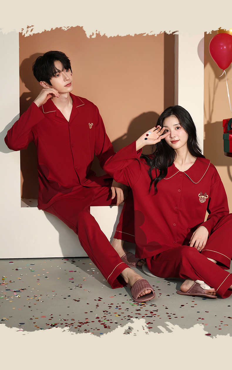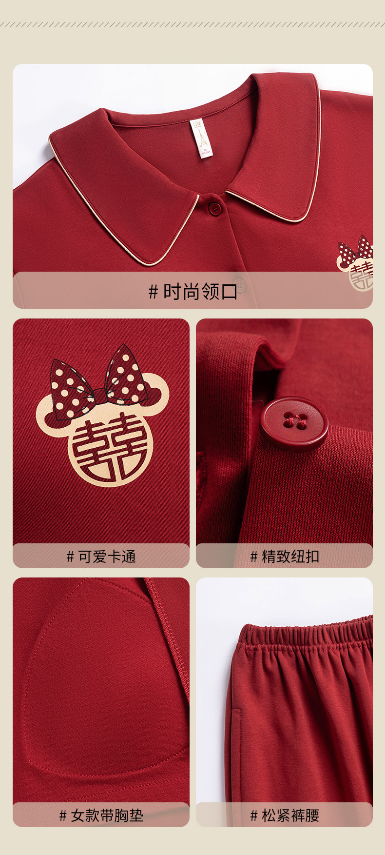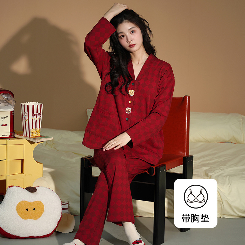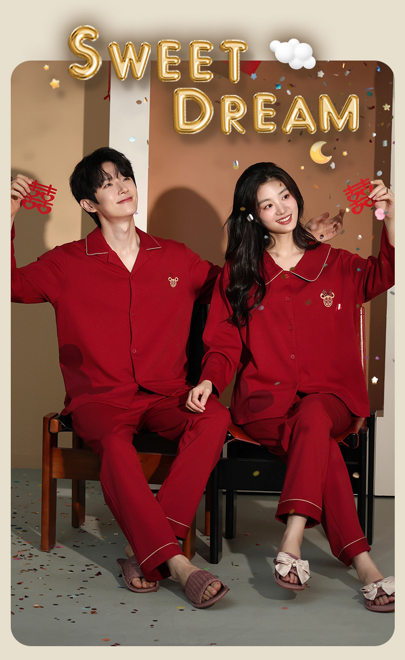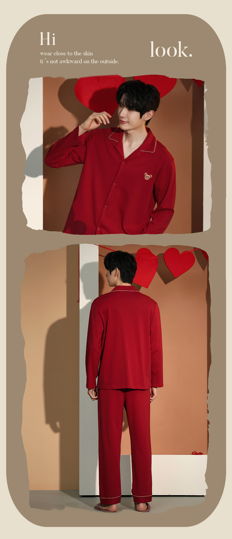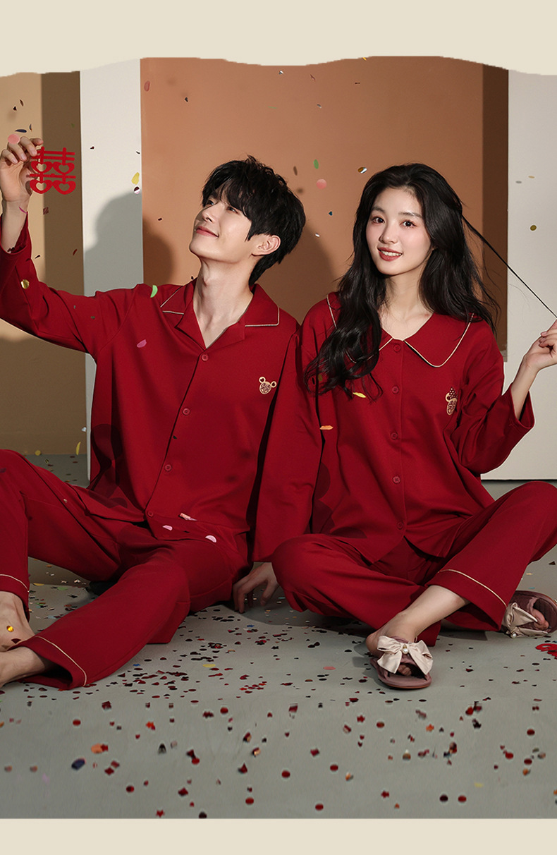 커플 파자마 여성 가슴 패드 신혼 결혼식 세트 큰 붉은 순면 긴 소매 홈 옷 봄과 가을