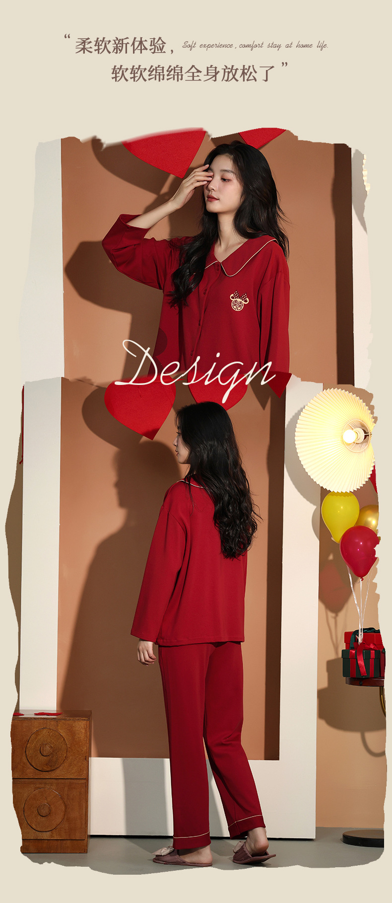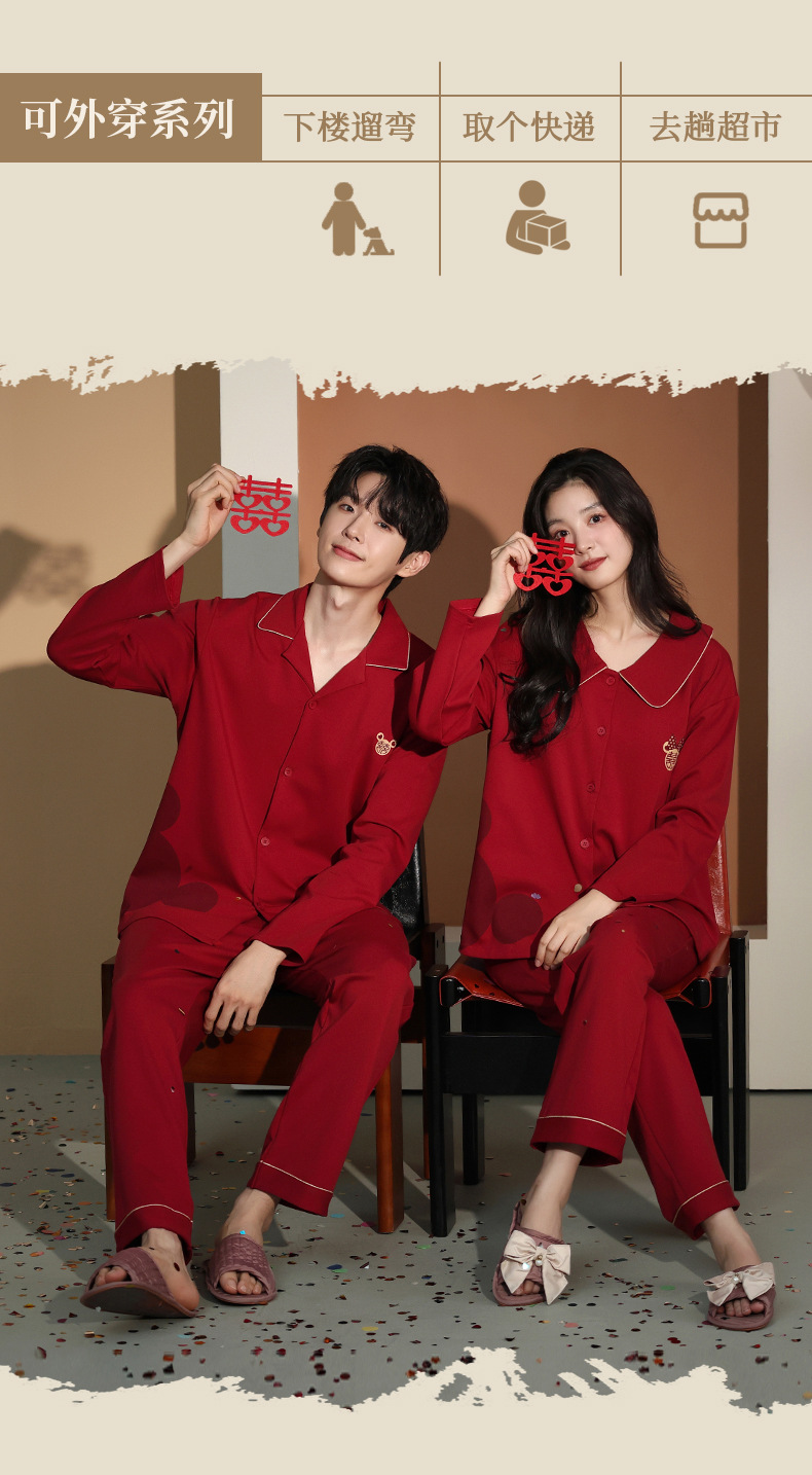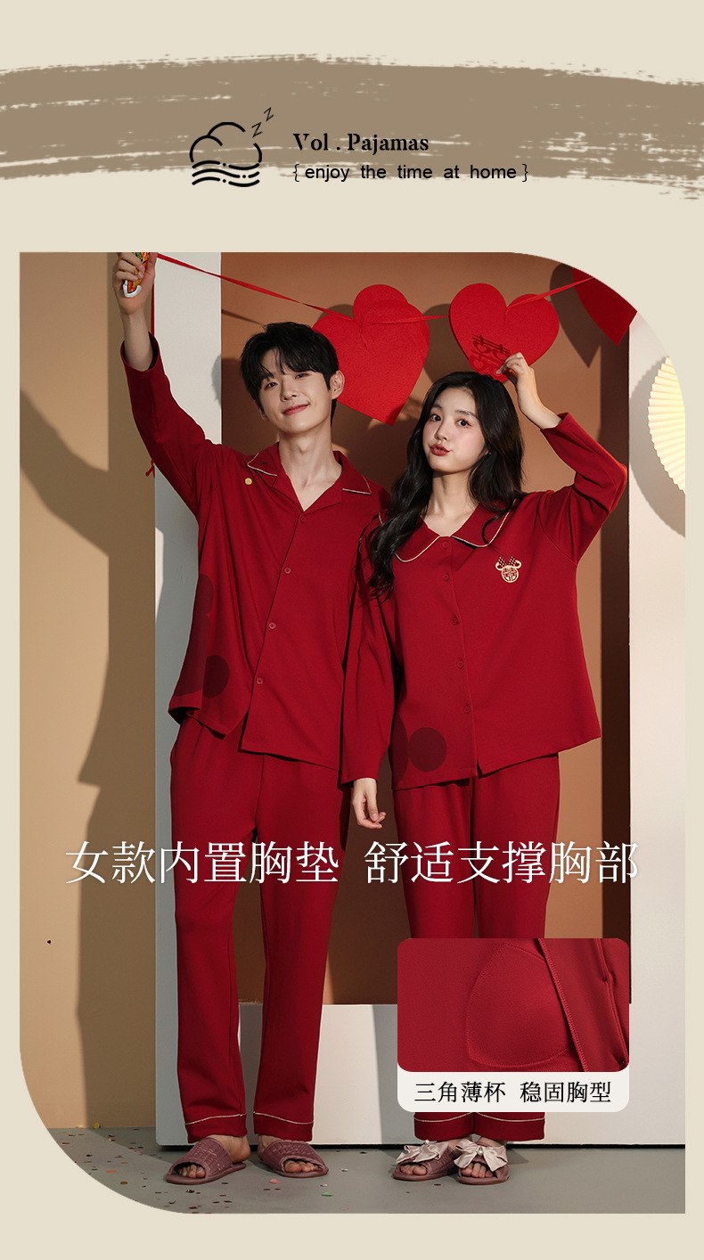 커플 파자마 여성 가슴 패드 신혼 결혼식 세트 큰 붉은 순면 긴 소매 홈 옷 봄과 가을스토어 가기