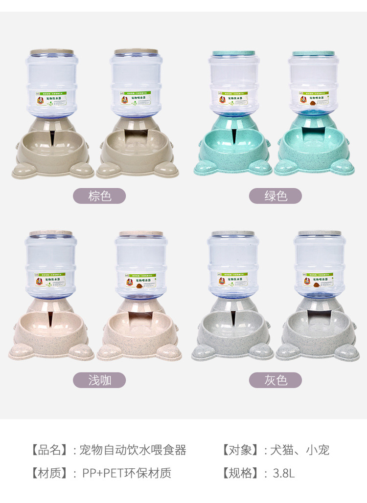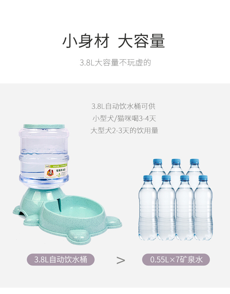 饮水器产品三大亮点:第一亮点3.8L灌水大容量饮水器3.8L相当于7瓶矿泉水。第二亮点健康环保材质,环保PP树脂材料达到食品塑胶级别安全放心材质杜决二次回收使用。第三亮点采用虹吸原理自动续水。紧密不露水的安全设计保证饮水在同意高度,能有效解决宠物喂水问题。