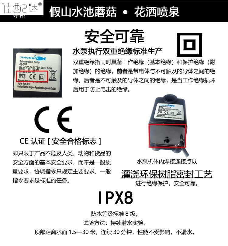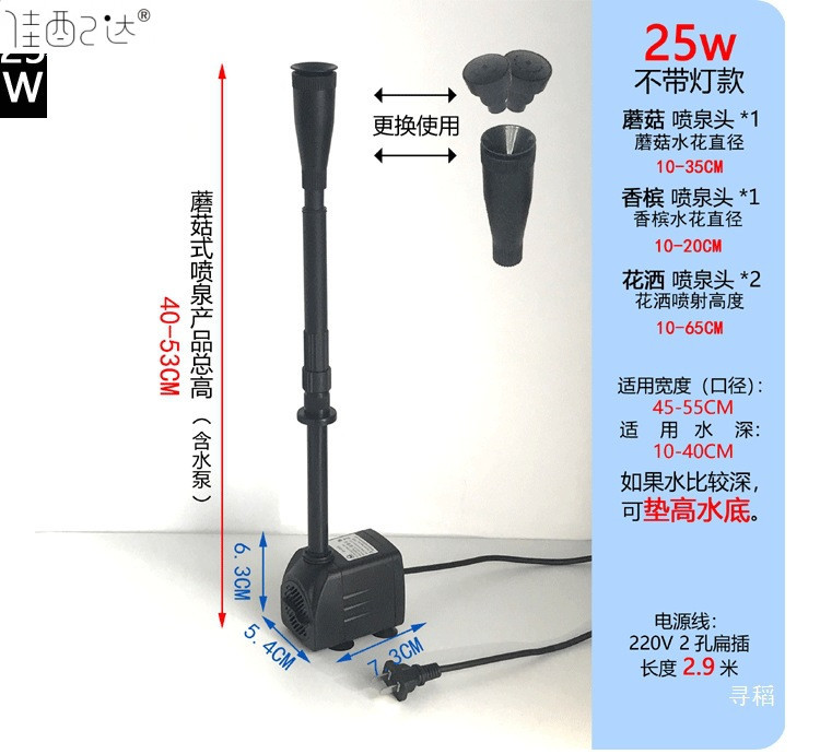 • 25W 워터 펌프(조명 포함) + 스트레치 분수 파이프 커버 소형 + 소형 램프 링 - 높이 40- 53cm