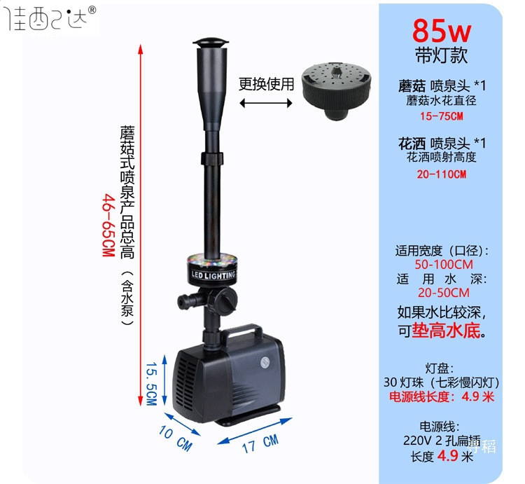 • 85W 워터 펌프 + 대형 스트레치 분수 파이프 커버 + 30LED 조명 링 - 높이 46- 65cm