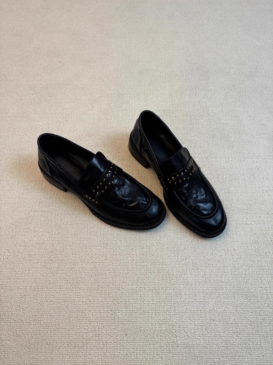Cowhide 버전 ~! Lefu 신발 여성 레트로 영국 스타일 라운드 헤드 리벳 주름 페달 블랙 가죽 신발스토어 가기
