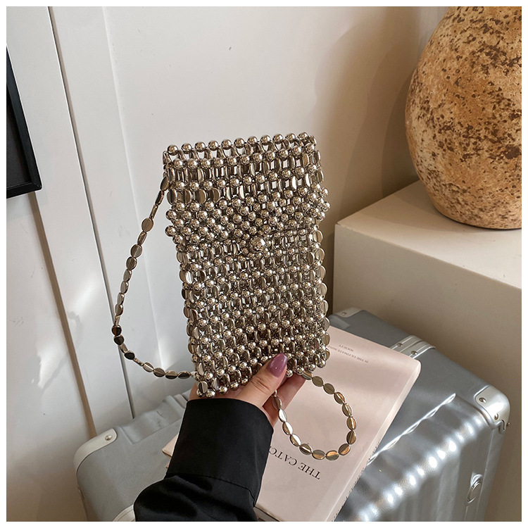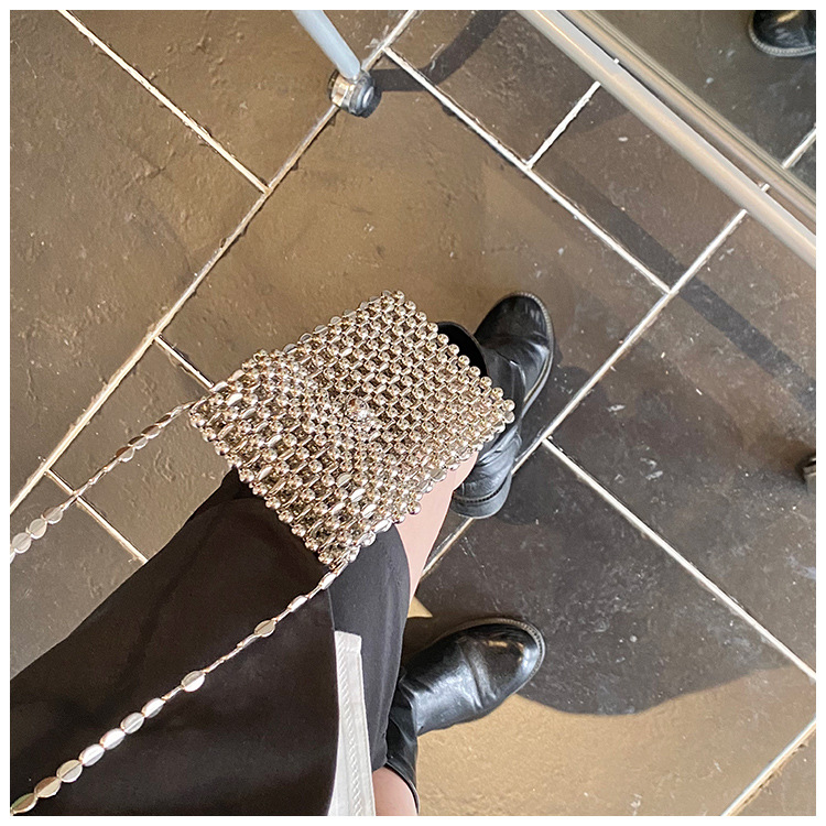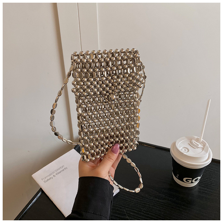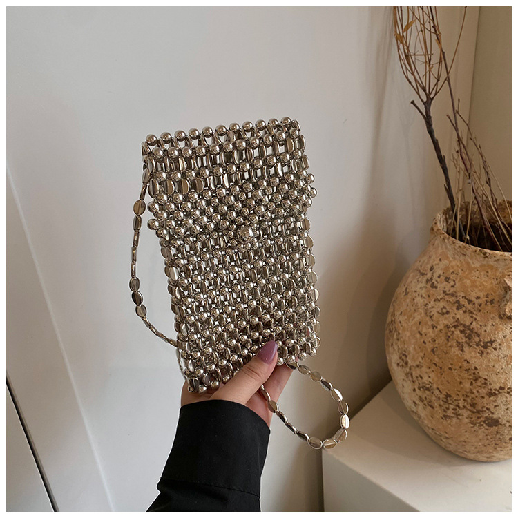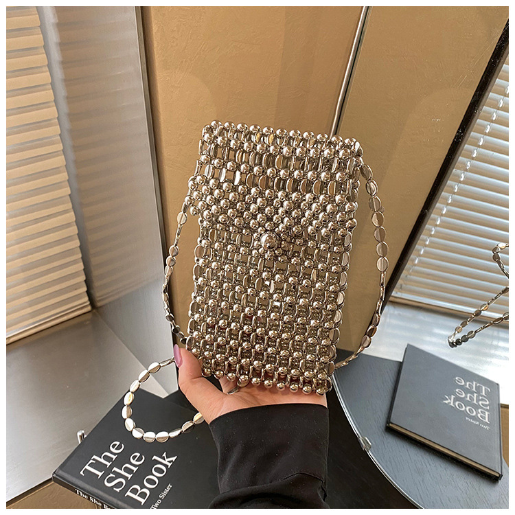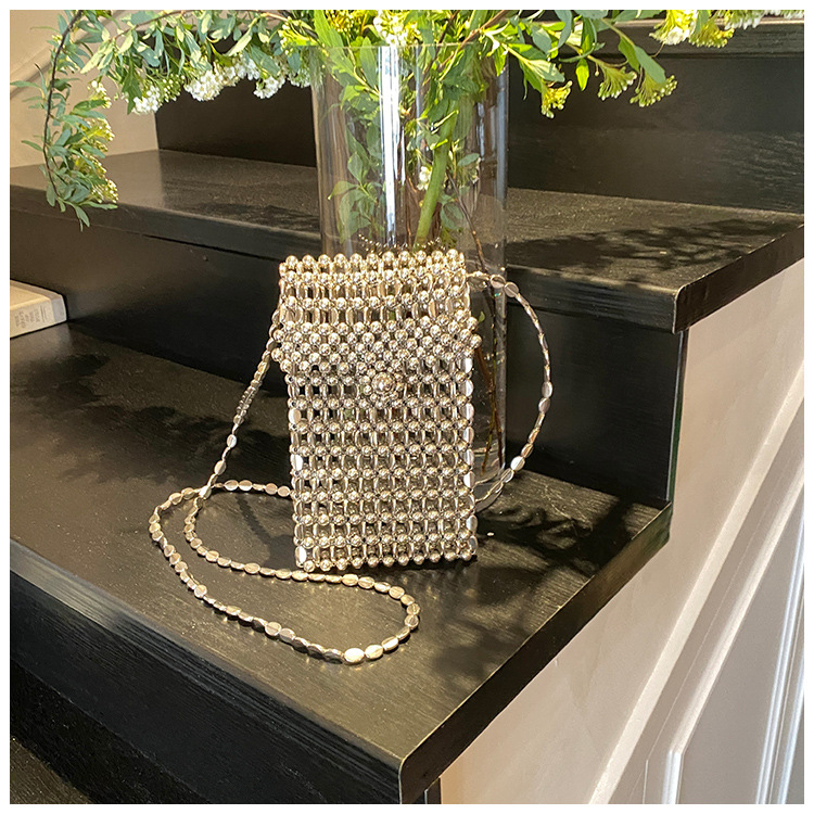 빈티지 금속 실버 반짝이는 수제 짠 구슬 진주 작은 광장 가방 휴대 전화 가방 긴 어깨 스트랩 크로스 바디 백스토어 가기