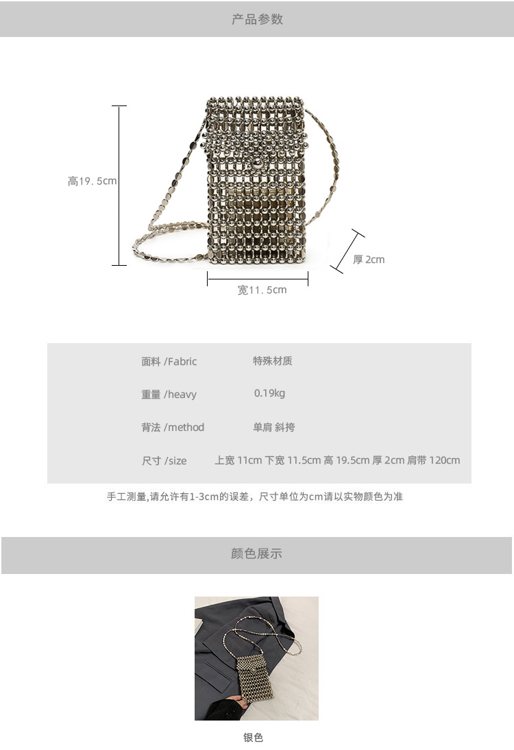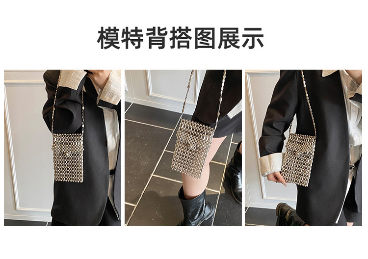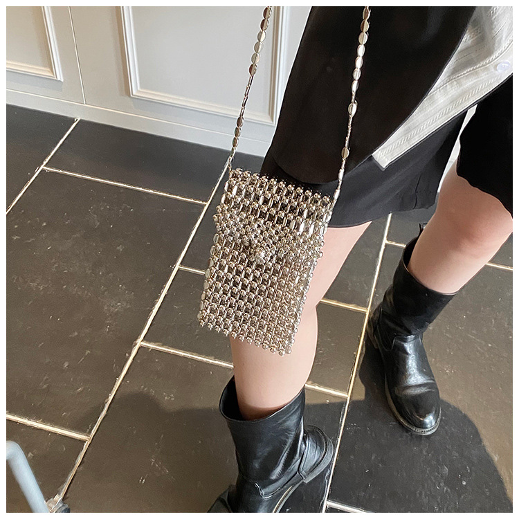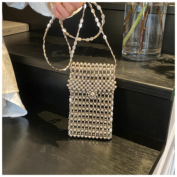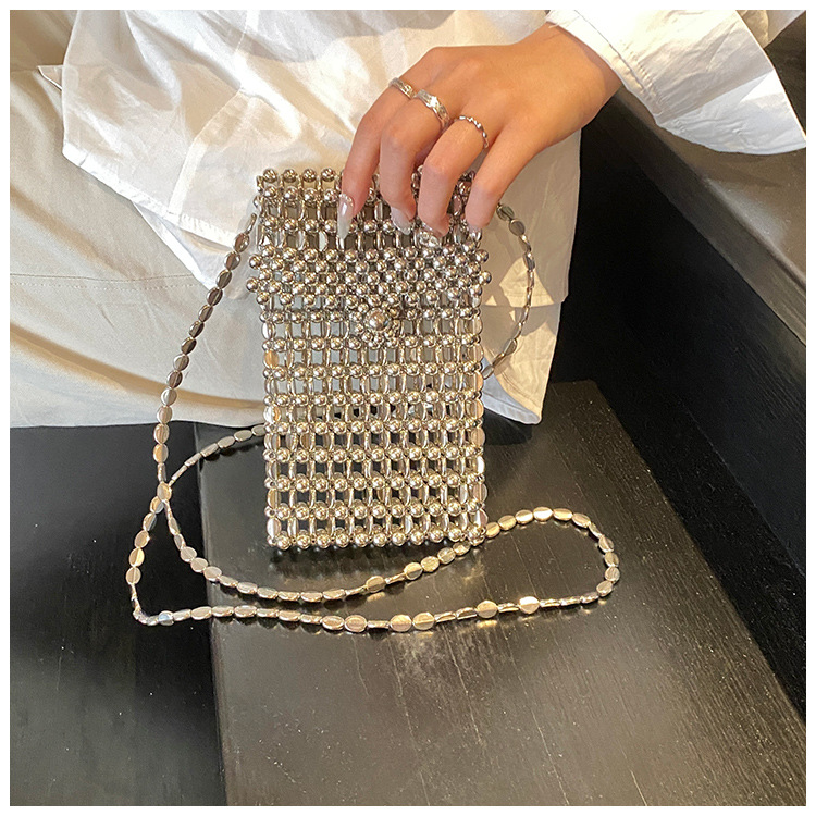 빈티지 금속 실버 반짝이는 수제 짠 구슬 진주 작은 광장 가방 휴대 전화 가방 긴 어깨 스트랩 크로스 바디 백