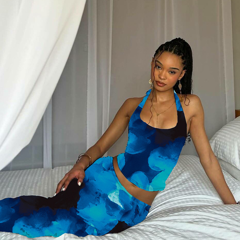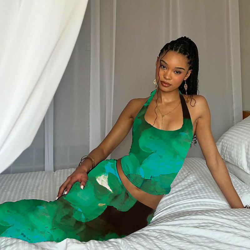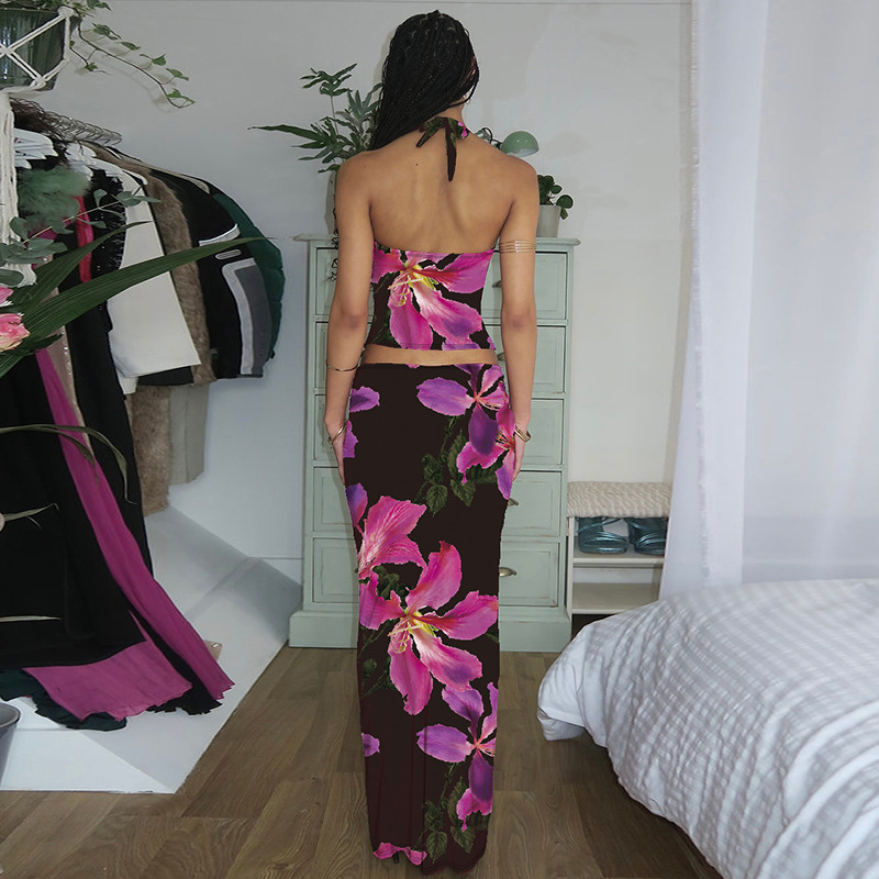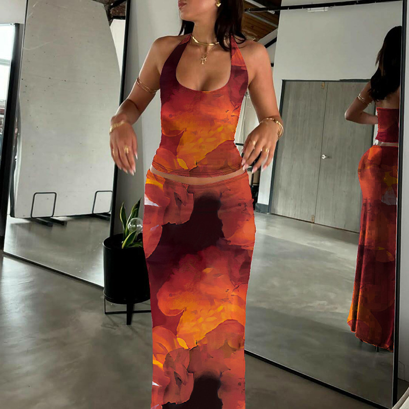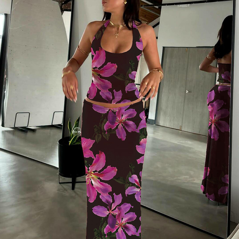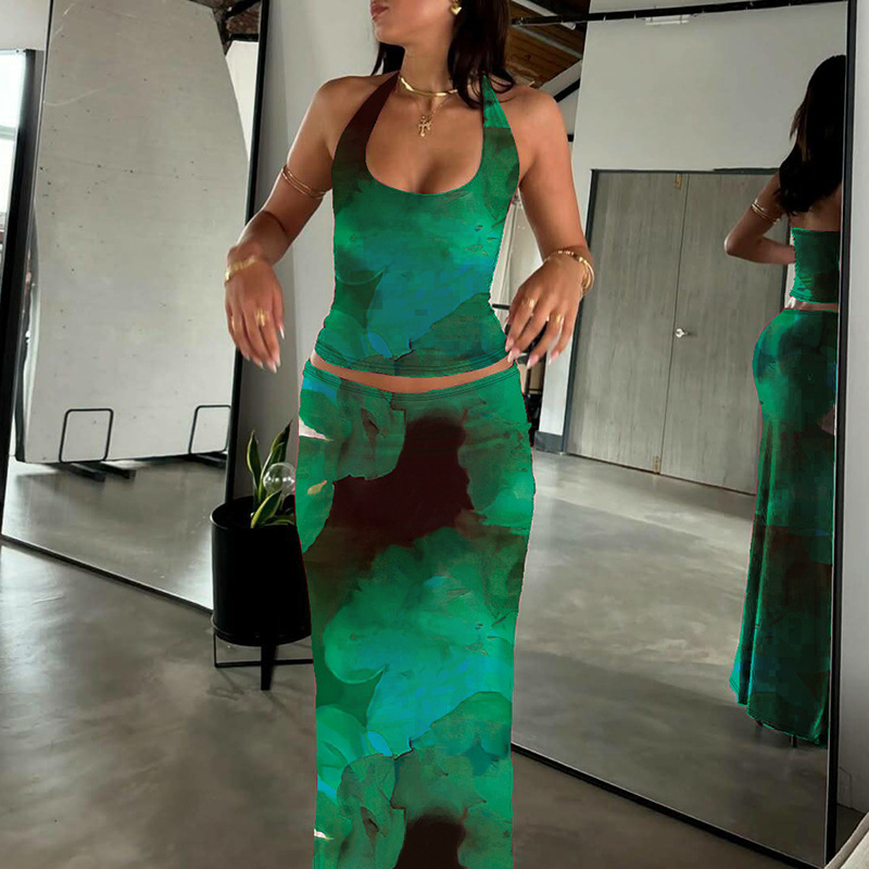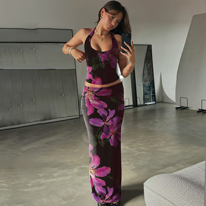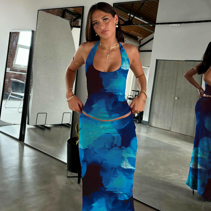 유럽과 미국 여성의 2025 여름 새로운 패션 인쇄 섹시한 U-넥 작은 조끼 슬림 스커트 세트 도매스토어 가기