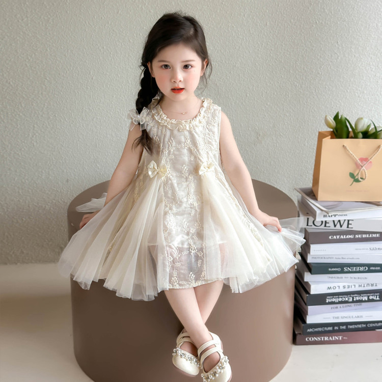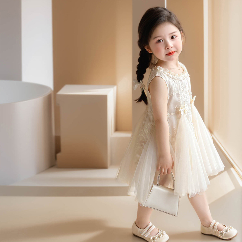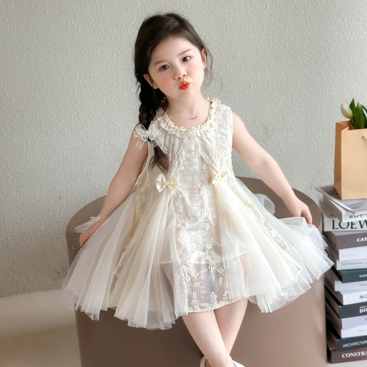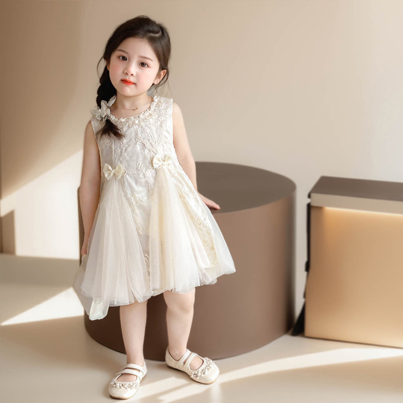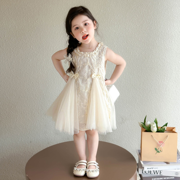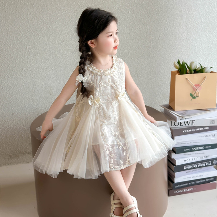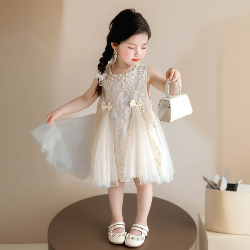 소녀의 활 원피스 2025 새로운 어린이 여름 스티칭 메쉬 공주 원피스 소녀의 Vat 원피스 트렌디