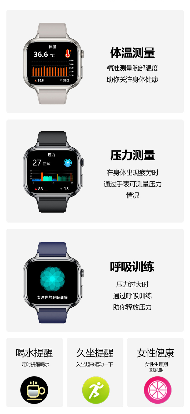 功能概述 | 1、蓝牙通话,语音助手,一键SOS救助 2、心电测量,HRV报告,APP分析结果 3、体脂BMI测量,身体成分分析 4、一键微体检,快速评估身体状况 5、五脏检测,时刻关注心、肝、脾、肺、肾 6、尿酸、血脂、血糖、体温、心率、血氧、血压、睡眠、压力测试 7、远程亲友关爱、多运动模式,自定义表盘 多表盘市场 其他功能:女性健康,呼吸训练,体温过高提醒,心率过高提醒,消息提醒、秒表、倒计时、计步、卡路里、距离、运动模式、来电提醒、闹钟提醒、久坐提醒、抬手亮屏、社交分享(微信、QQ、Facebook、Twitter)等,摇摇拍照、音乐控制、喝水提醒、吃药提醒、接入微信运动、苹果健康 |