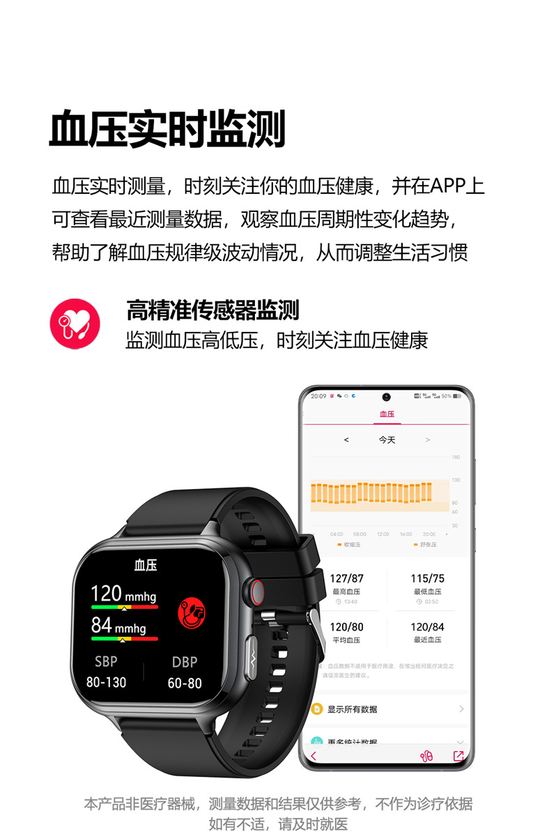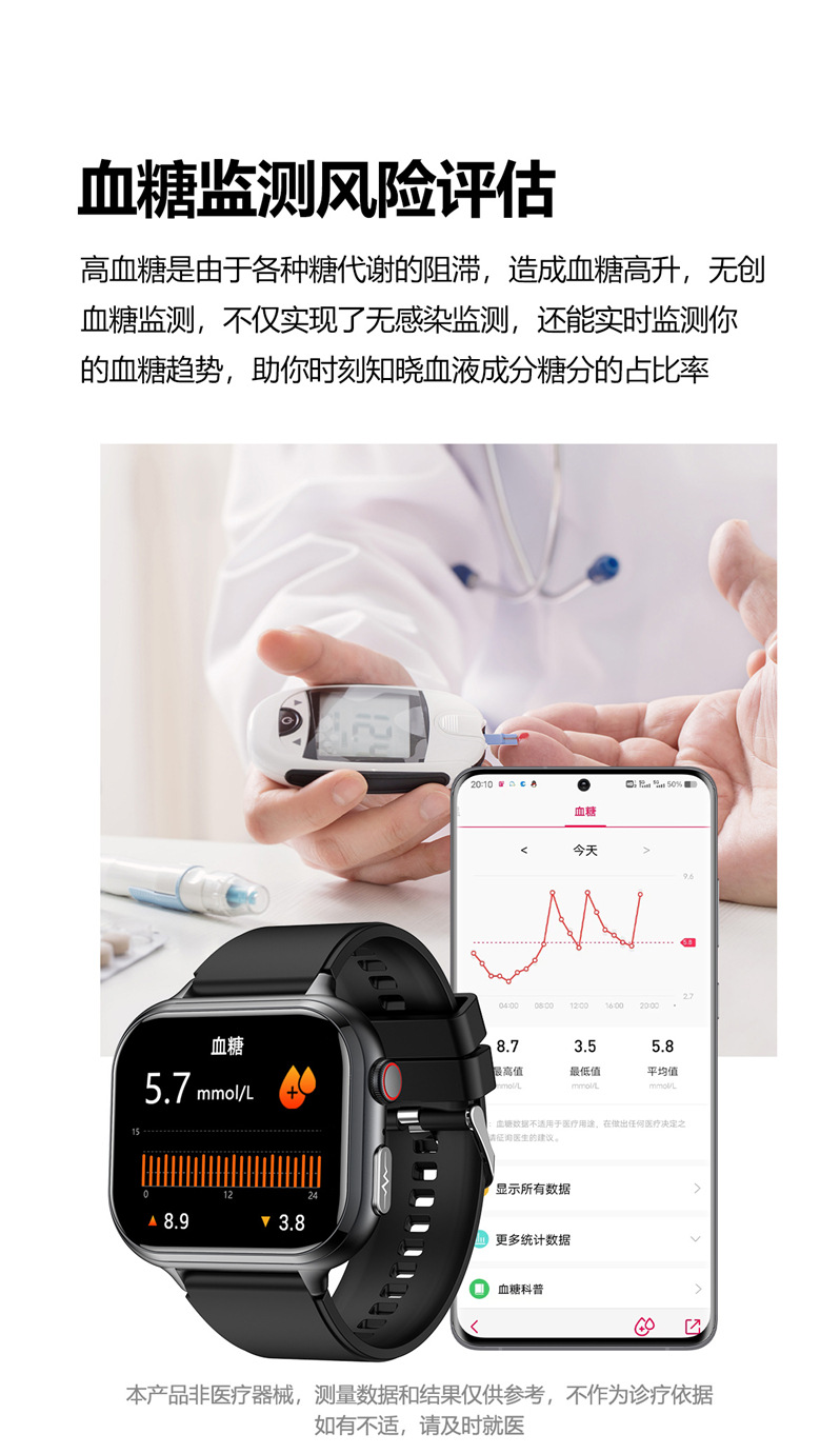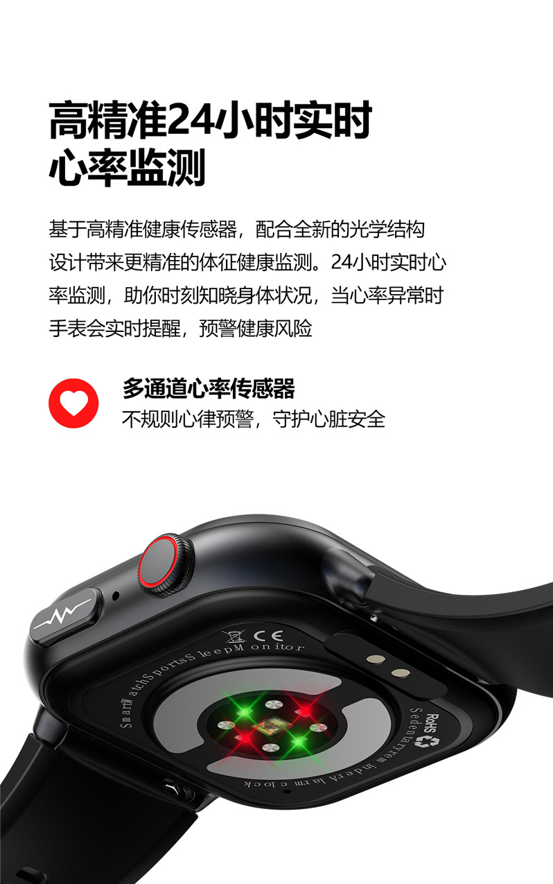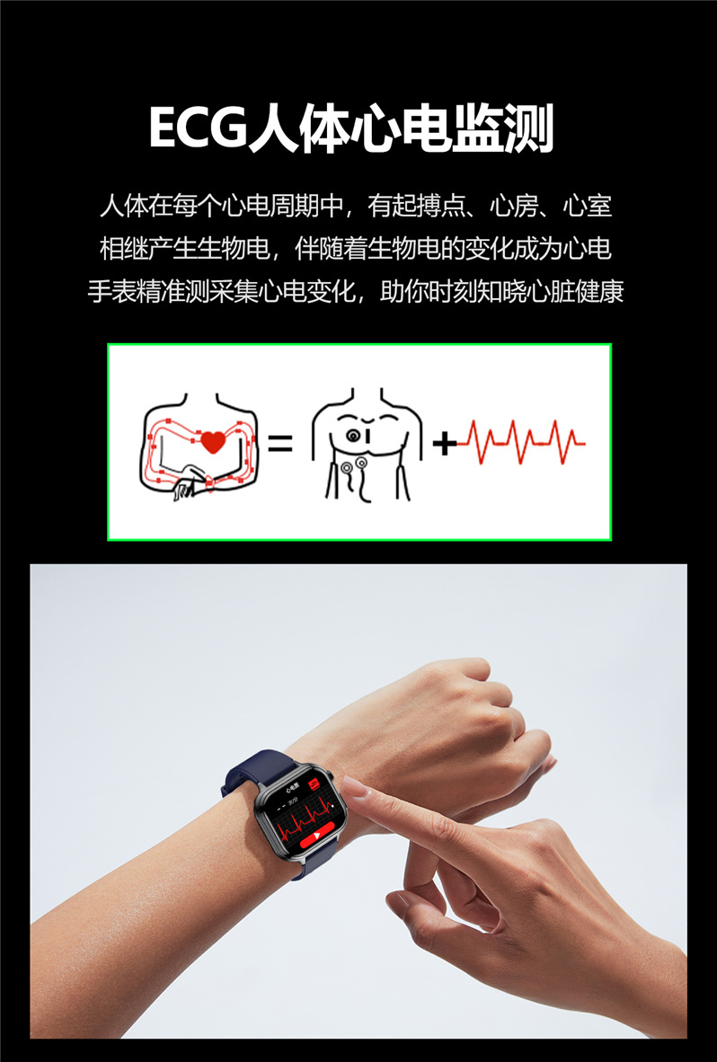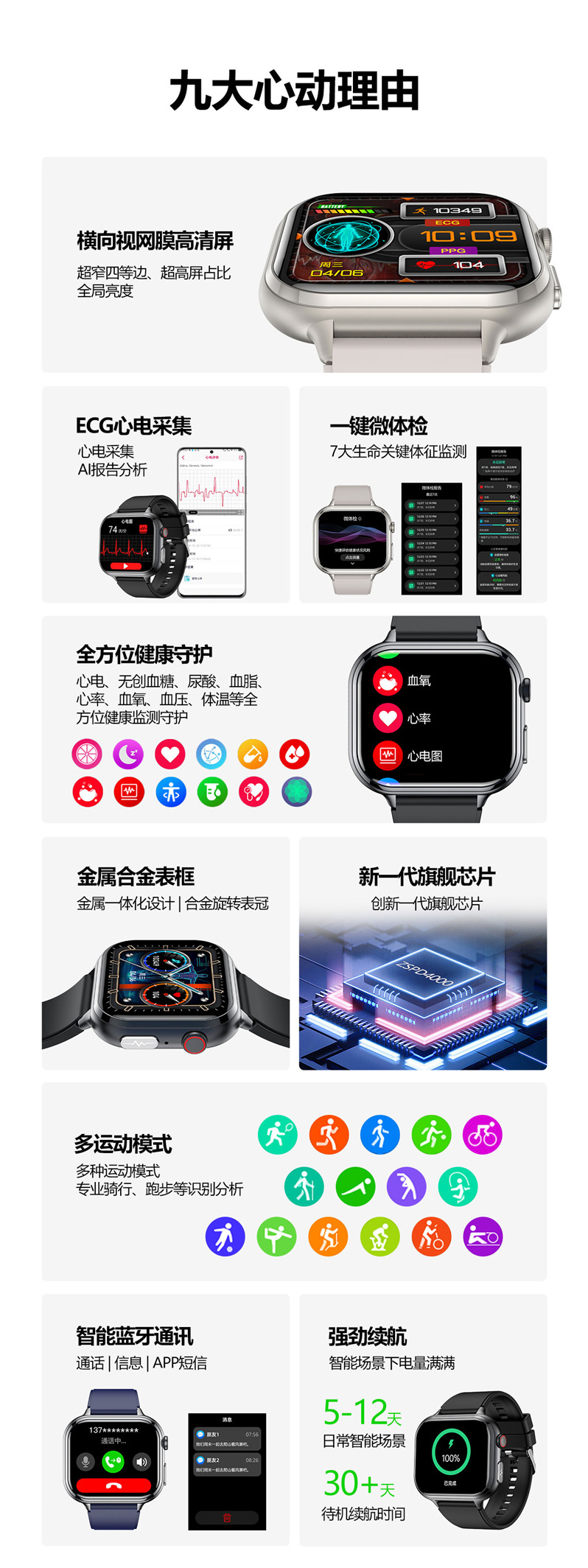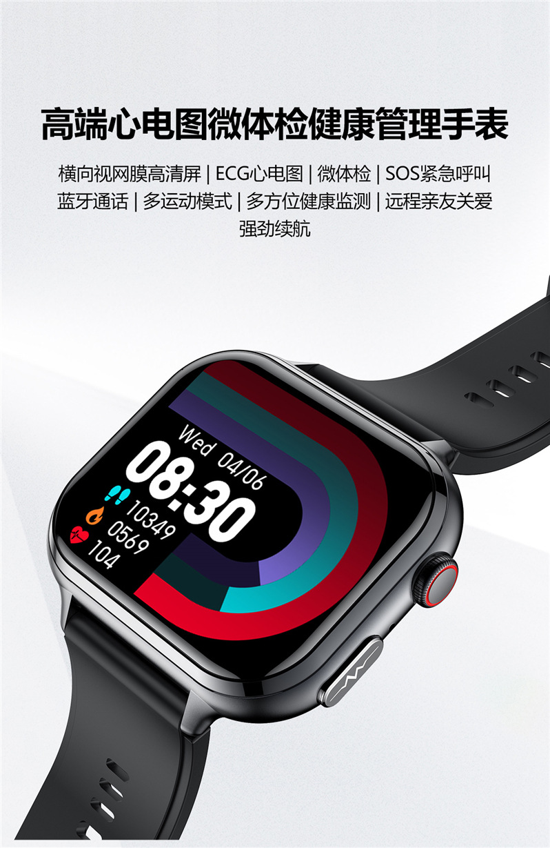 Features | Micro physical examination function (one click physical examination), five organ detection 1. Blood glucose monitoring/uric acid monitoring/blood lipid monitoring 2. ECG electrocardiogram 3. Body fat BMI measurement 4. Bluetooth call, intelligent voice assistant 5. Remote care for family and friends, multiple sports modes 6. 24-hour continuous dynamic heart rate monitoring (with live monitoring function), temperature monitoring, pressure testing, independent and accurate blood oxygen, blood pressure monitoring, sleep monitoring and other health monitoring functions 7. 1.91-inch horizontal retina 320 * 380 full touch high-definition screen 8. APP multi dial market and custom dial 9. Women's health, weather forecast, sedentary reminders, messages, phone calls, and other information reminders 10.380mAh high-density polymer lithium battery, with a single charge and a battery life of 10-15 days |