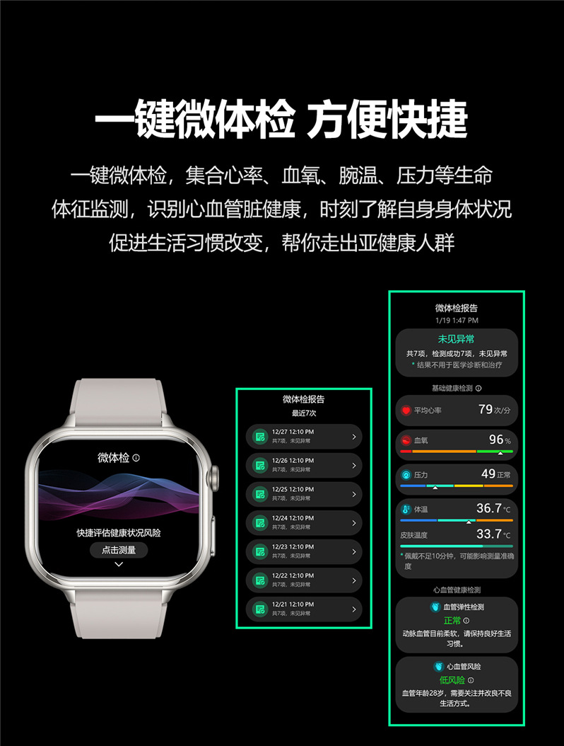 特色 | 微体检功能(一键体检),五脏检测 1. 血糖监测/尿酸监测/血脂监测 2. ECG心电图 3. 体脂BMI测量 4. 蓝牙通话,智能语音助手 5. 远程亲友关爱,多运动模式 6. 24小时连续动态心率监测(带活体检测功能),体温监测,压力测试,独立精准血氧,血压监测,睡眠监测等健康监测功能 7. 1.91英寸横向视网膜320*380全触摸高清屏 8. APP多表盘市场及自定义表盘 9.女性健康,天气预报,久坐提醒,消息、来电等信息提醒 10.380mAh高密度聚合物锂电池,一次充电使用续航10天-15天 |
