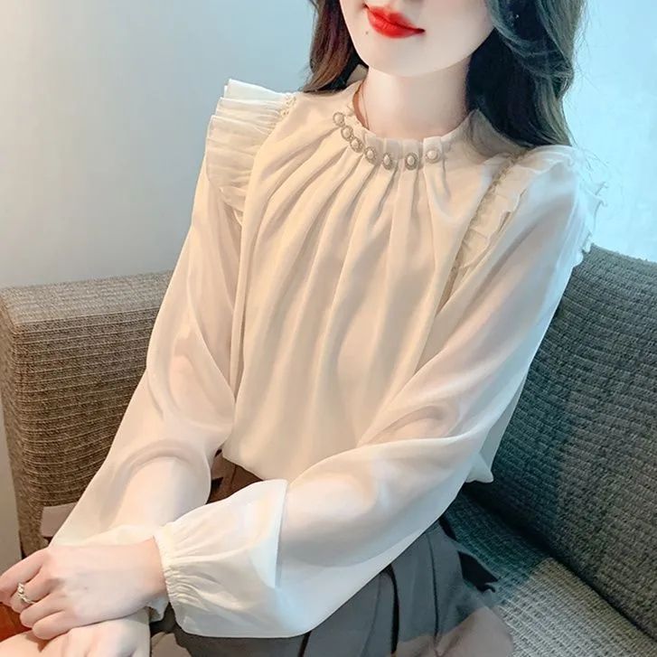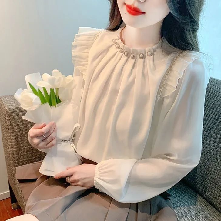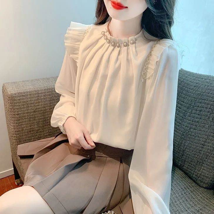 2025 봄 신작 플러스 사이즈 쉬폰 탑 긴팔 프렌치 스타일 여성 의류 러플 디자인 기질 셔츠스토어 가기