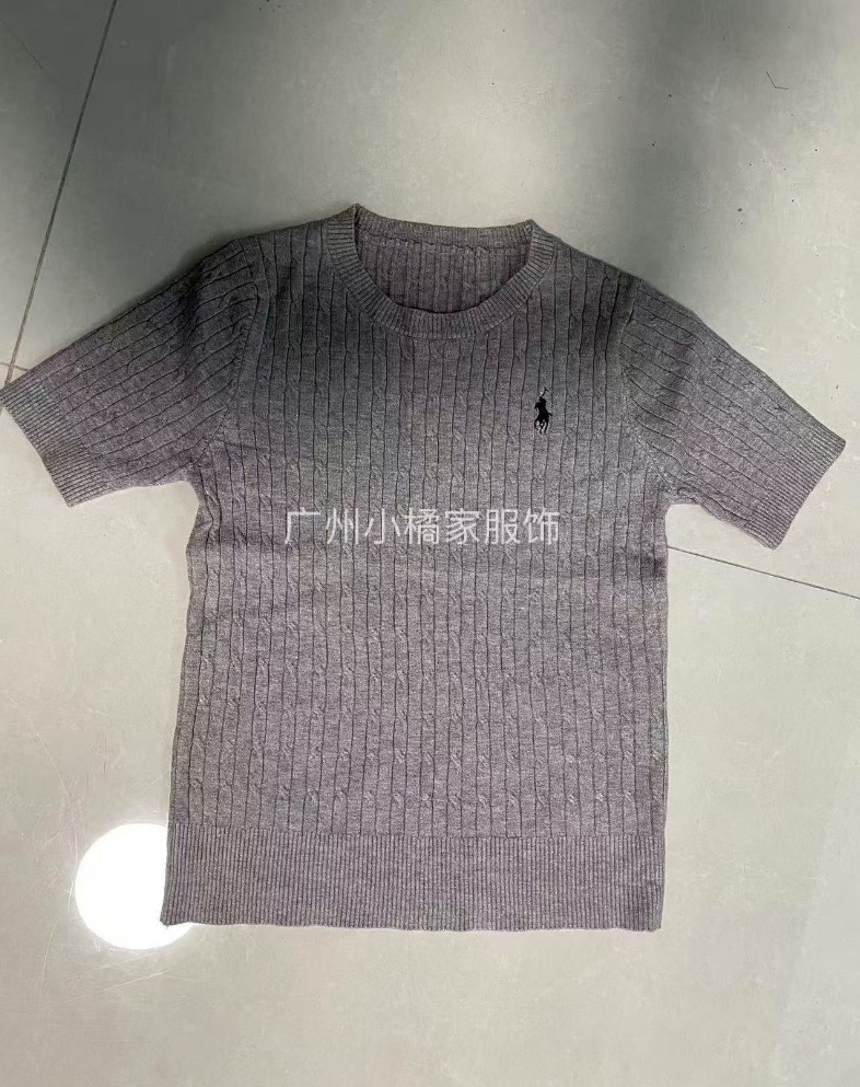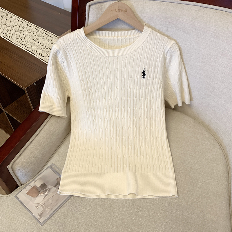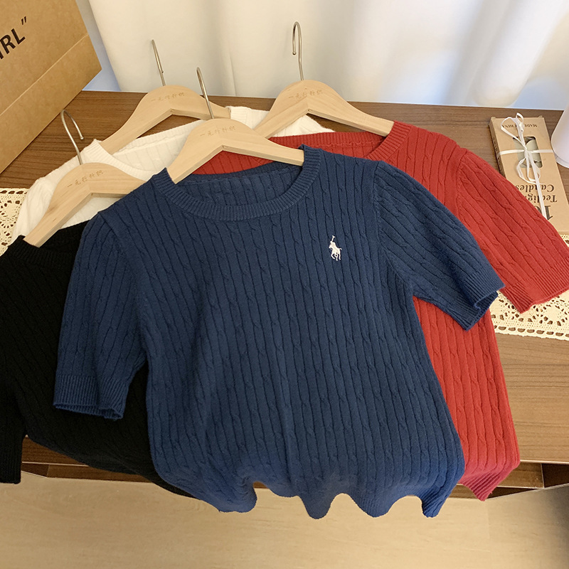 부드러운 왁스 피부 친화적 인 트위스트 포니 자수 트위스트 니트 셔츠 여성용 반팔 봄 및 여름 통기성 코튼 빈티지 올매치 탑