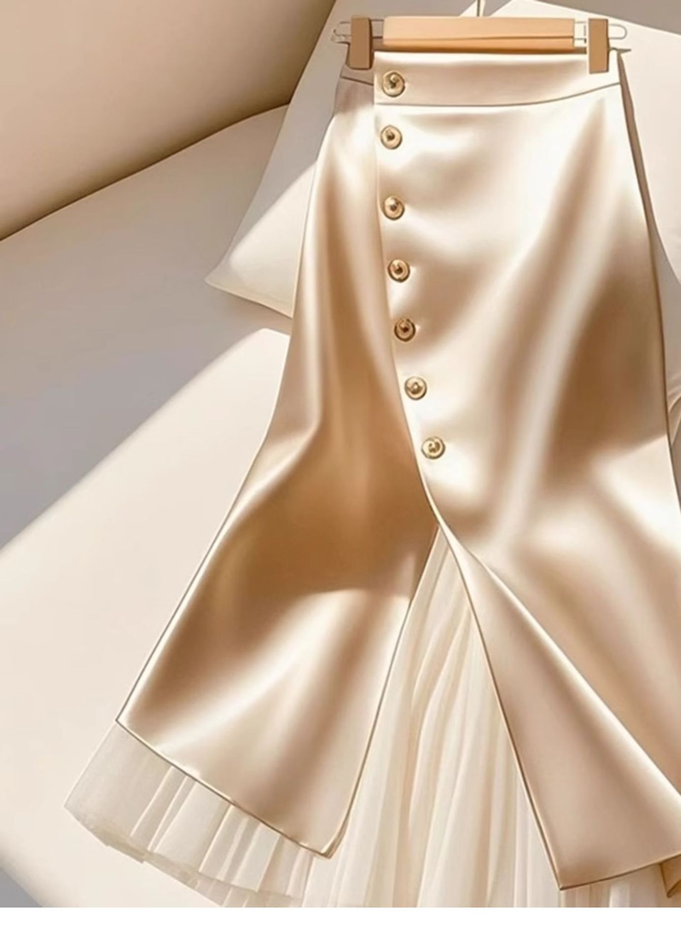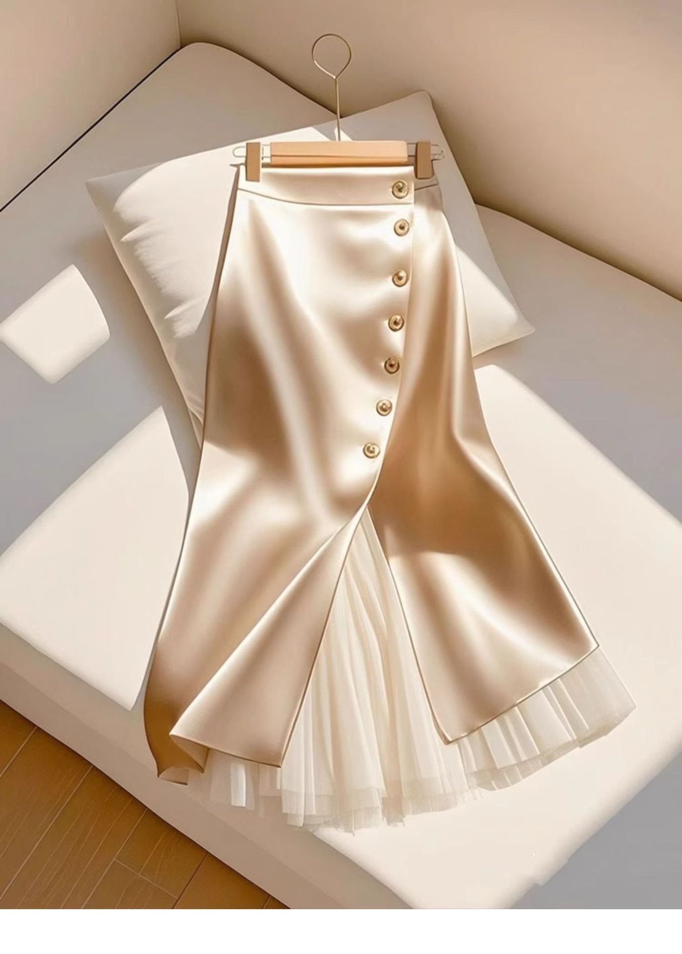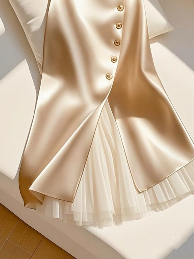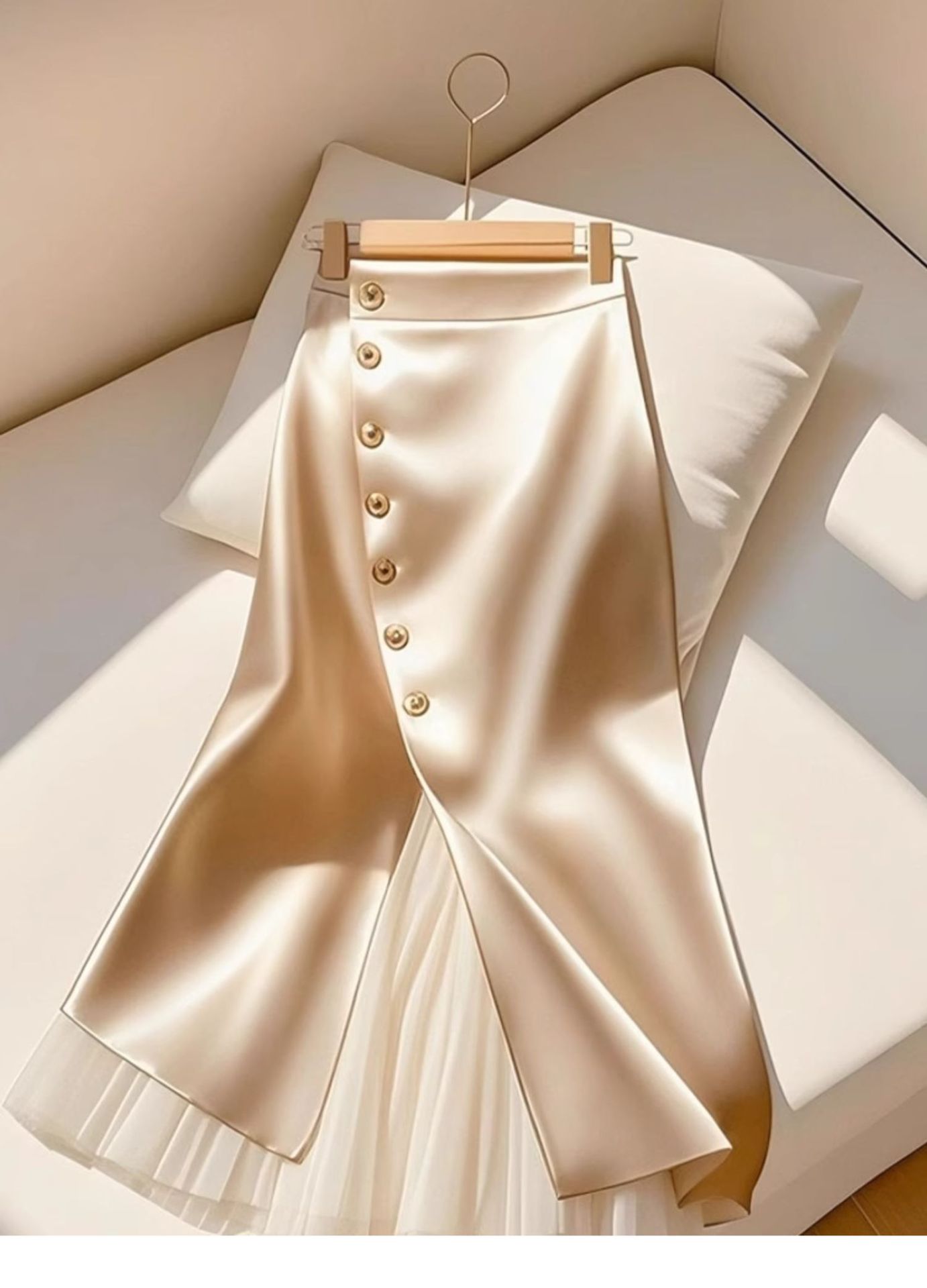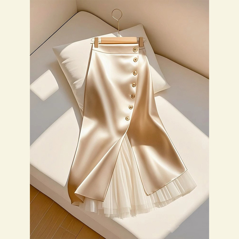 2025 올해 인기있는 고급 슈퍼 잘 생긴 살구색 바느질 아세테이트 새틴 A 자형 대형 스커트 스커트 여성용 봄스토어 가기