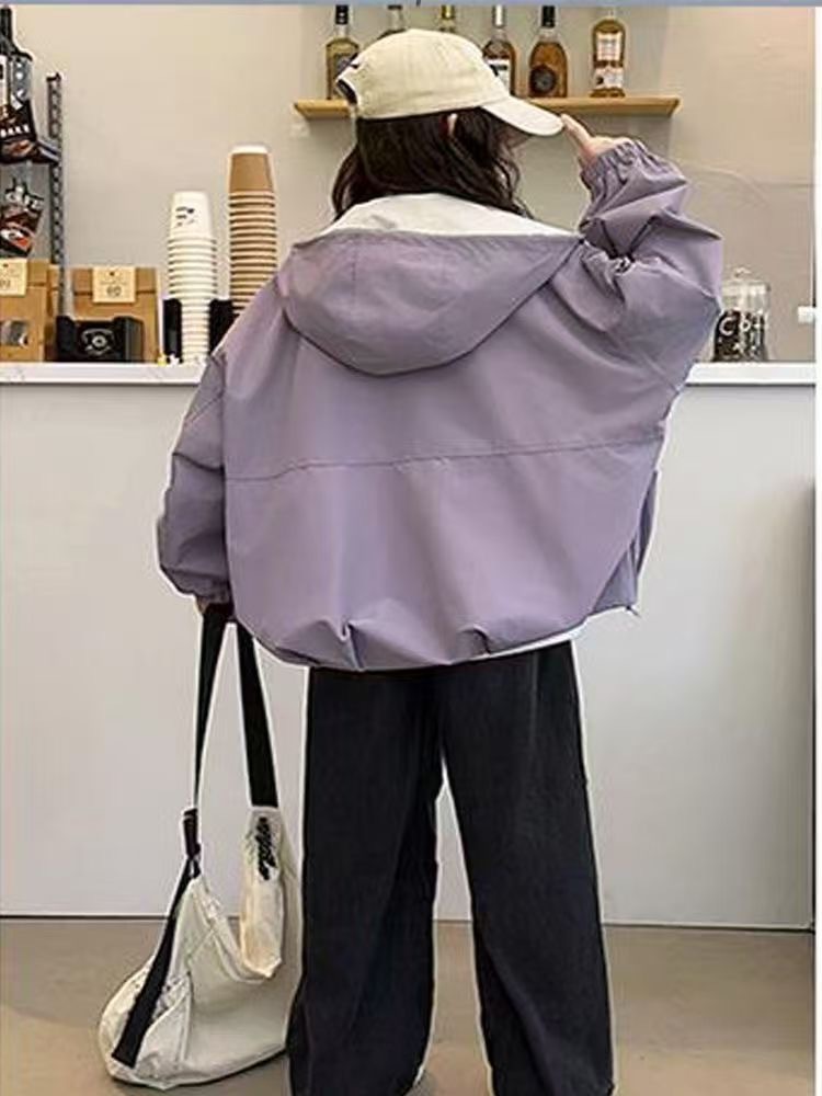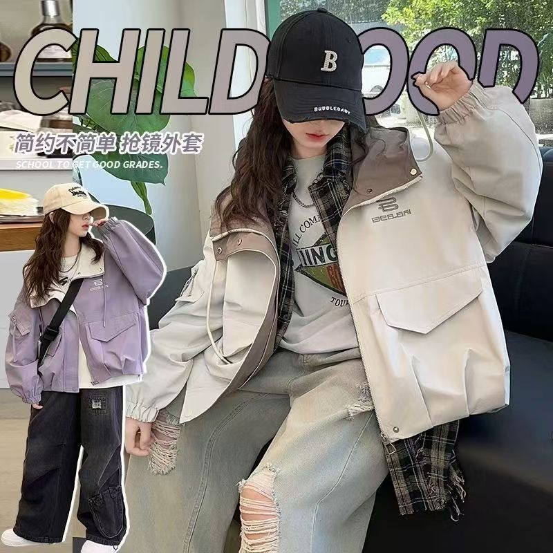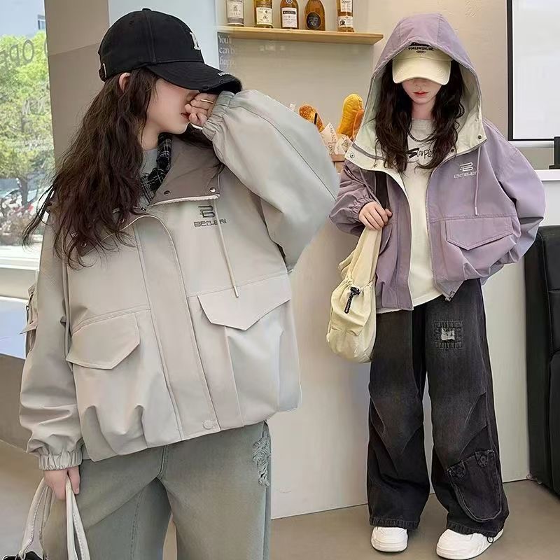 여자 봄, 가을 대형 포켓 작업 재킷 2025 새로운 중대형 아동 패션 캐주얼 후드 재킷 재킷 유행
