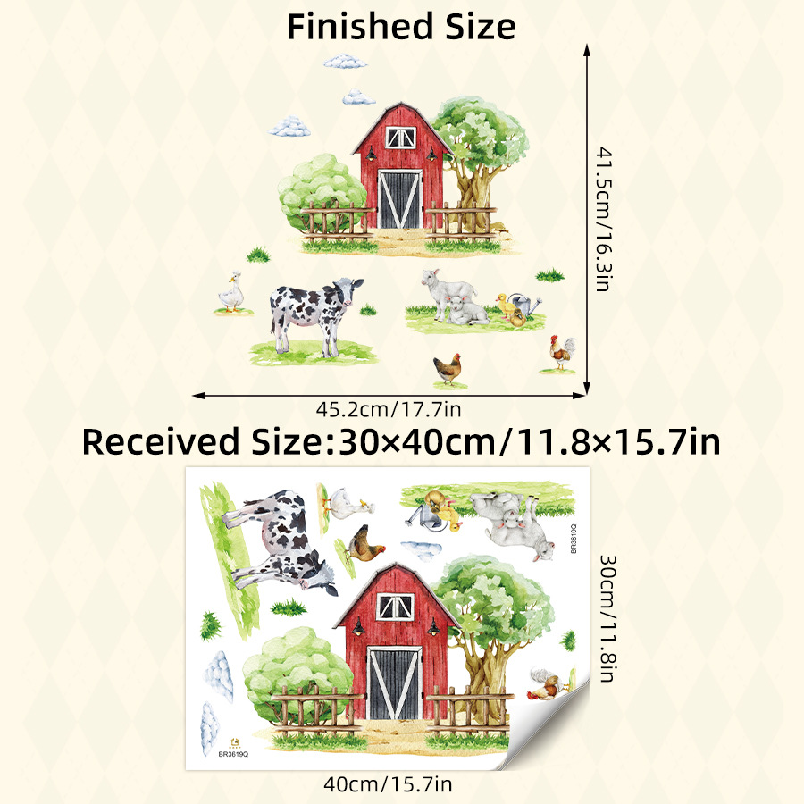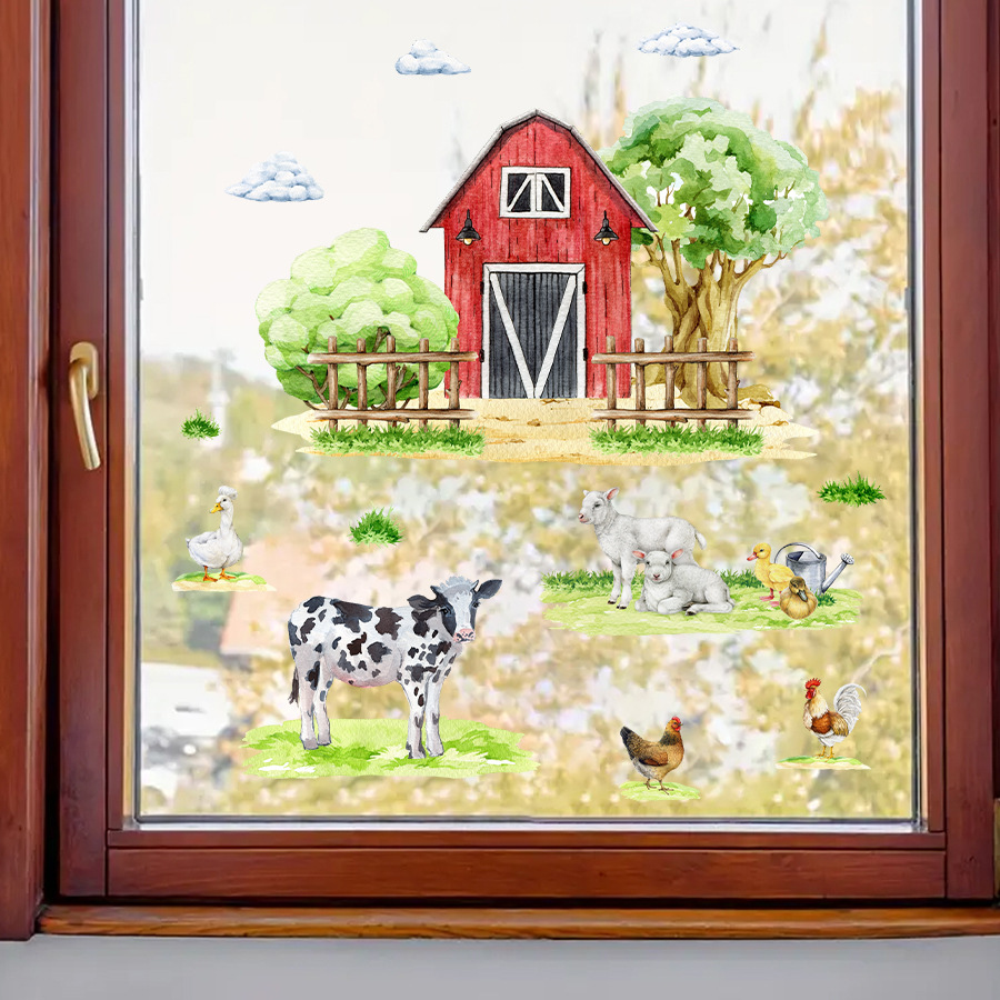 BR3619Q 만화 빨간 집 농장 젖소 양 자체 접착 창 스티커 양면 시각적 어린이 방 장식 스티커