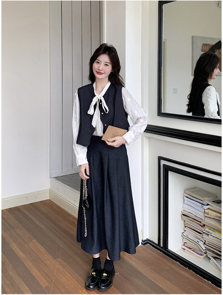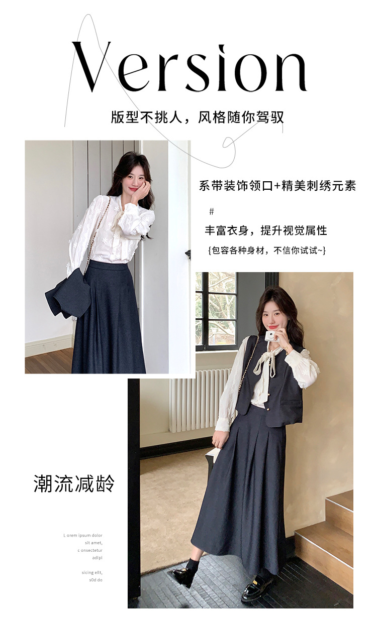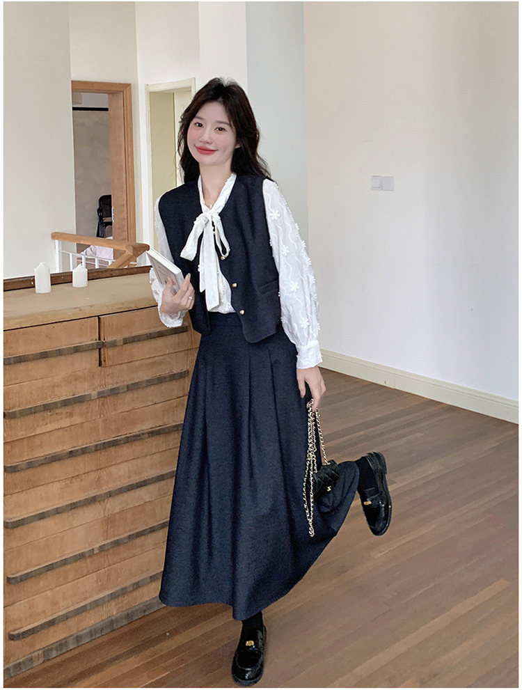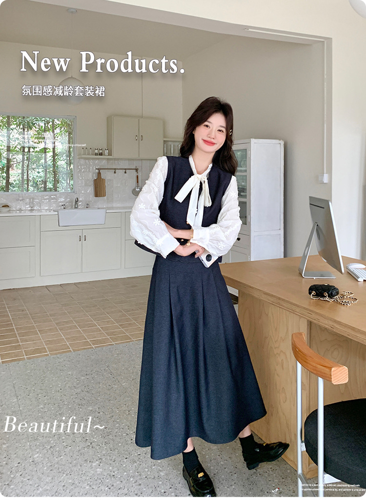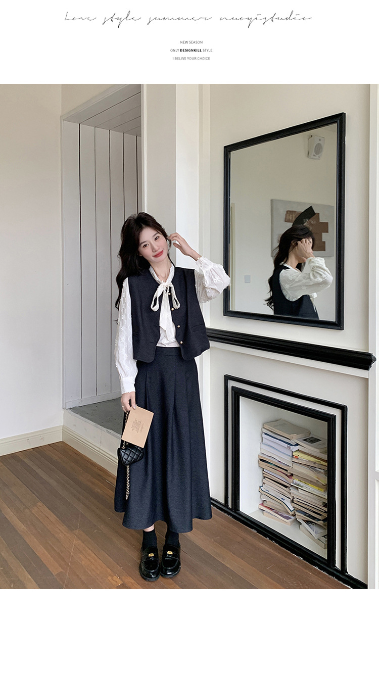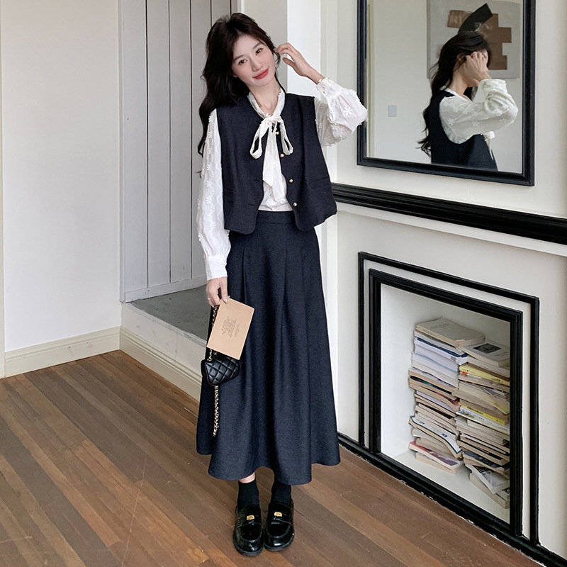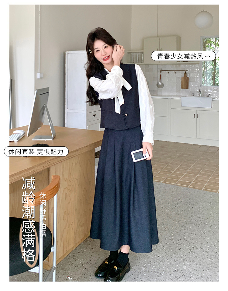 [Mengmei] 25 봄 느낌 Fa Xiaoxiang 스타일 활 셔츠 조끼 스커트 3 종 세트 여성 고급 세트