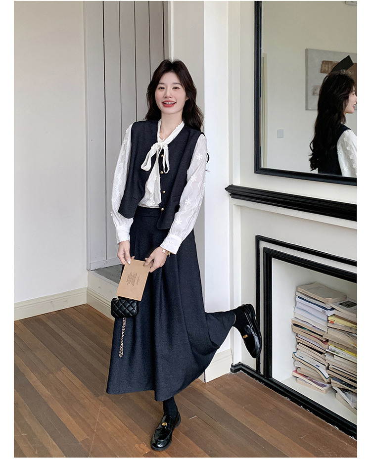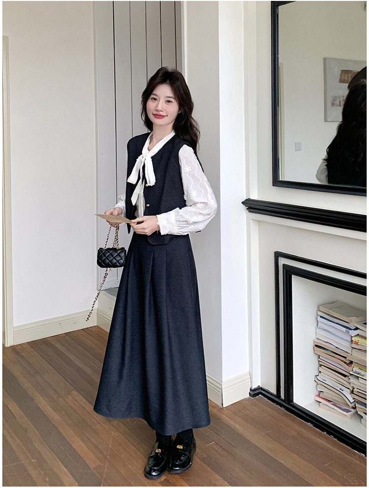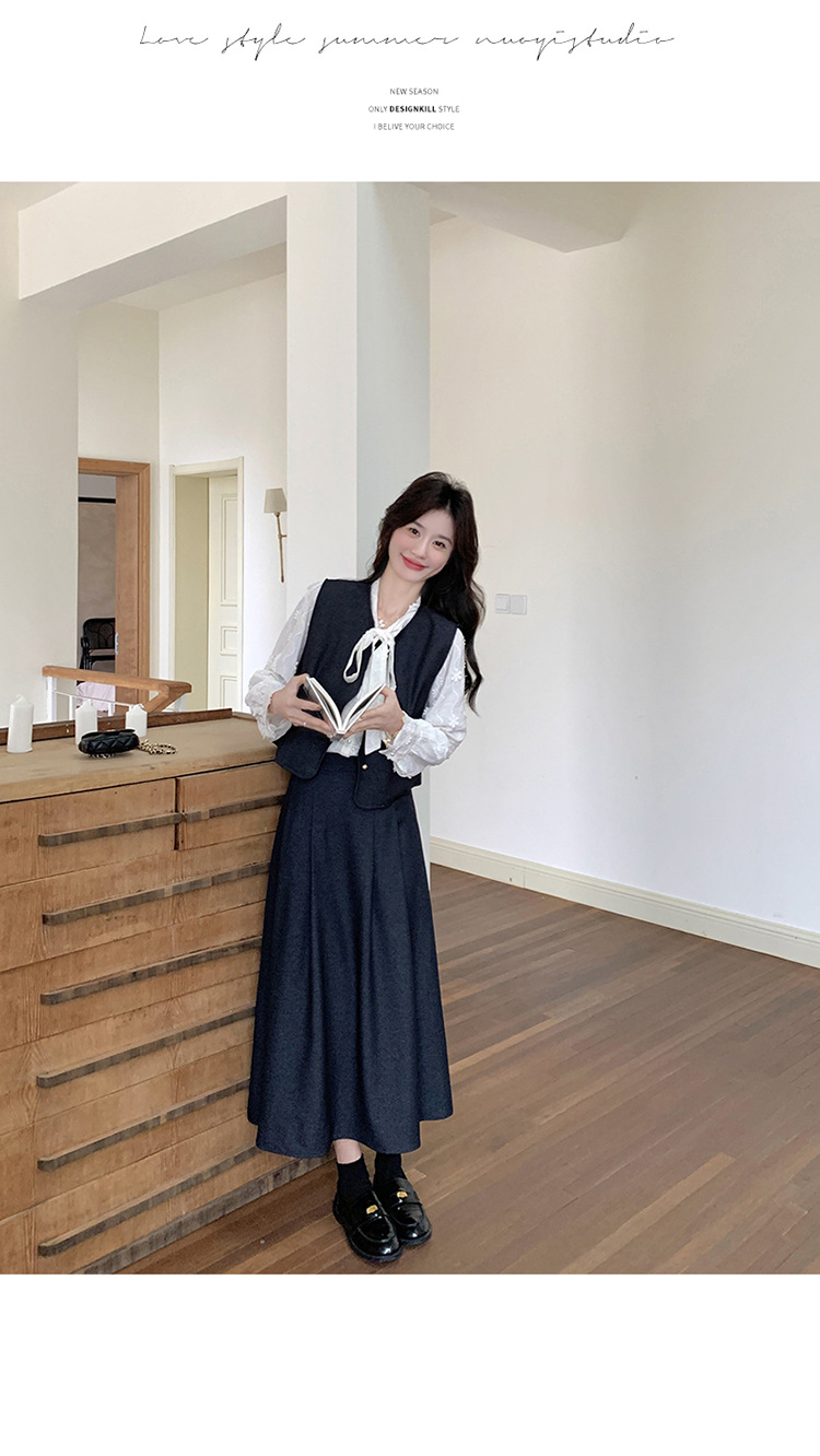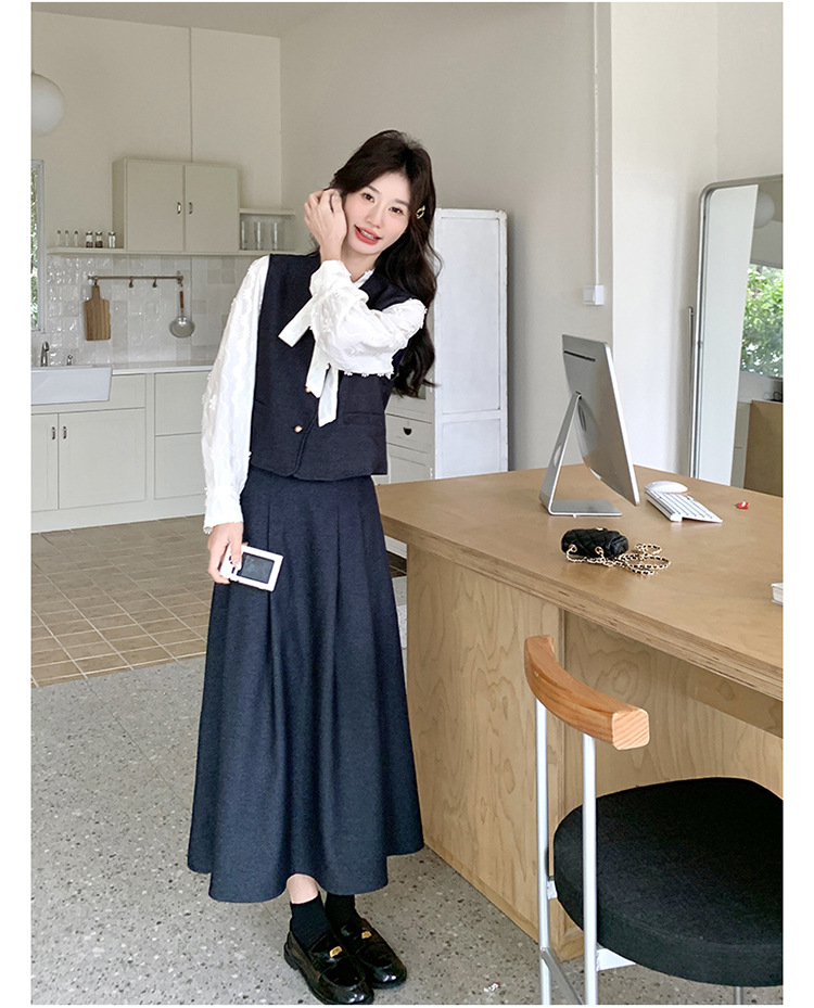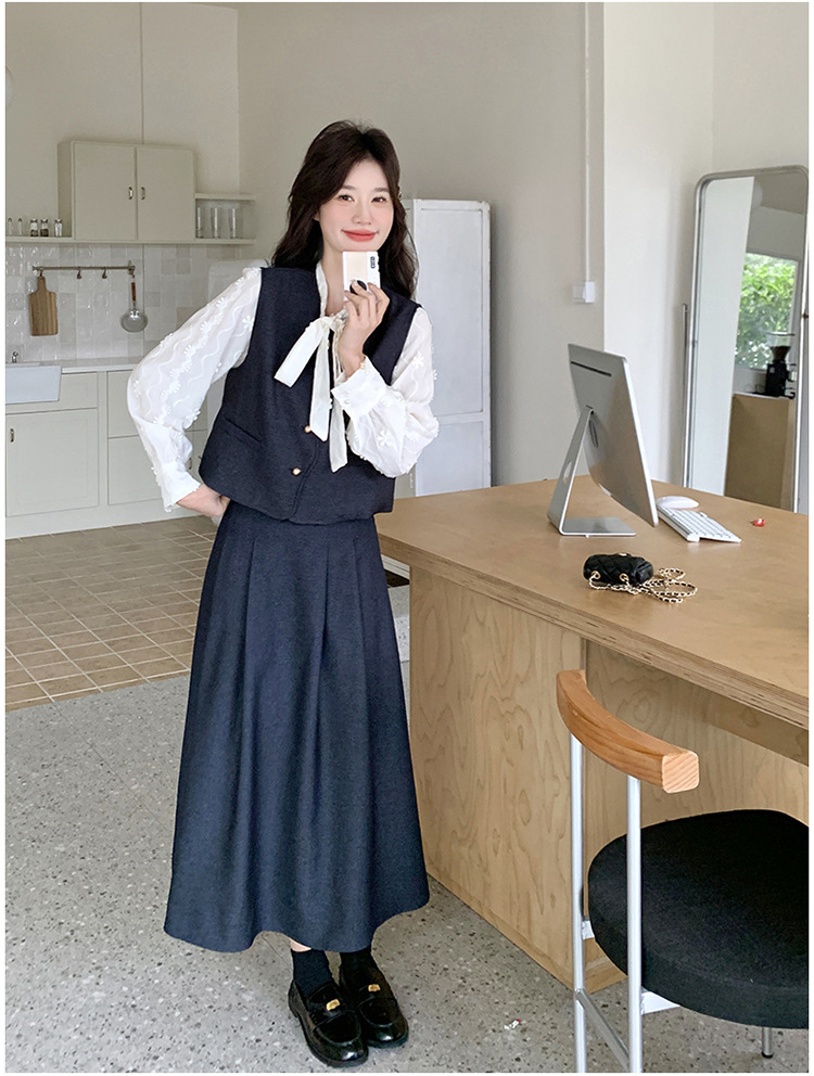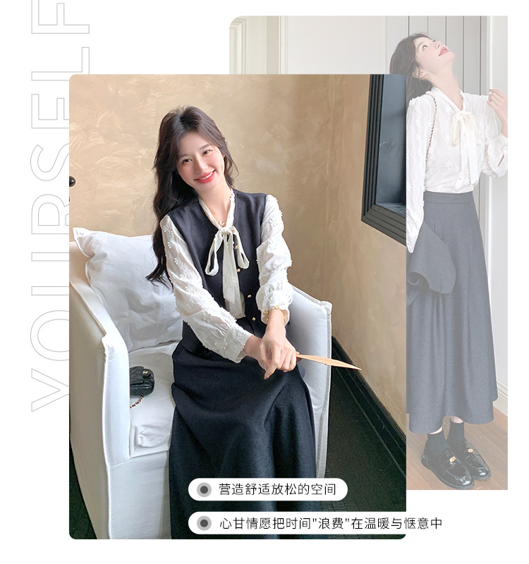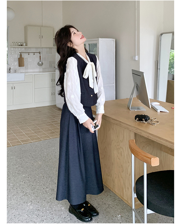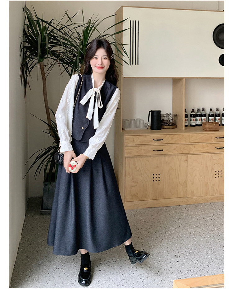 [Mengmei] 25 봄 느낌 Fa Xiaoxiang 스타일 활 셔츠 조끼 스커트 3 종 세트 여성 고급 세트