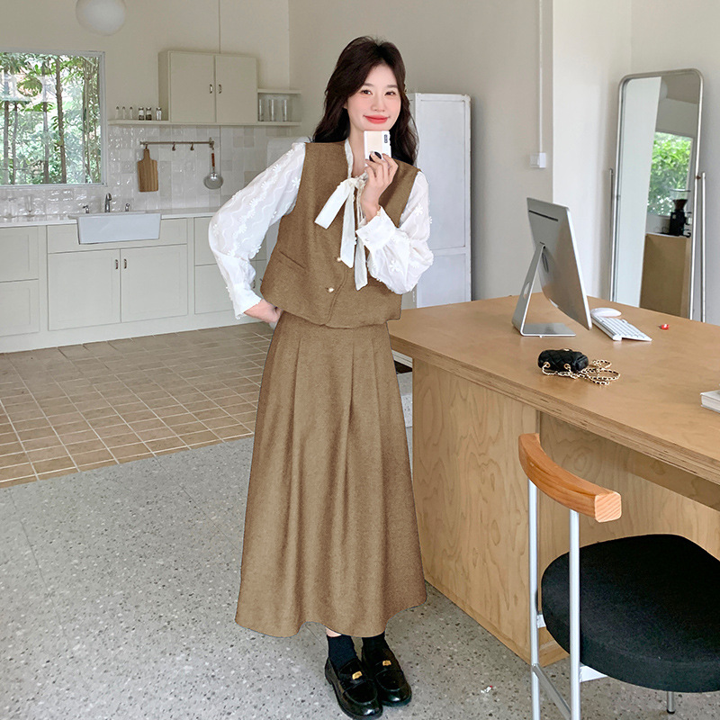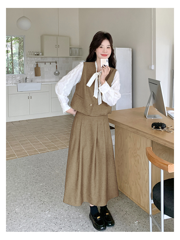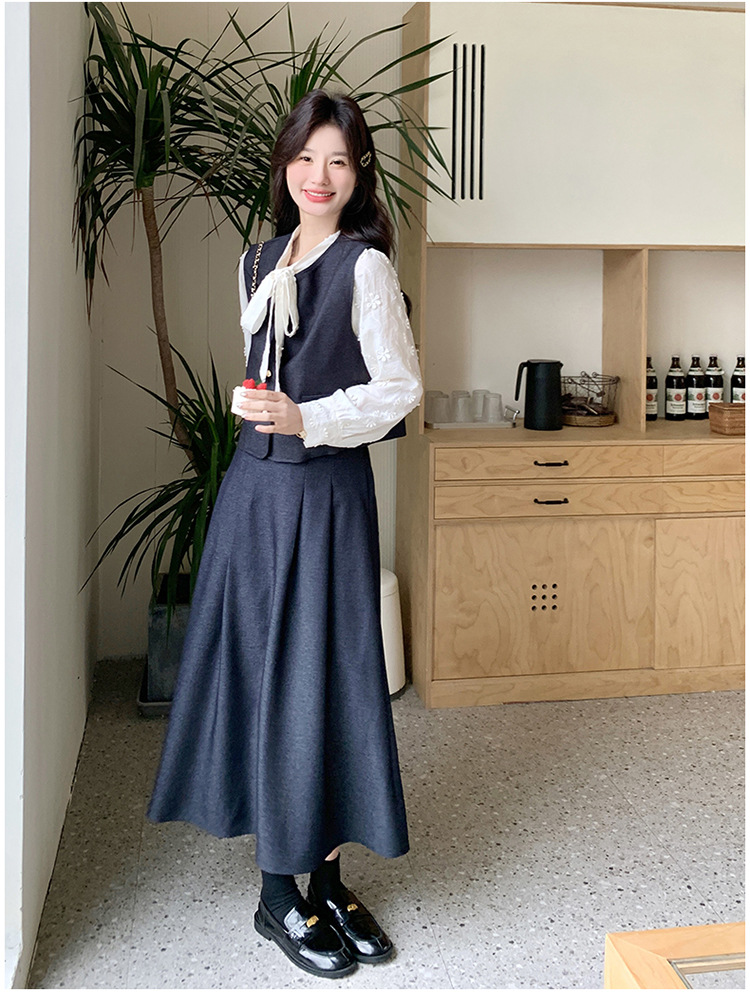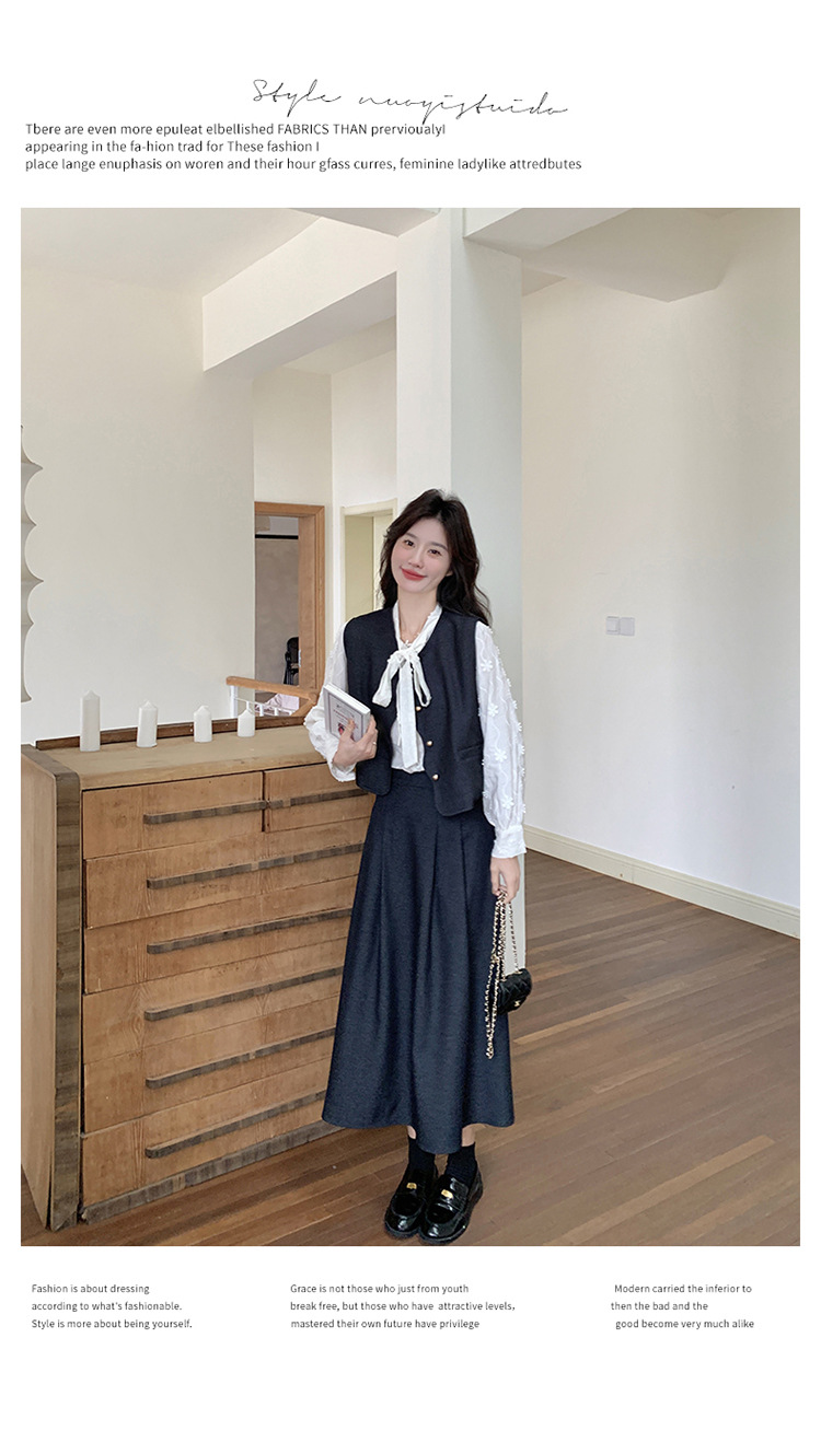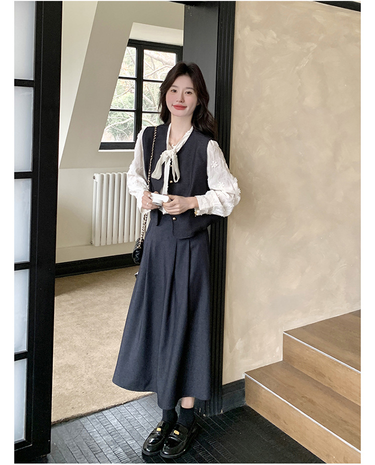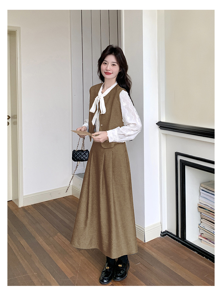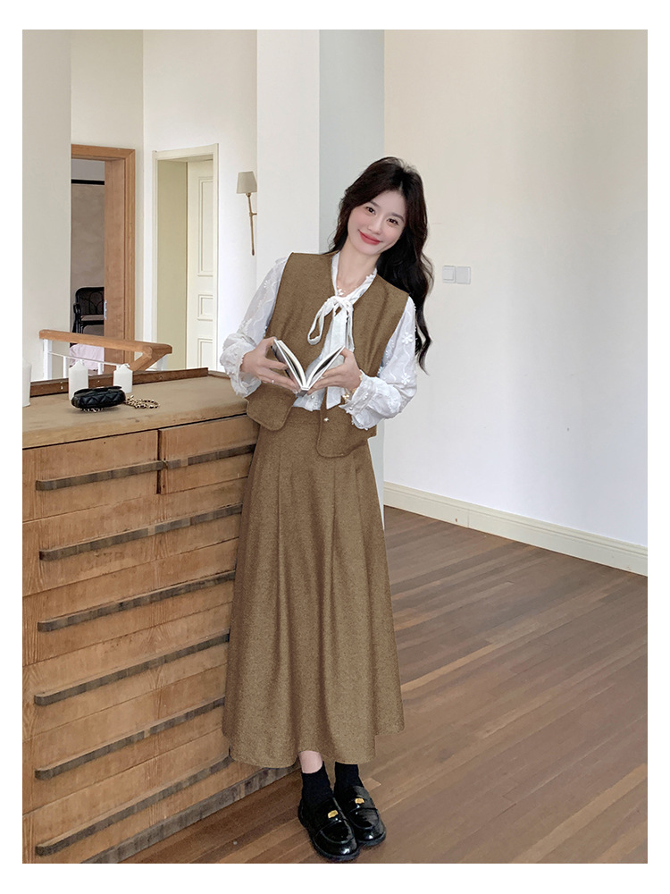 [Mengmei] 25 봄 느낌 Fa Xiaoxiang 스타일 활 셔츠 조끼 스커트 3 종 세트 여성 고급 세트