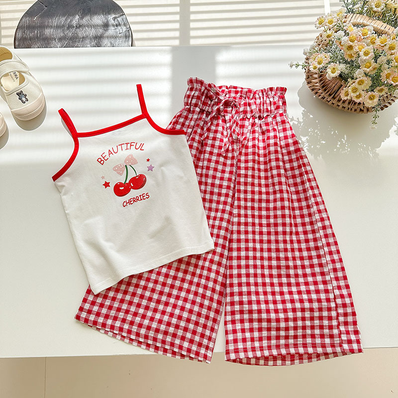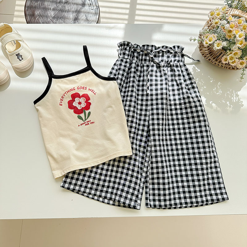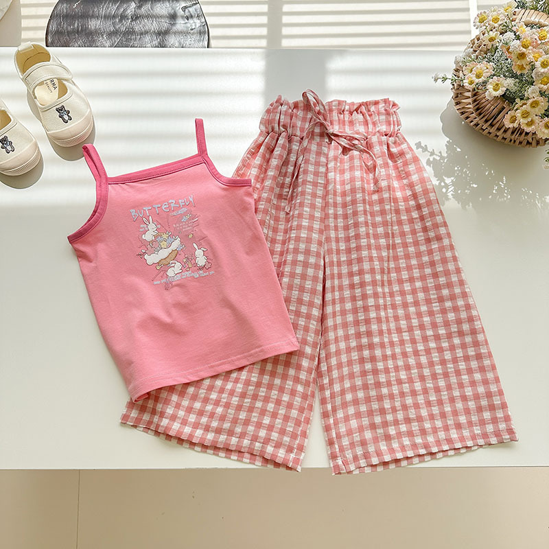 소녀 여름 세트 슬링 조끼 티셔츠 달콤한 소프트 코튼 넓은 다리 바지 아기 소녀 활 격자 바지