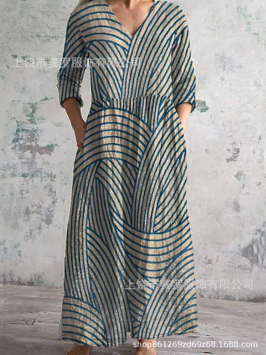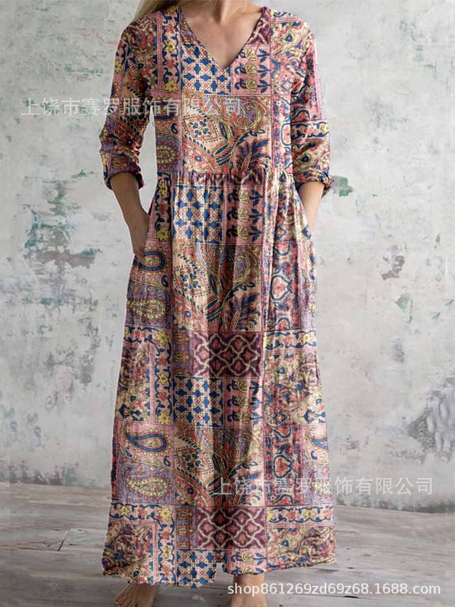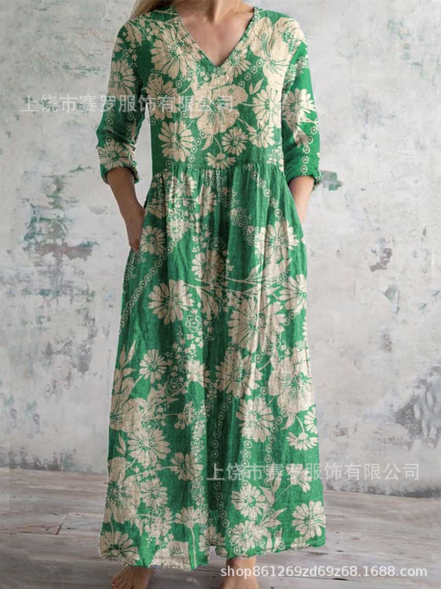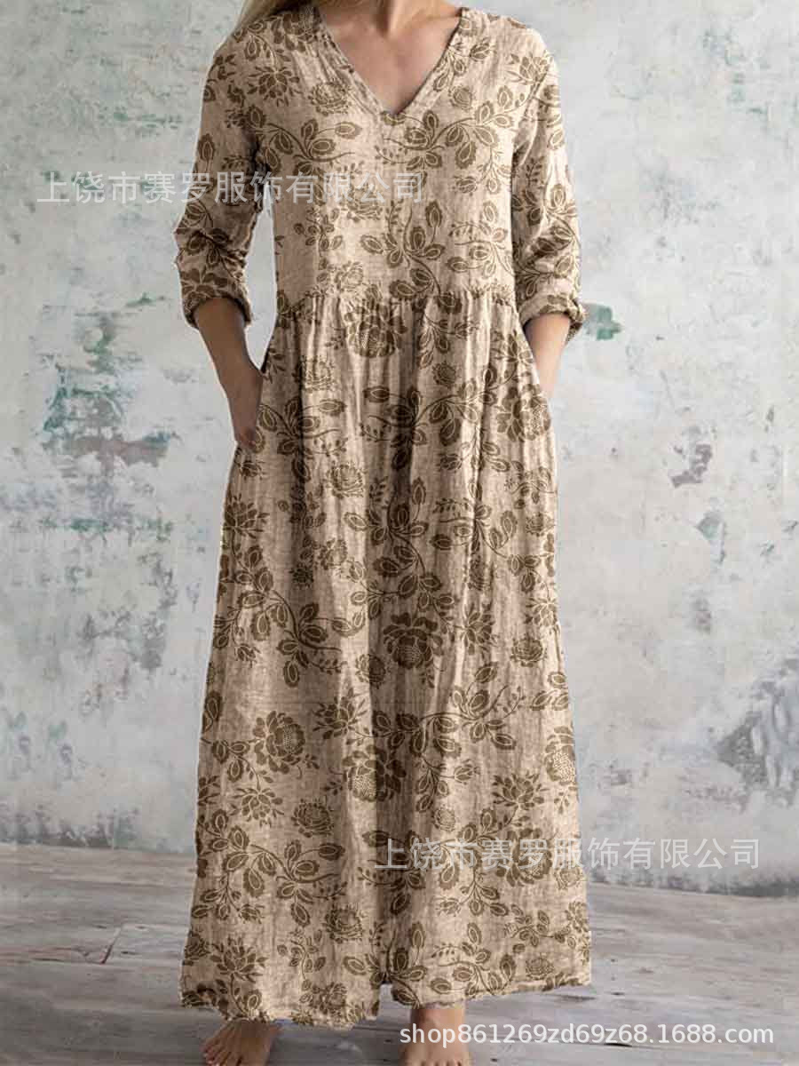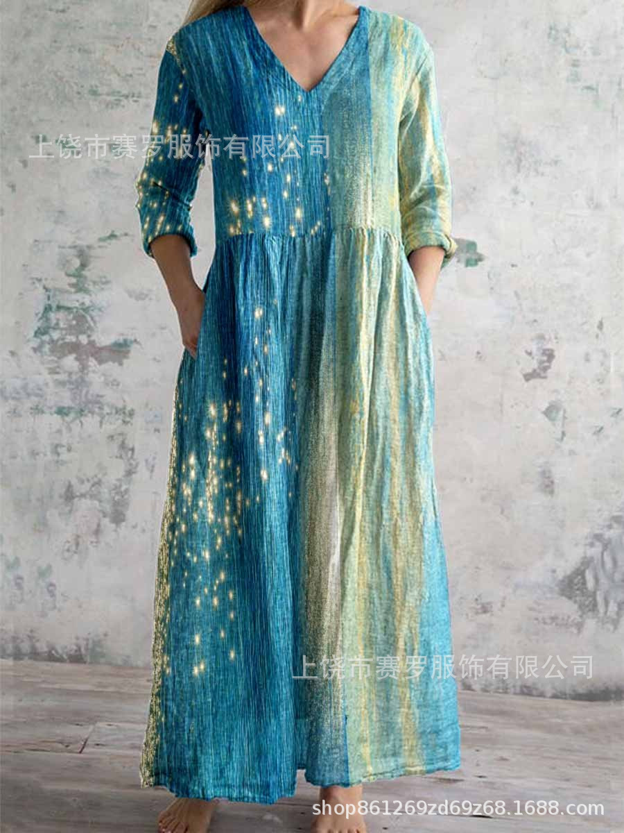 아마존 국경 2025 여름 새로운 유럽과 미국 여성의 느슨한 패션 하이 엔드 V 넥 인쇄 원피스