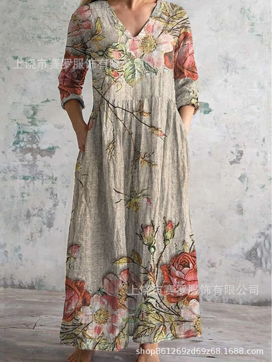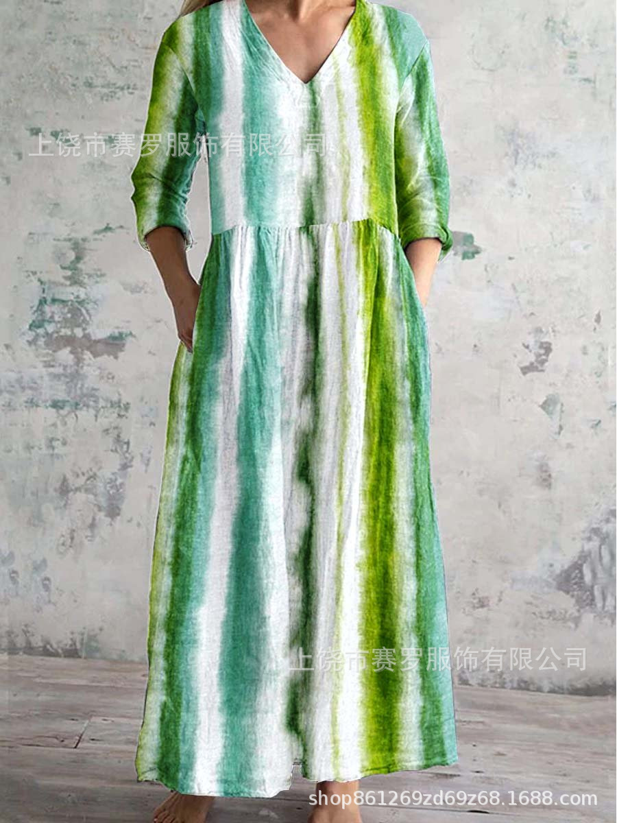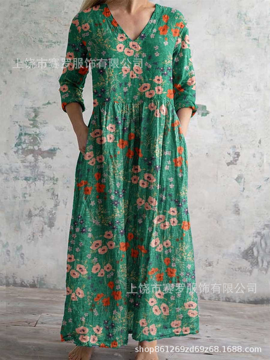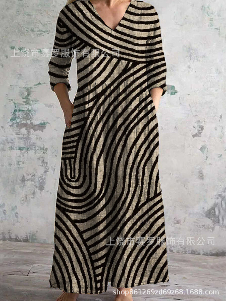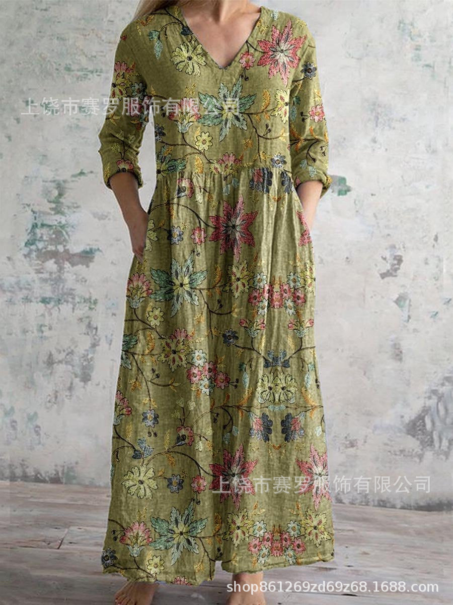 아마존 국경 2025 여름 새로운 유럽과 미국 여성의 느슨한 패션 하이 엔드 V 넥 인쇄 원피스