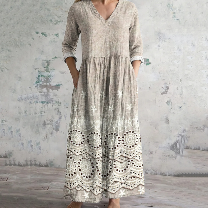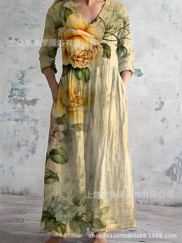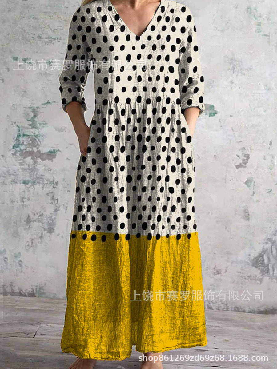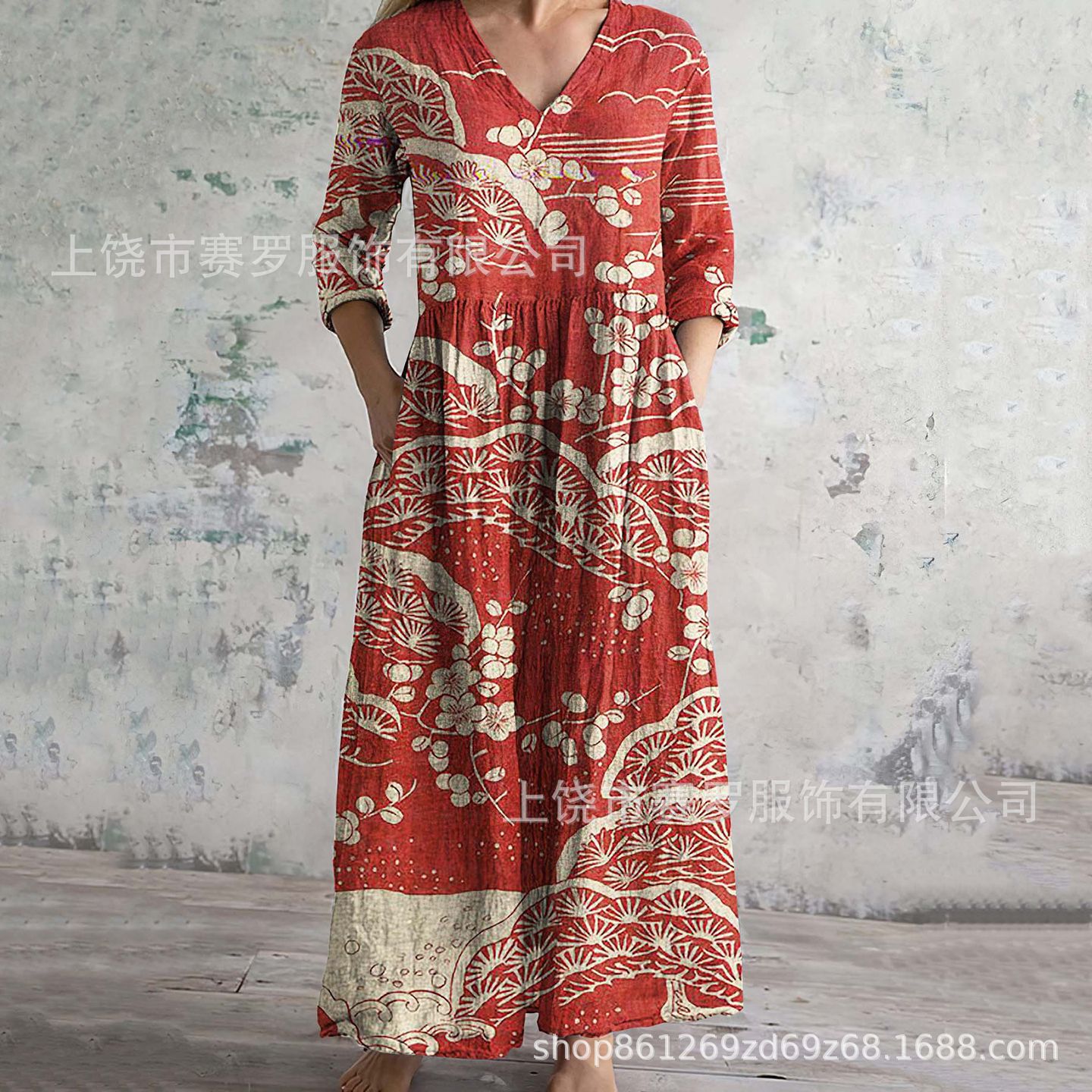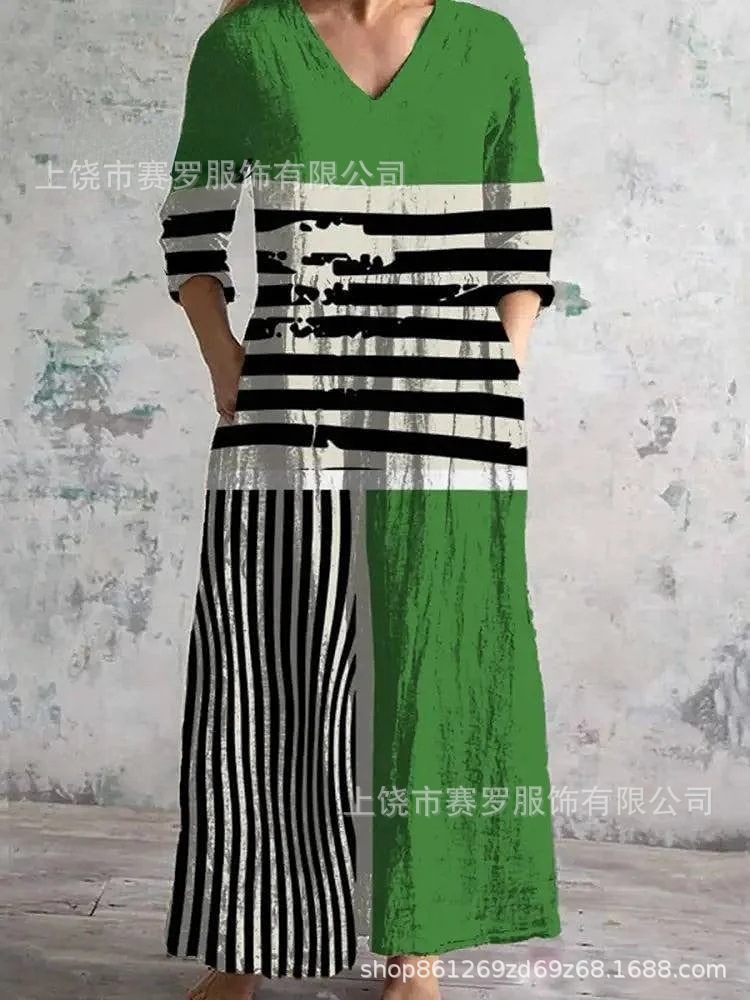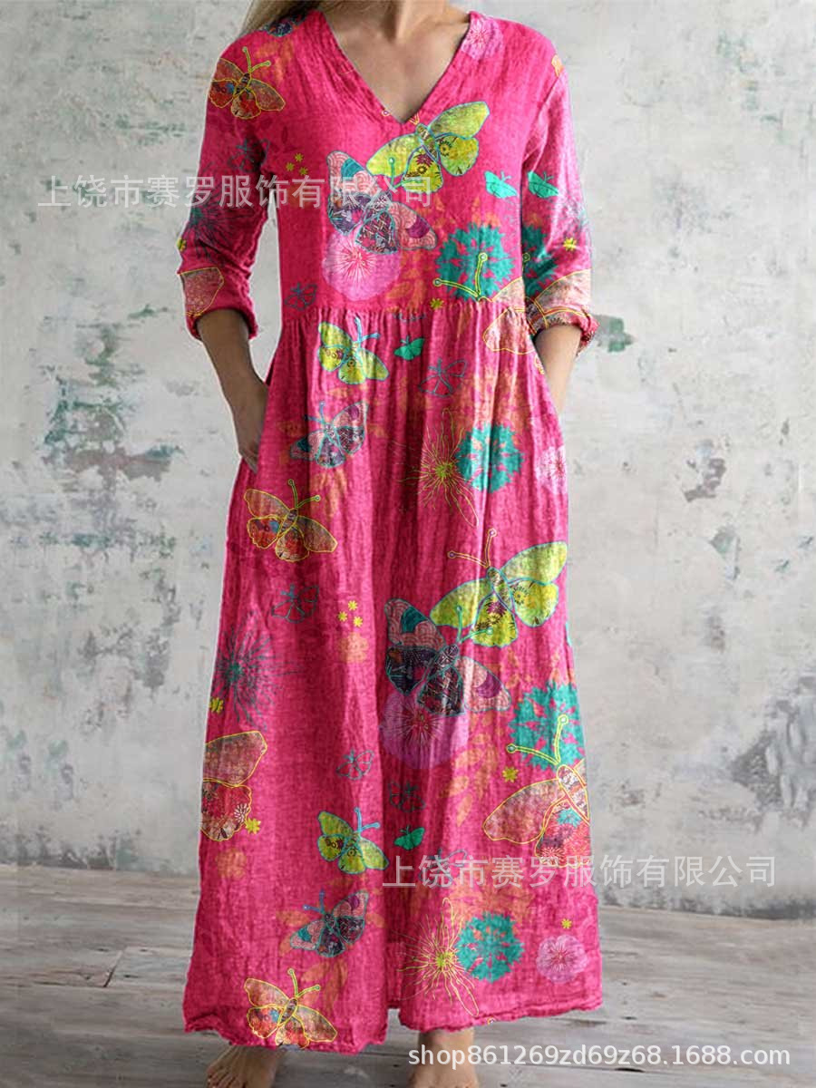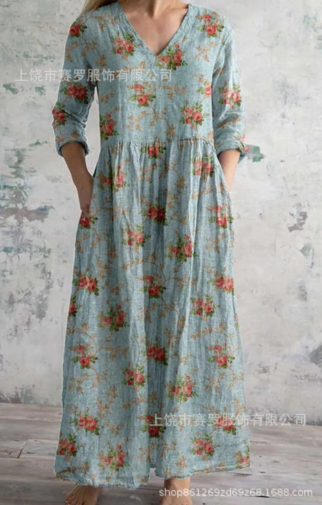 아마존 국경 2025 여름 새로운 유럽과 미국 여성의 느슨한 패션 하이 엔드 V 넥 인쇄 원피스