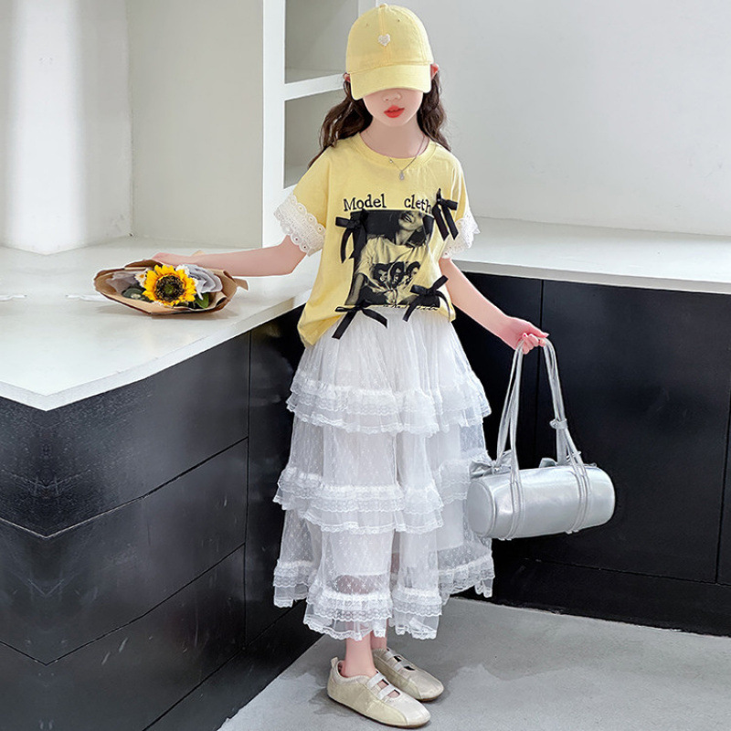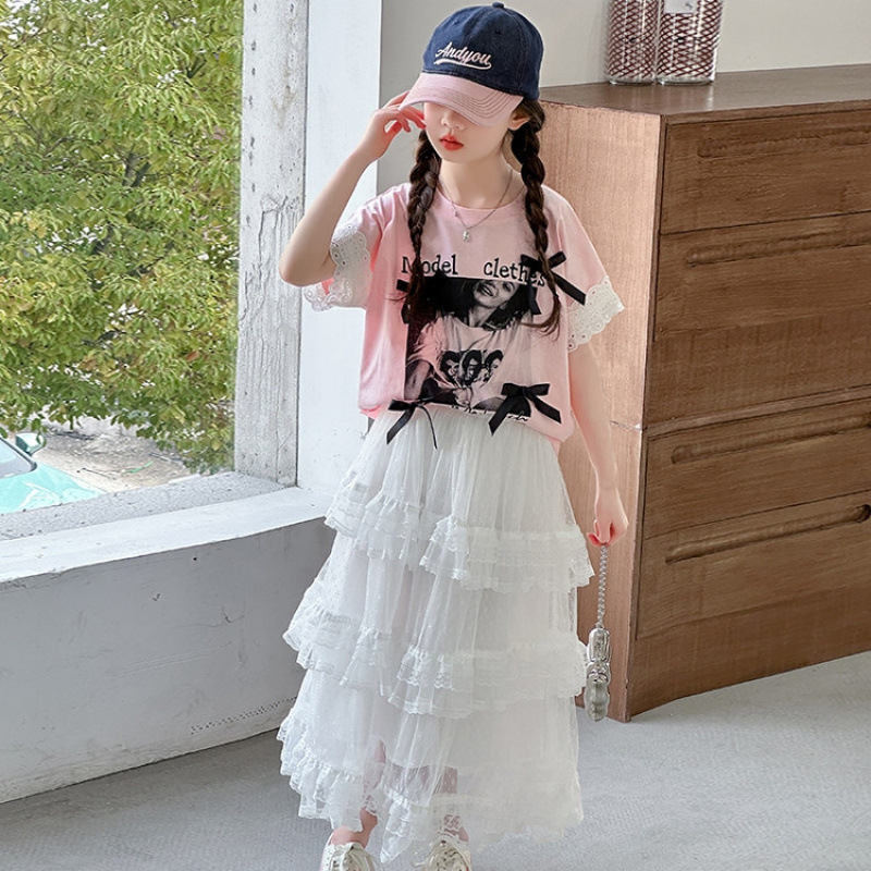 소녀 여름 반팔 케이크 치마 세트 2025 새로운 스타일 소녀 달콤한 스타일릭 스커트 레이스 셔츠 투피스 세트스토어 가기
