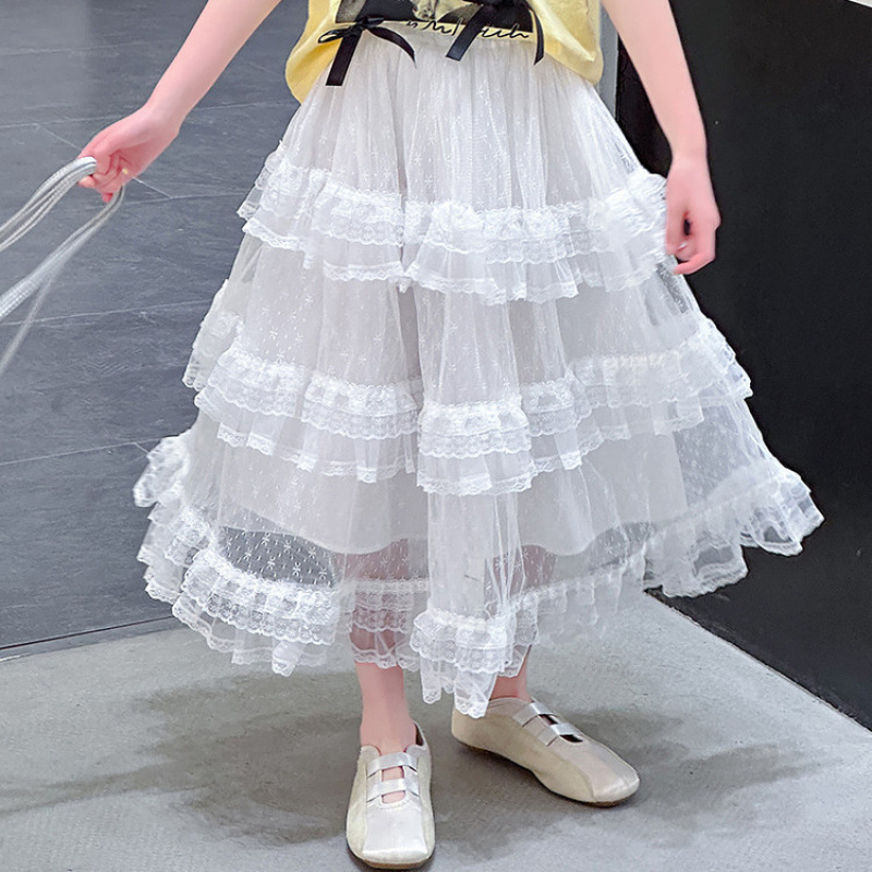 소녀 여름 반팔 케이크 치마 세트 2025 새로운 스타일 소녀 달콤한 스타일릭 스커트 레이스 셔츠 투피스 세트