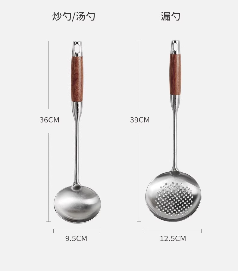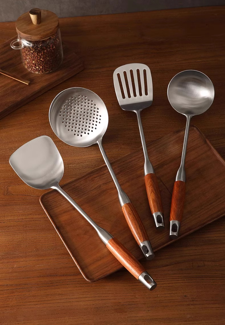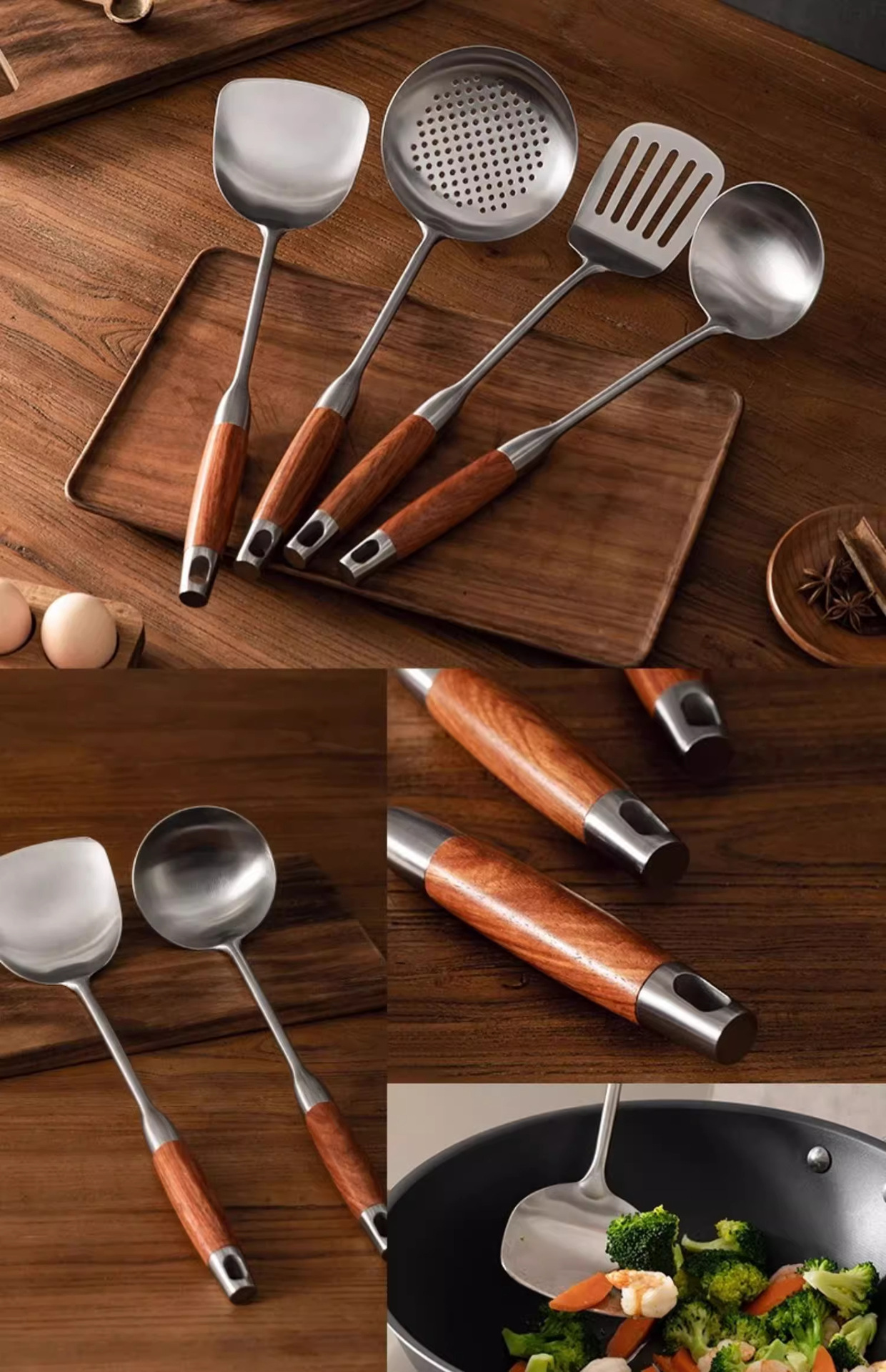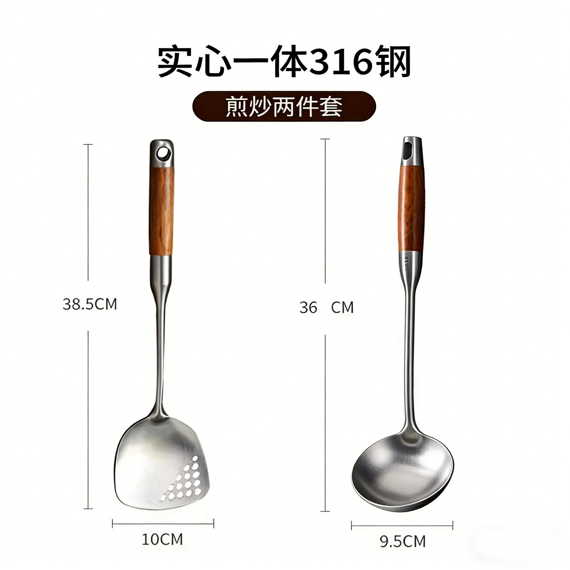 식품 등급 316 스테인레스 스틸 주걱 두껍게 한 조각 성형 가정용 나무 손잡이 안티 scald 주방 볶음 주걱 세트