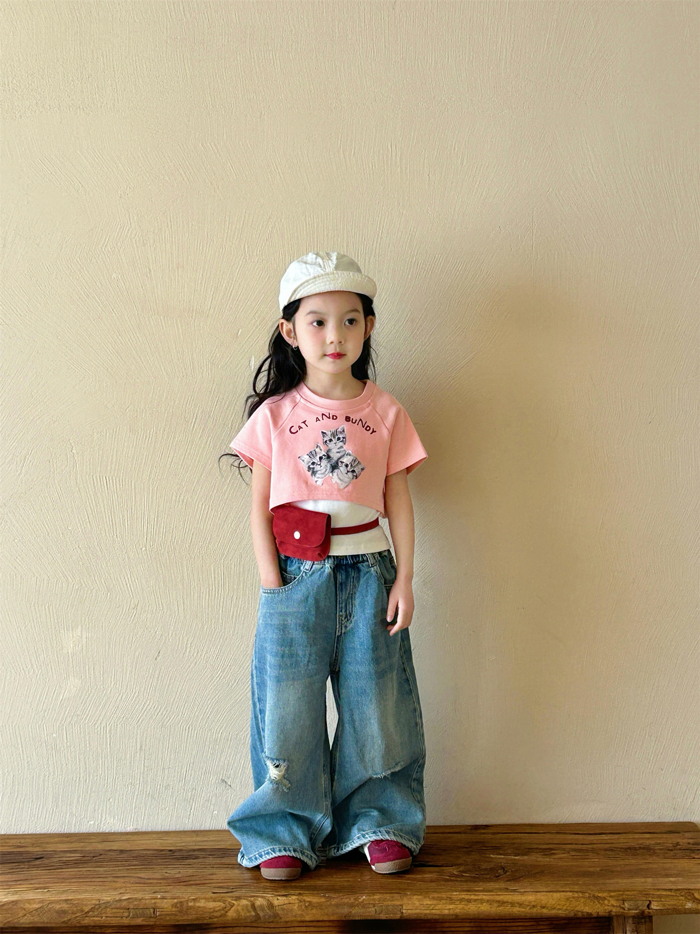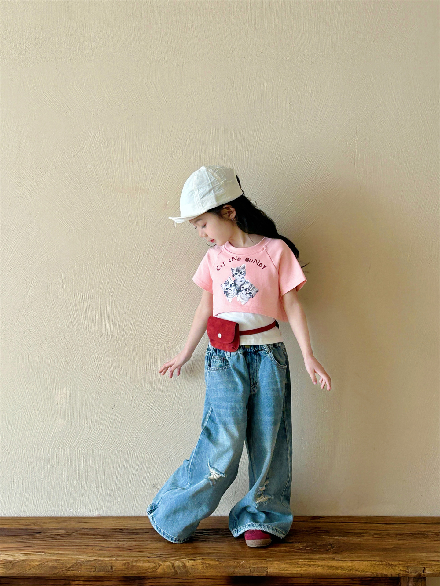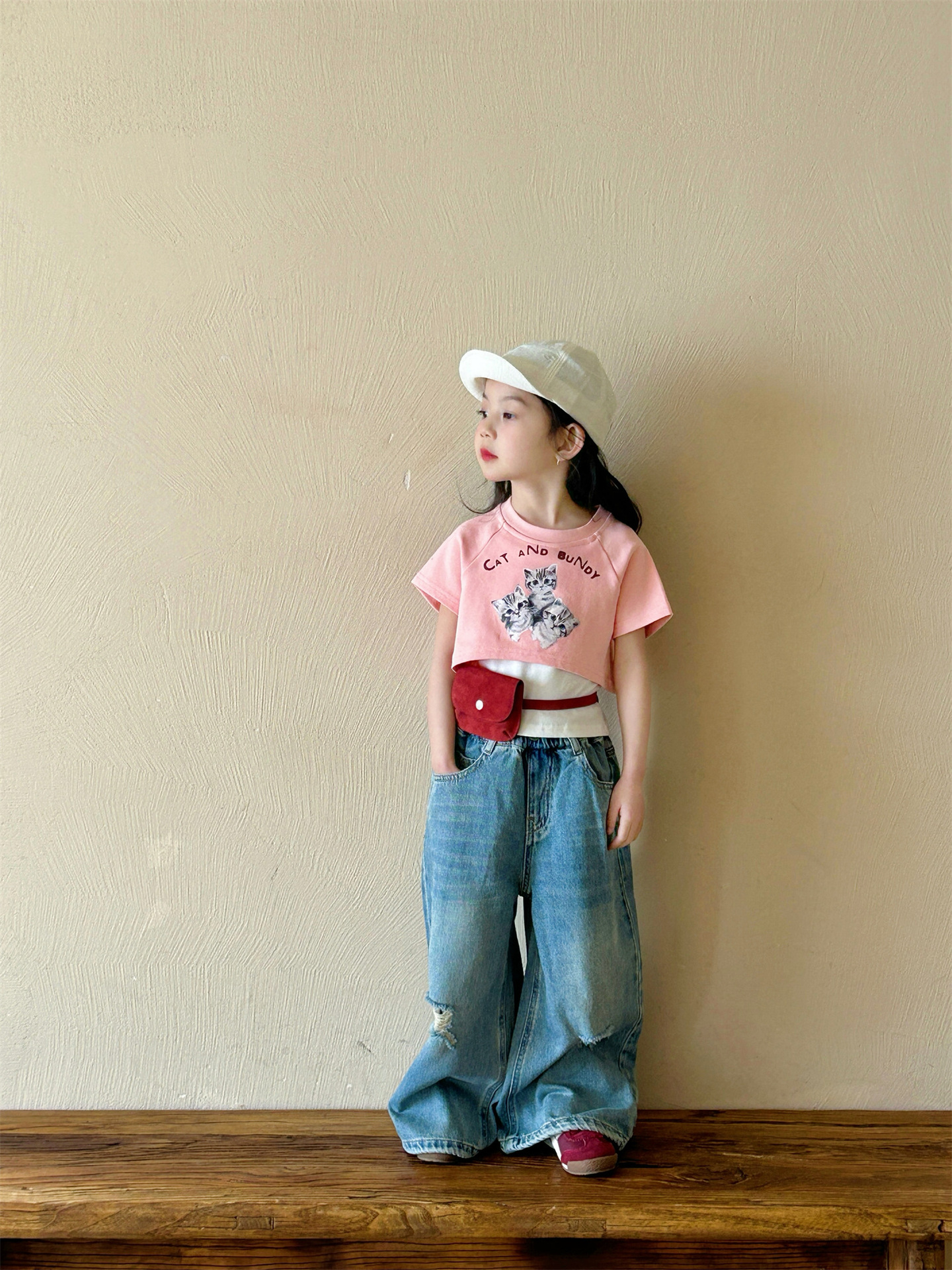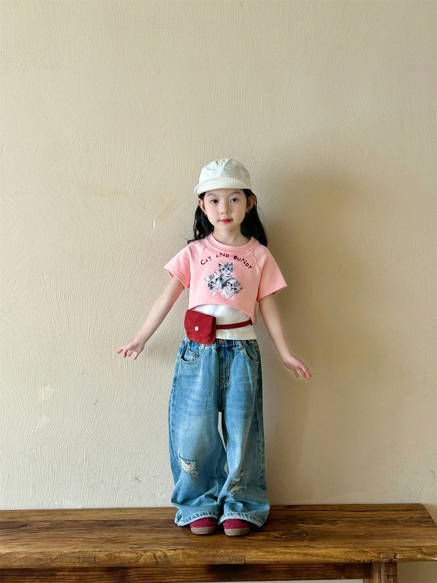 2025 여름 새 소녀의 서양식 만화 새끼 고양이 가짜 투피스 반팔 티셔츠 리핑 청바지 투피스 세트