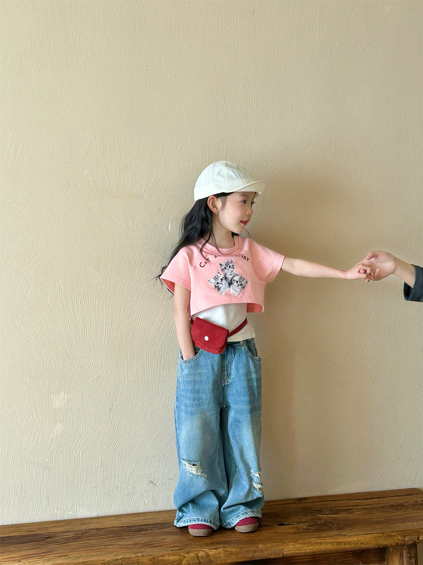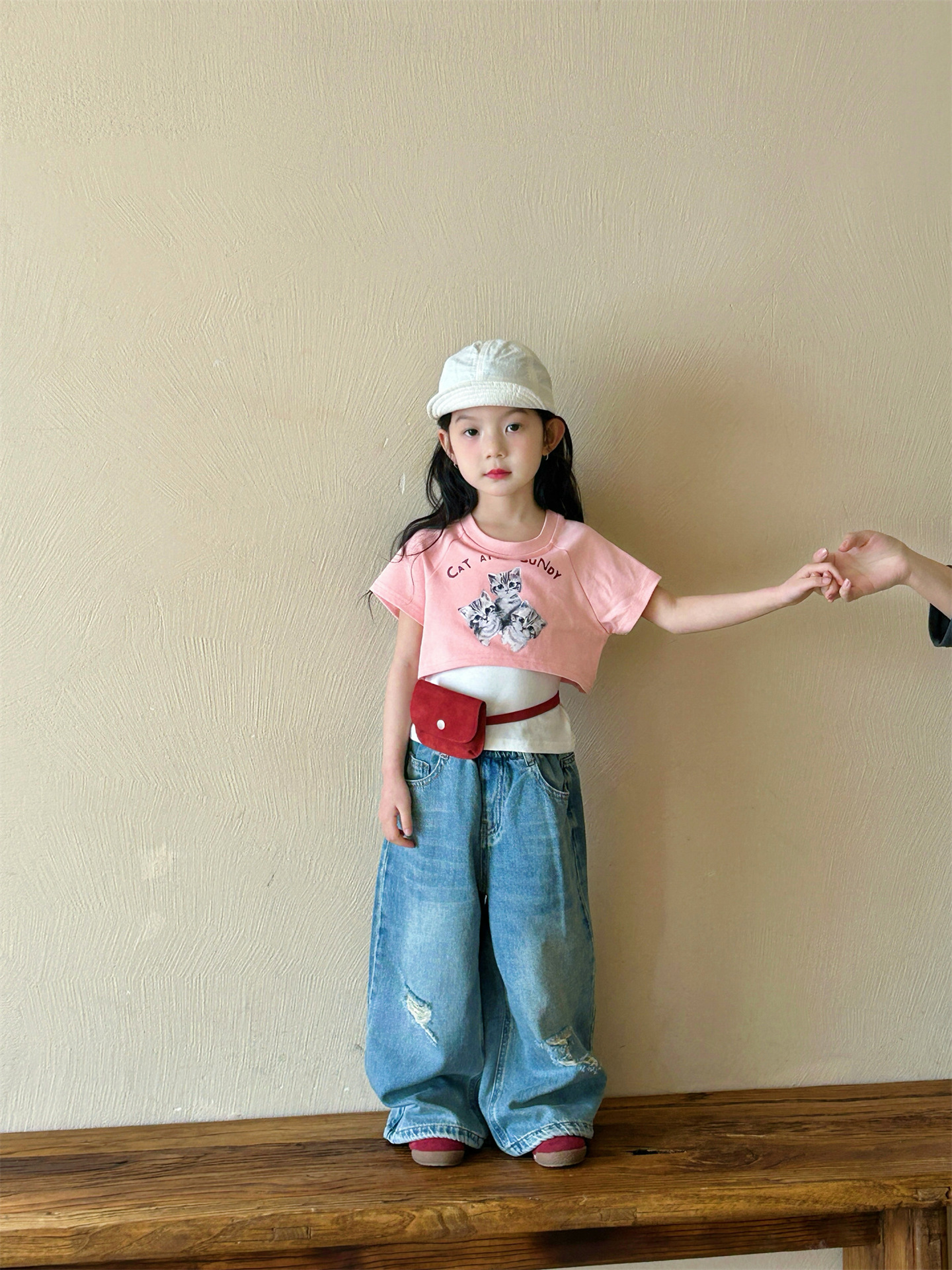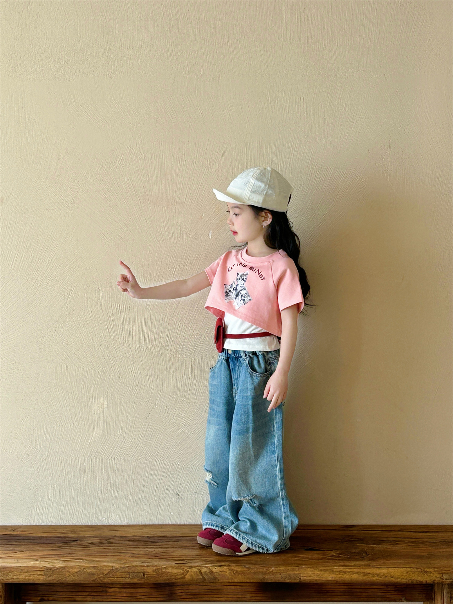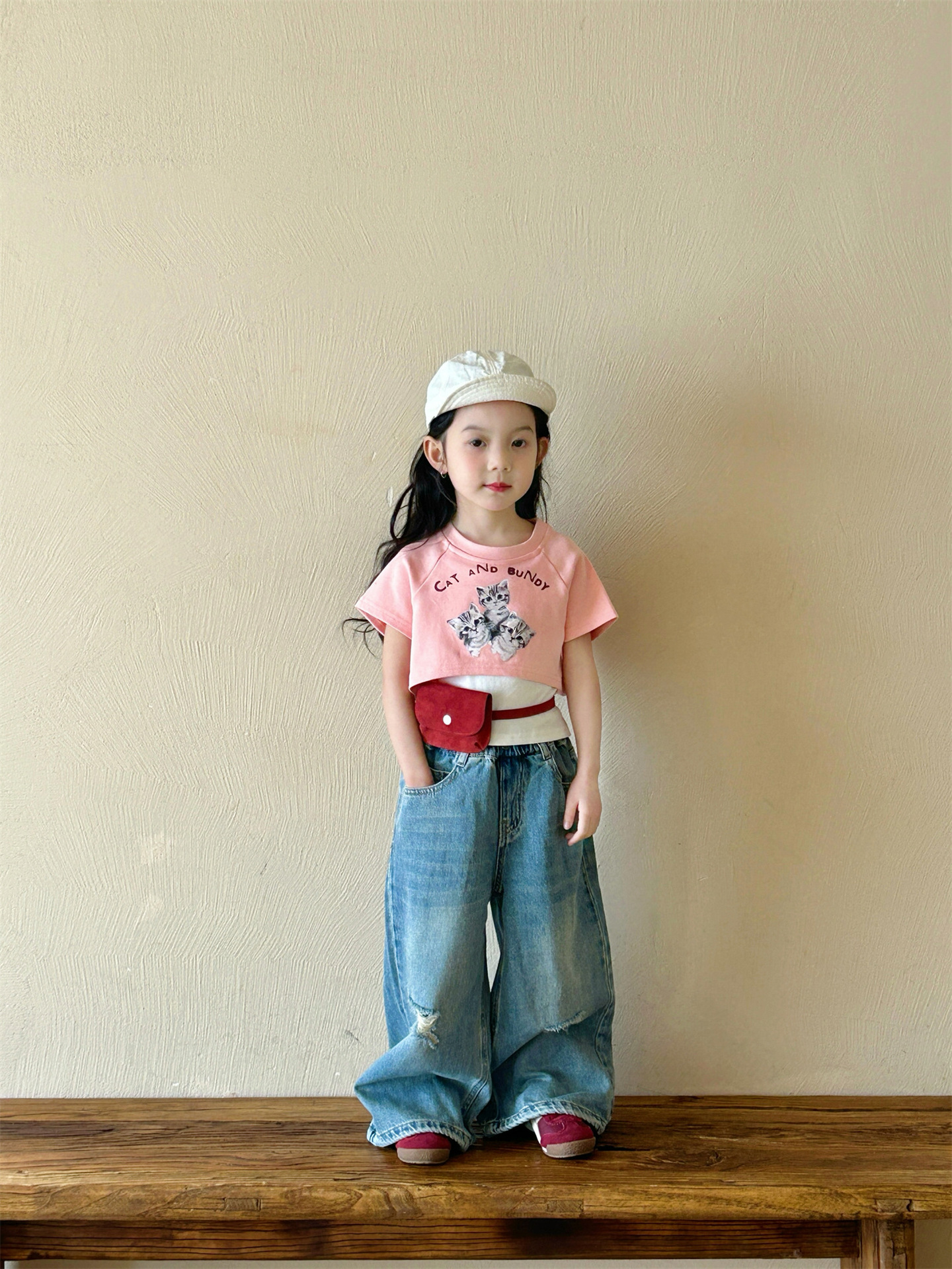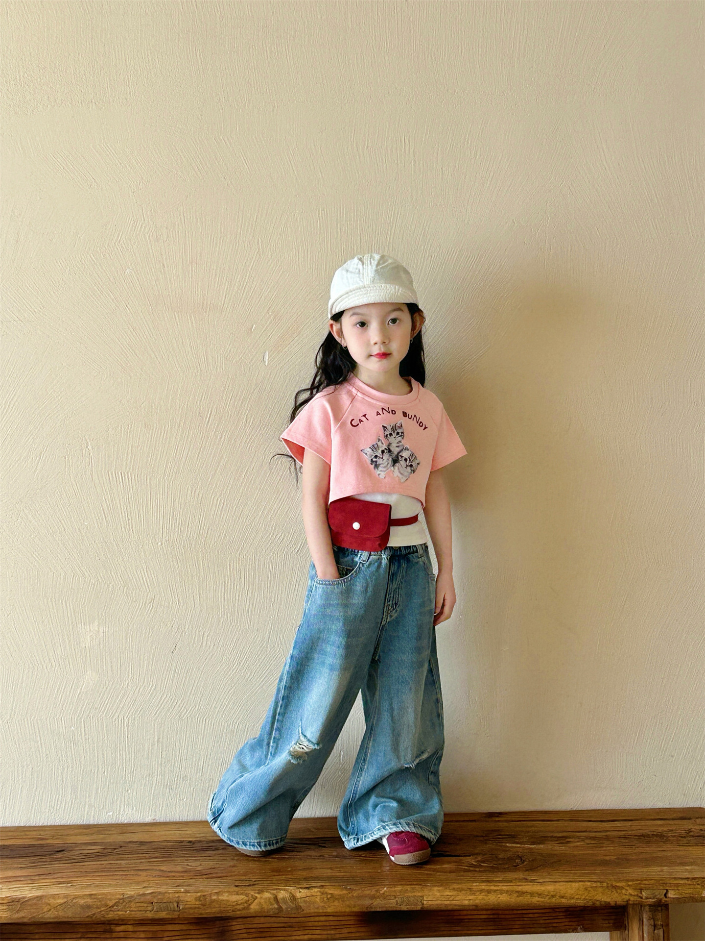 2025 여름 새 소녀의 서양식 만화 새끼 고양이 가짜 투피스 반팔 티셔츠 리핑 청바지 투피스 세트
